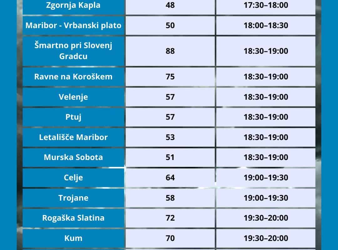 Kot so sporočili iz uprave, je do izrednih dogodkov prišlo na območjih občin Apače, Benedikt, Celje, Cerkvenjak, Črenšovci, Črna na Koroškem, Dravograd, Duplek, Gornja Radgona, Gorišnica, Grosuplje, Ivančna Gorica, Juršinci, Križevci, Kungota, Laško, Lenart, Litija, Ljutomer, Maribor, Ormož, Pesnica, Prevalje, Radeče, Radenci, Ravne na Koroškem, Razkrižje, Rogašovci, Semič, Slovenj Gradec, Slovenska Bistrica, Sveta Trojica v Slovenskih goricah, Sveta Ana, Sveti Jurij v Slovenskih Goricah, Sveti Jurij ob Ščavnici, Sveti Tomaž, Šentilj, Škofljica, Šoštanj, Trbovlje, Velenje, Veržej, Vojnik in Zagorje ob Savi.