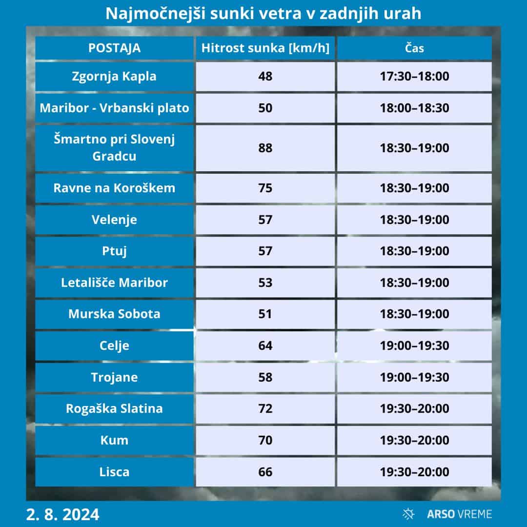 Agencija RS za okolje je že v petek pozno zvečer na družbenih omrežjih objavila, da so izmerili nekaj zelo močnih sunkov vetra, najmočnejše na Koroškem. V Šmartnem pri Slovenj Gradcu je njihova postaja izmerila sunek 88 kilometrov na uro.