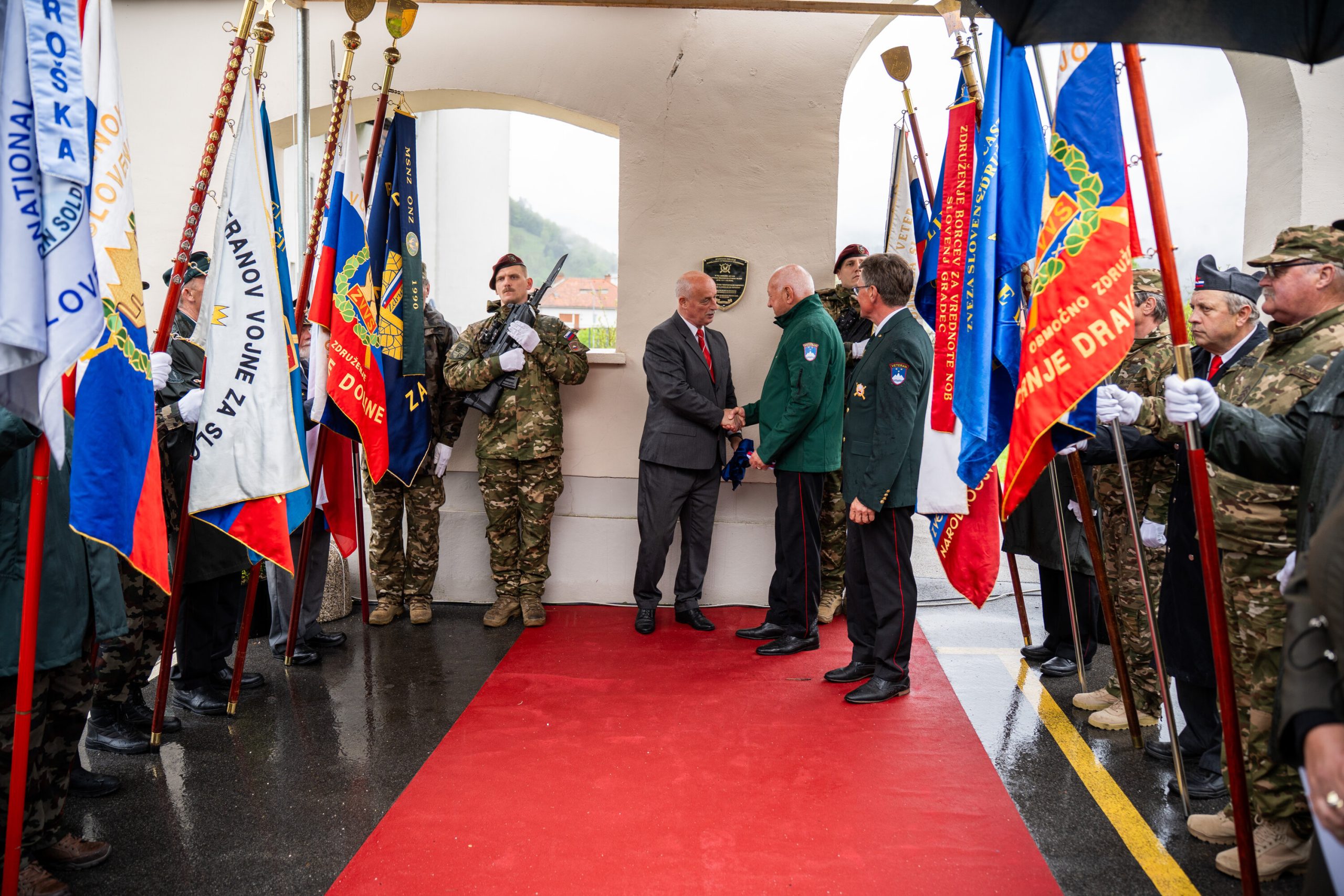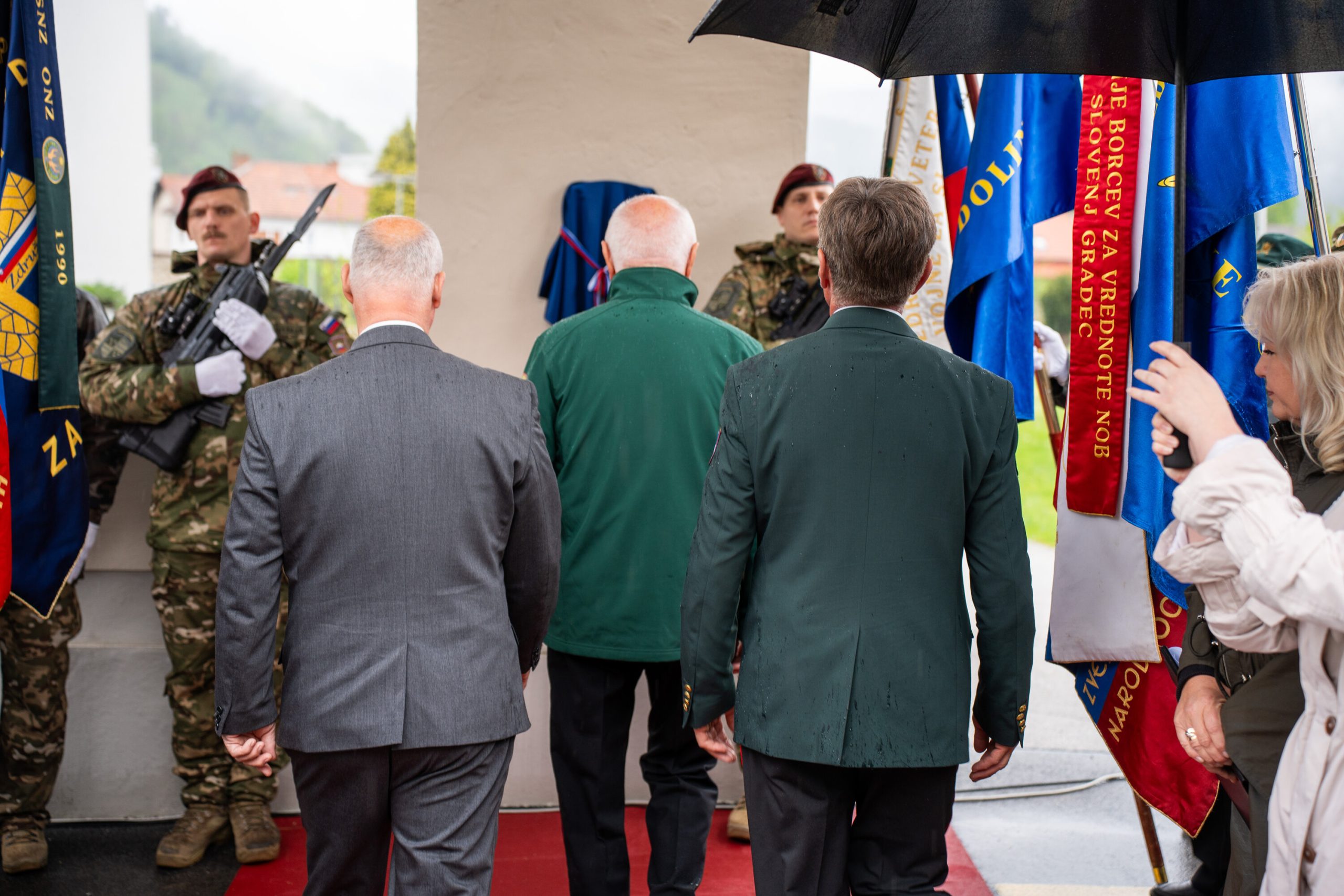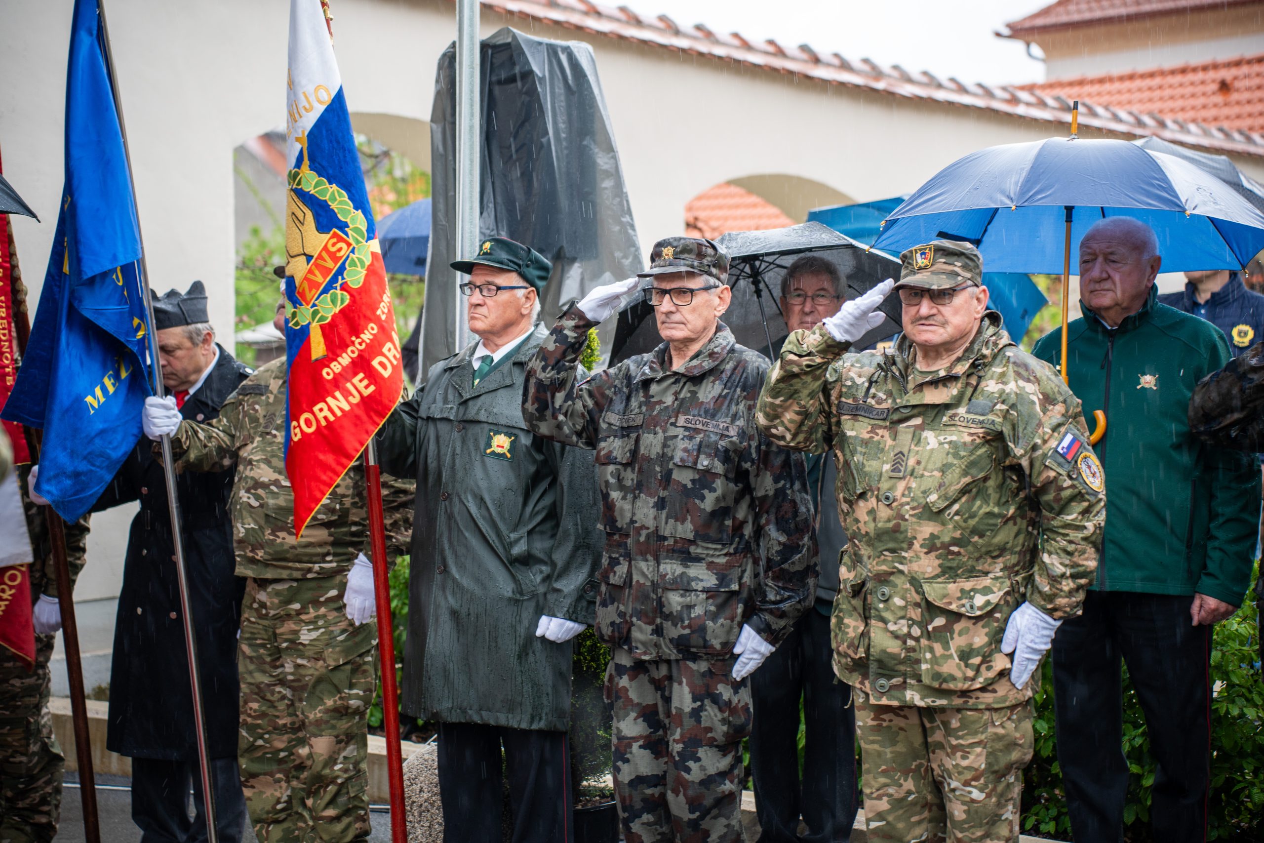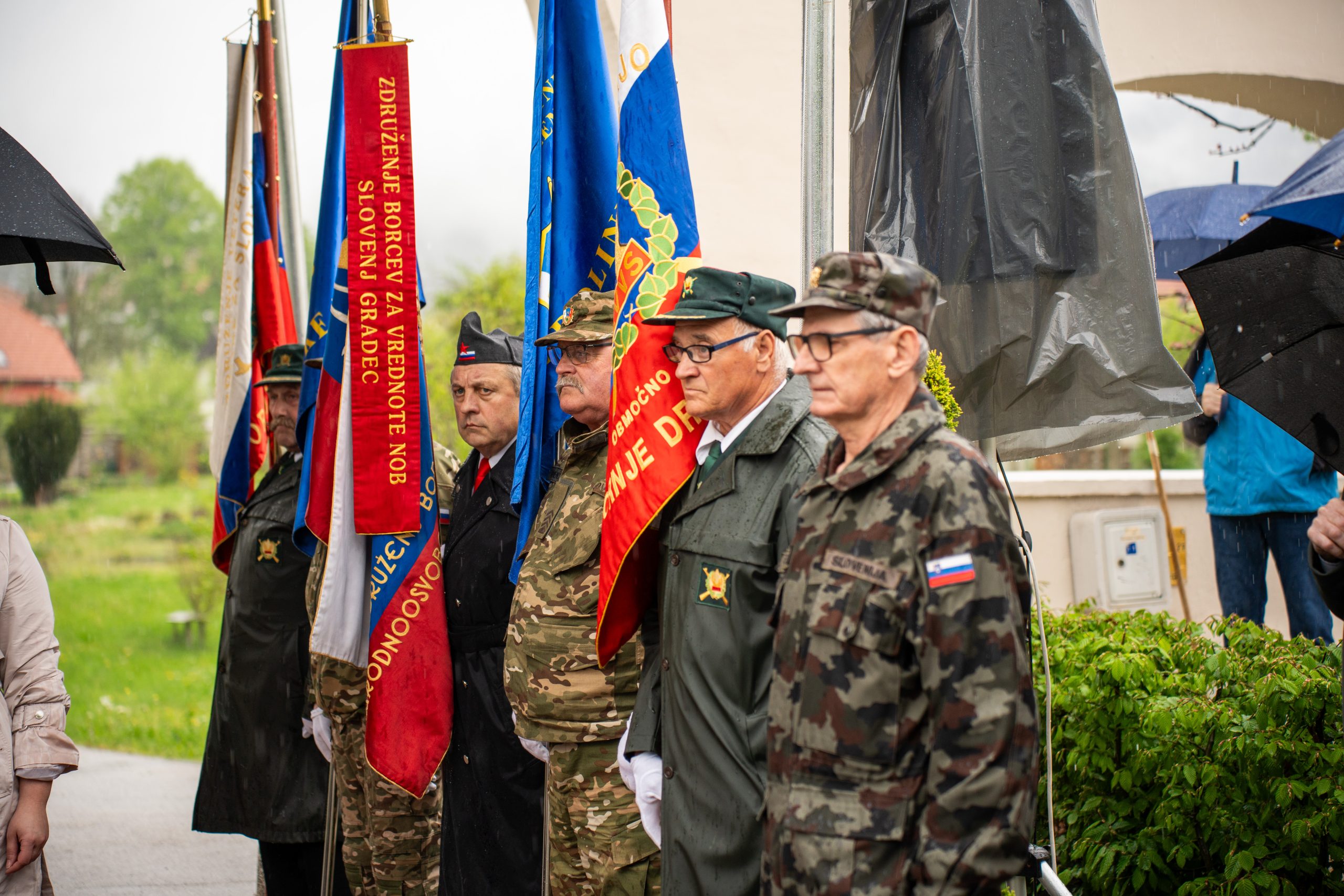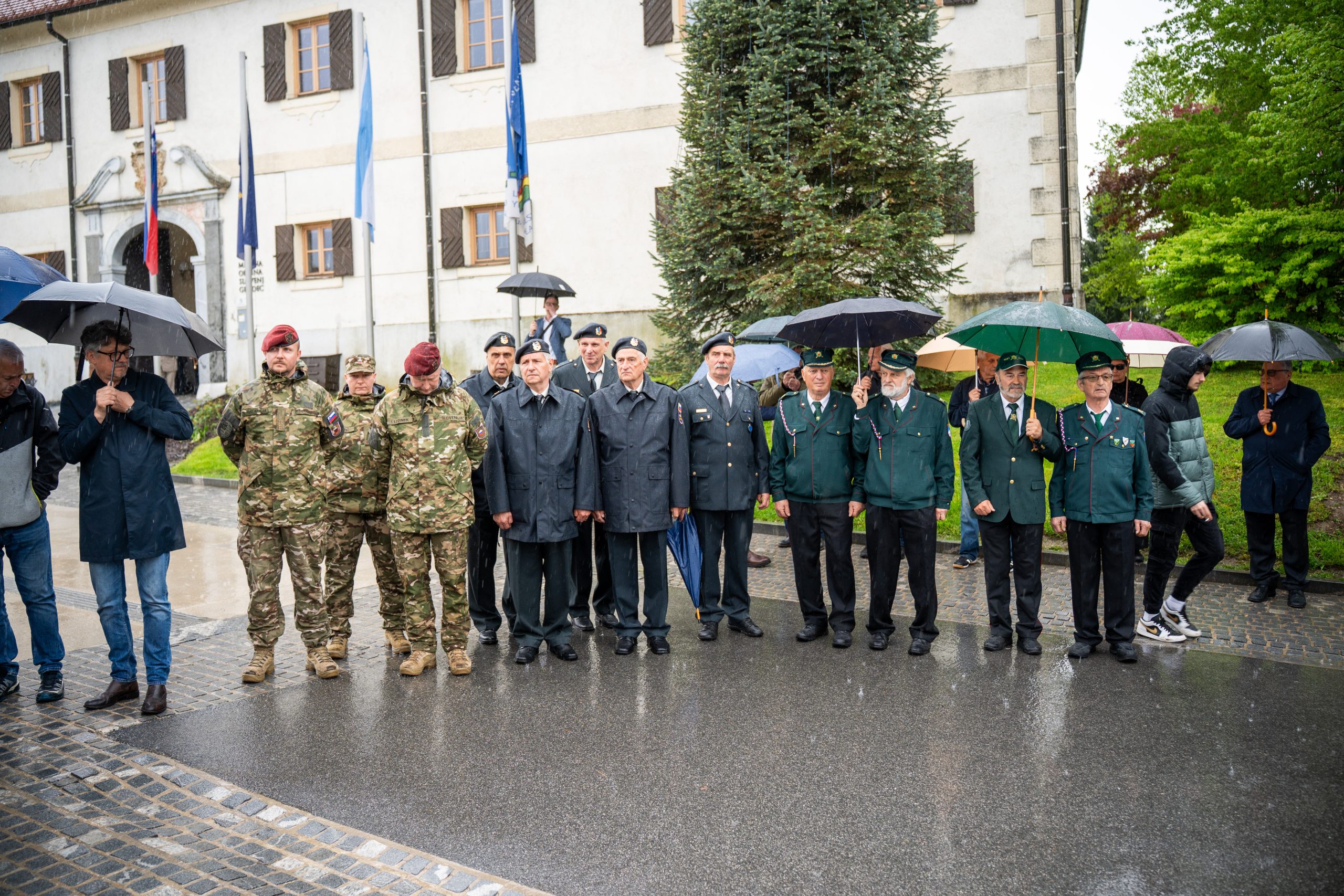 Veteranke in veterani, pripadniki domoljubnih organizacij in drugi obiskovalci so se kljub slabemu vremenu zbrali pred graščino Rotenturn.