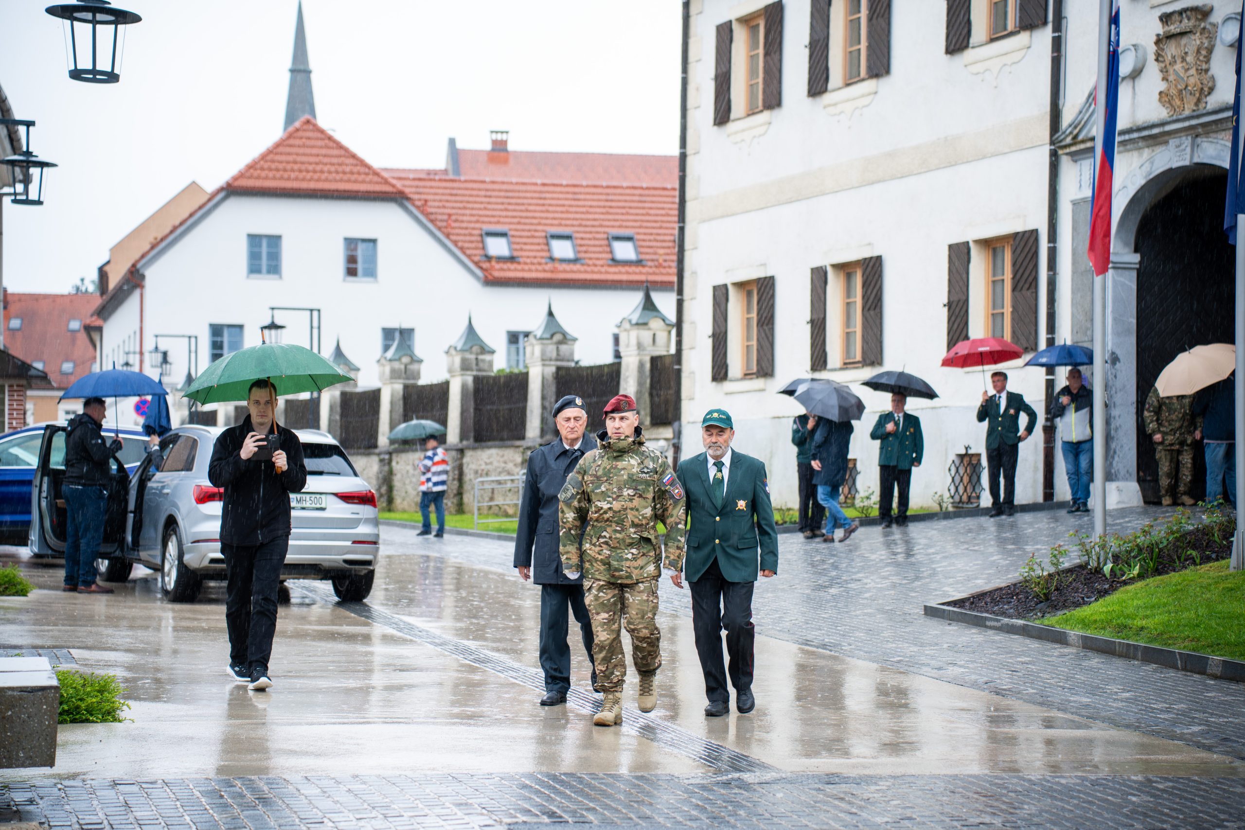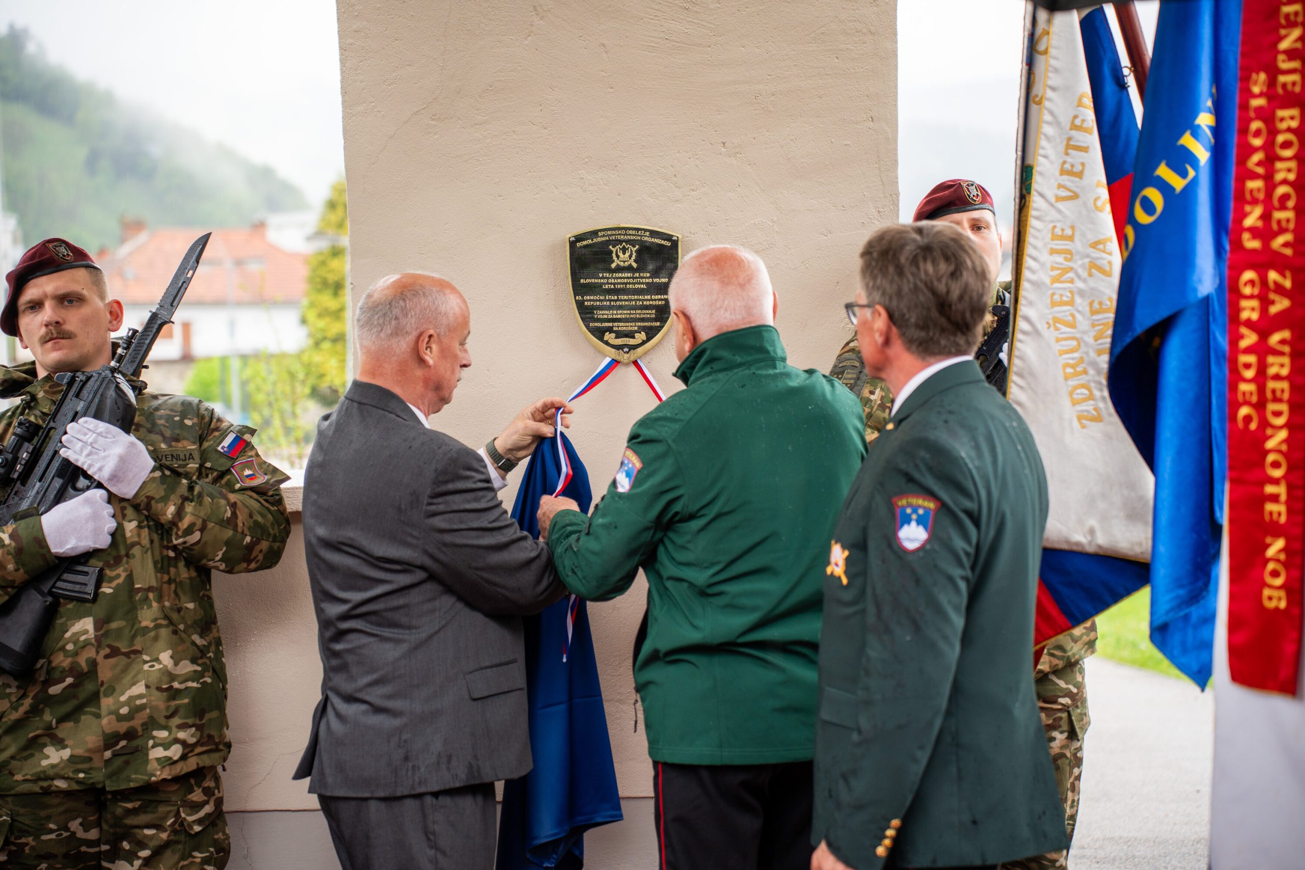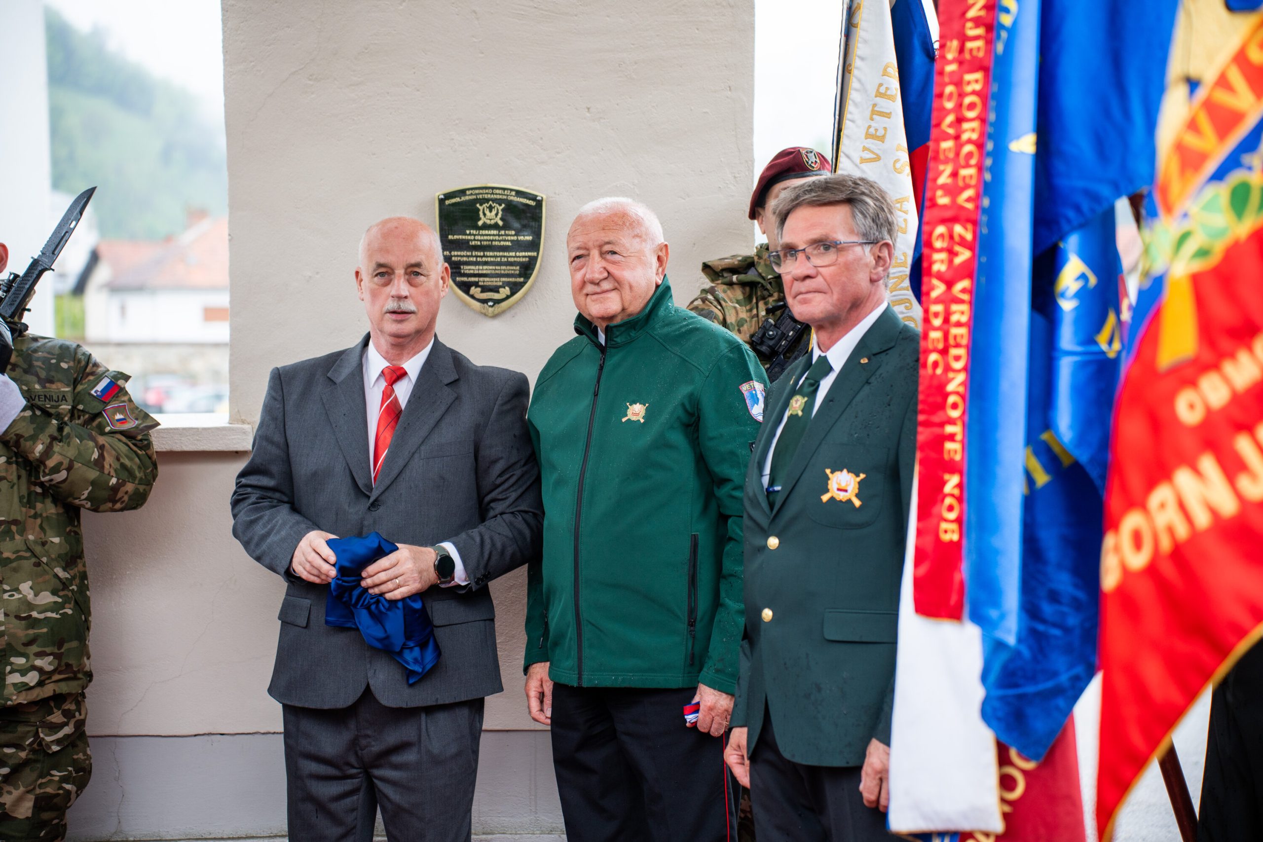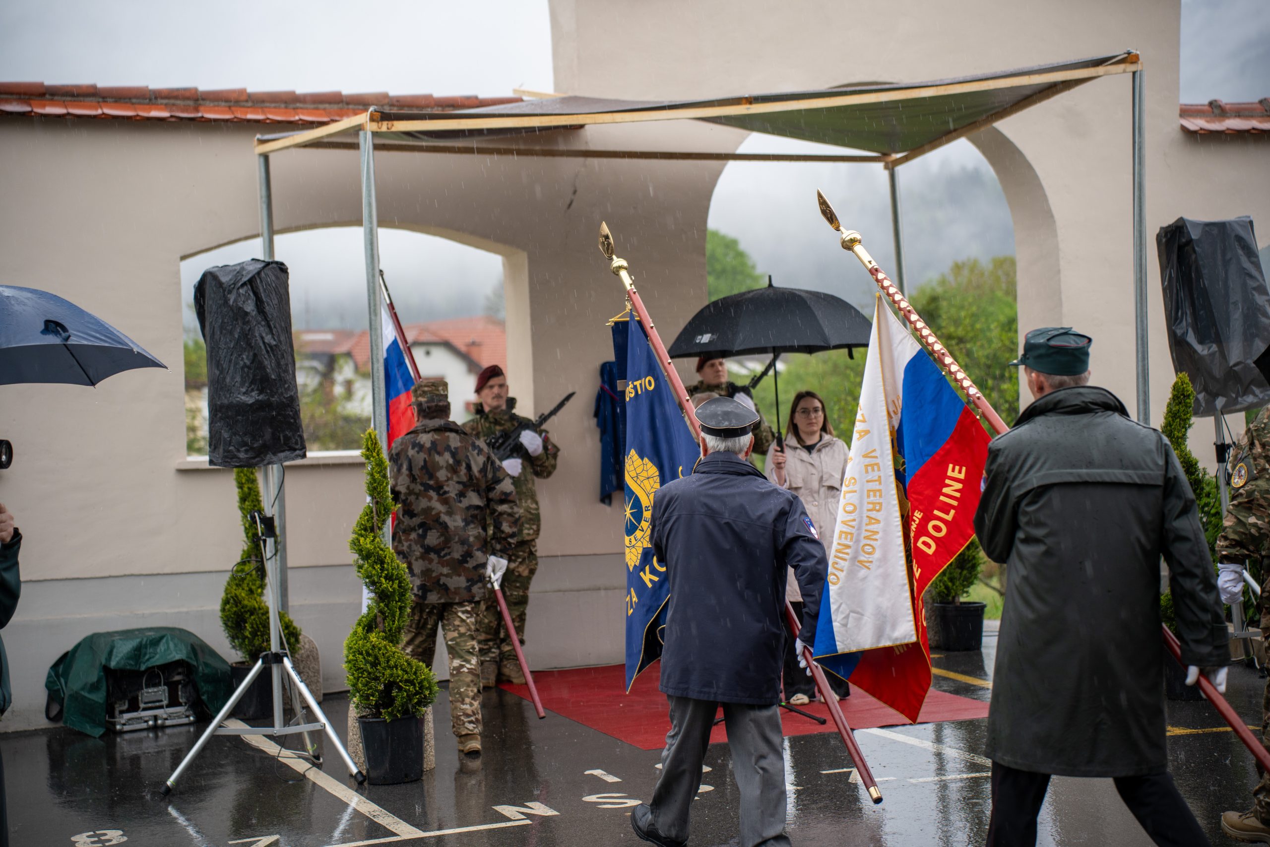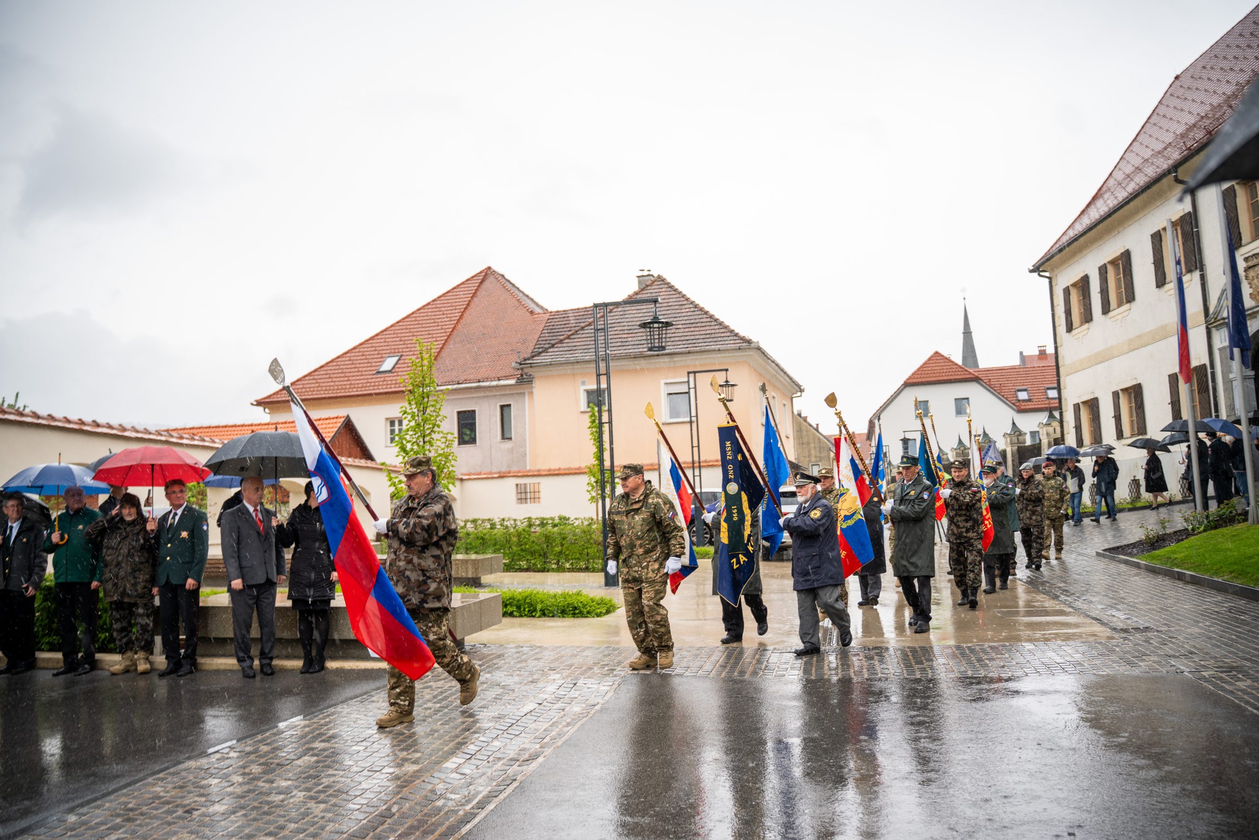 Veteranke in veterani, pripadniki domoljubnih organizacij in drugi obiskovalci so se kljub slabemu vremenu zbrali pred graščino Rotenturn.