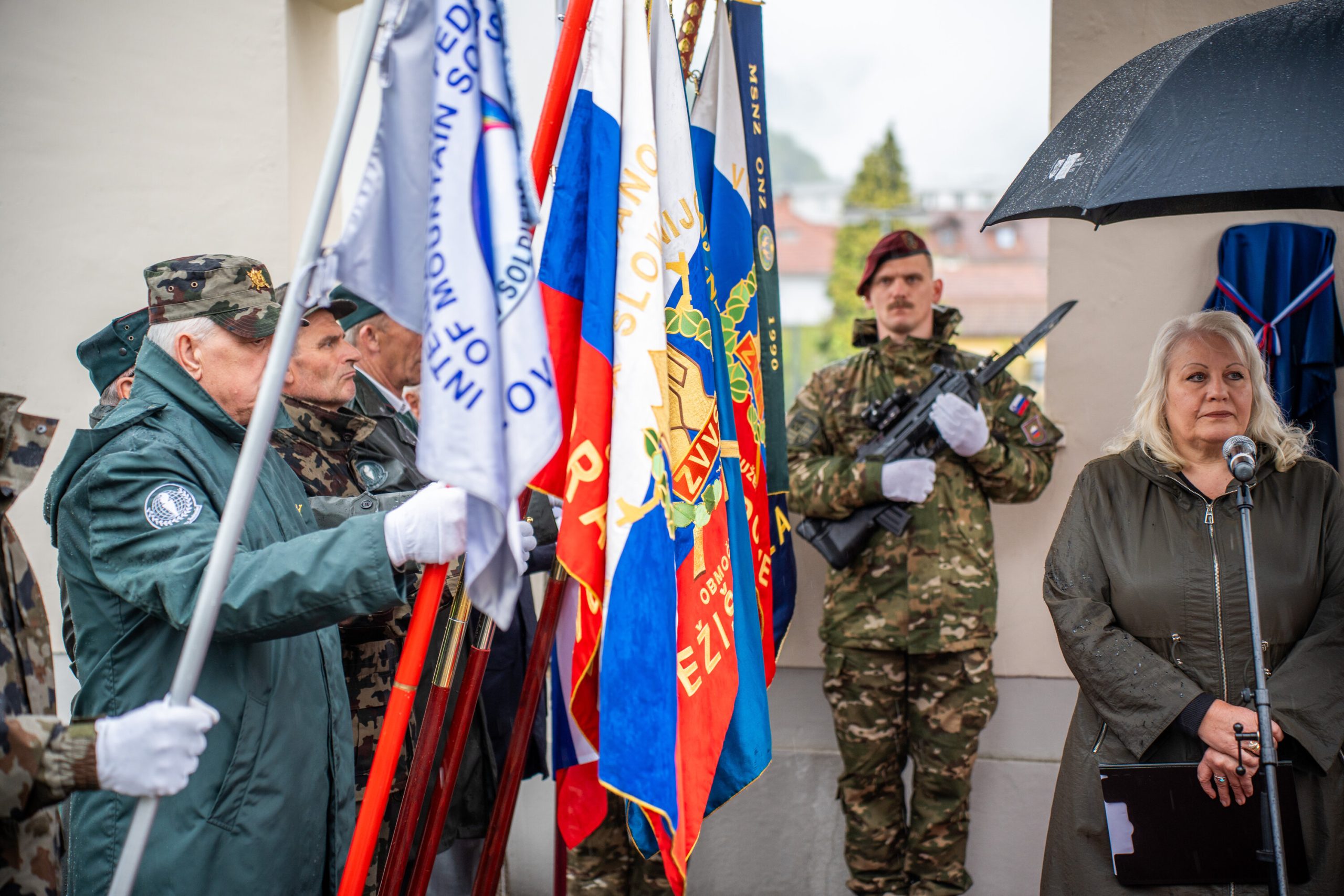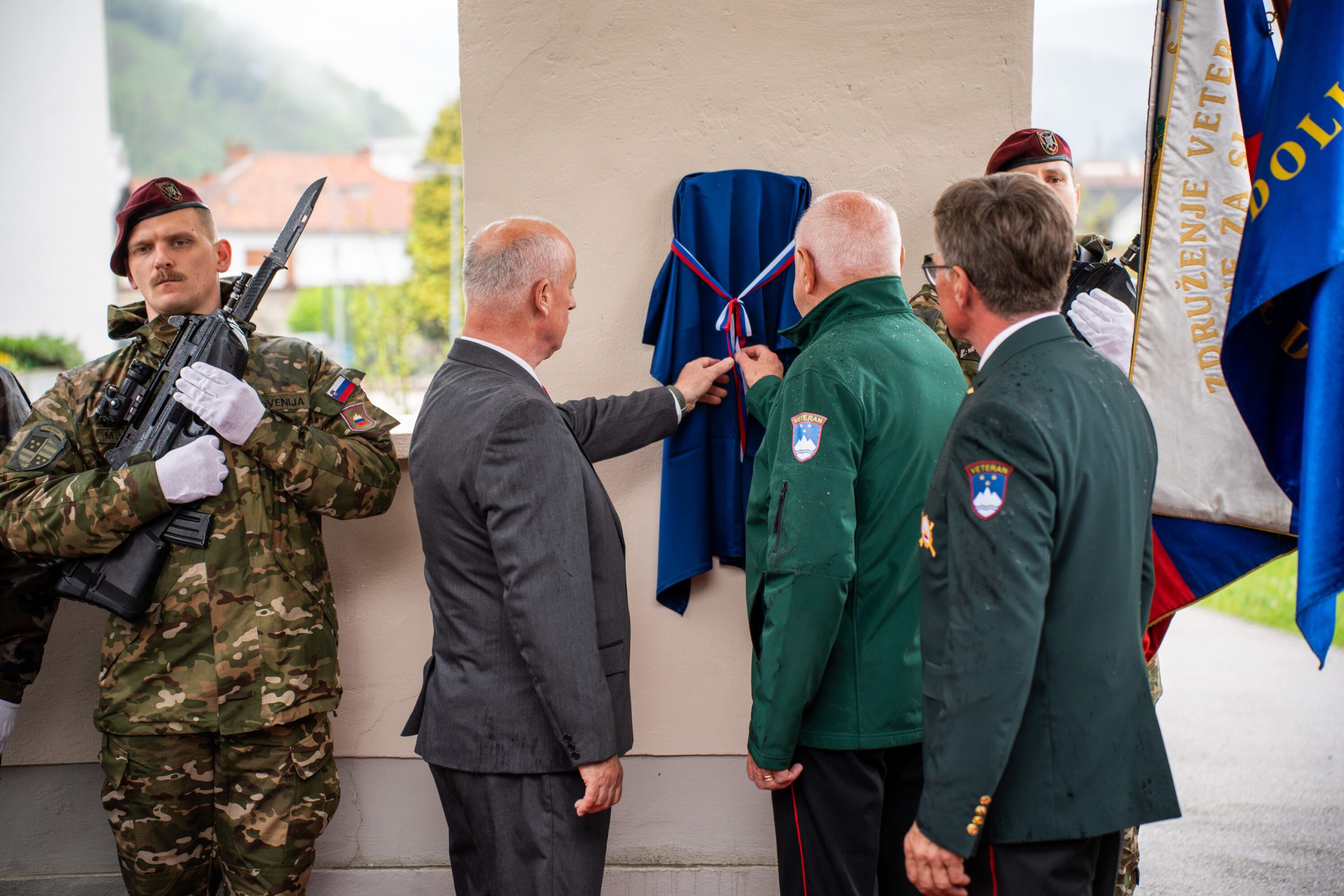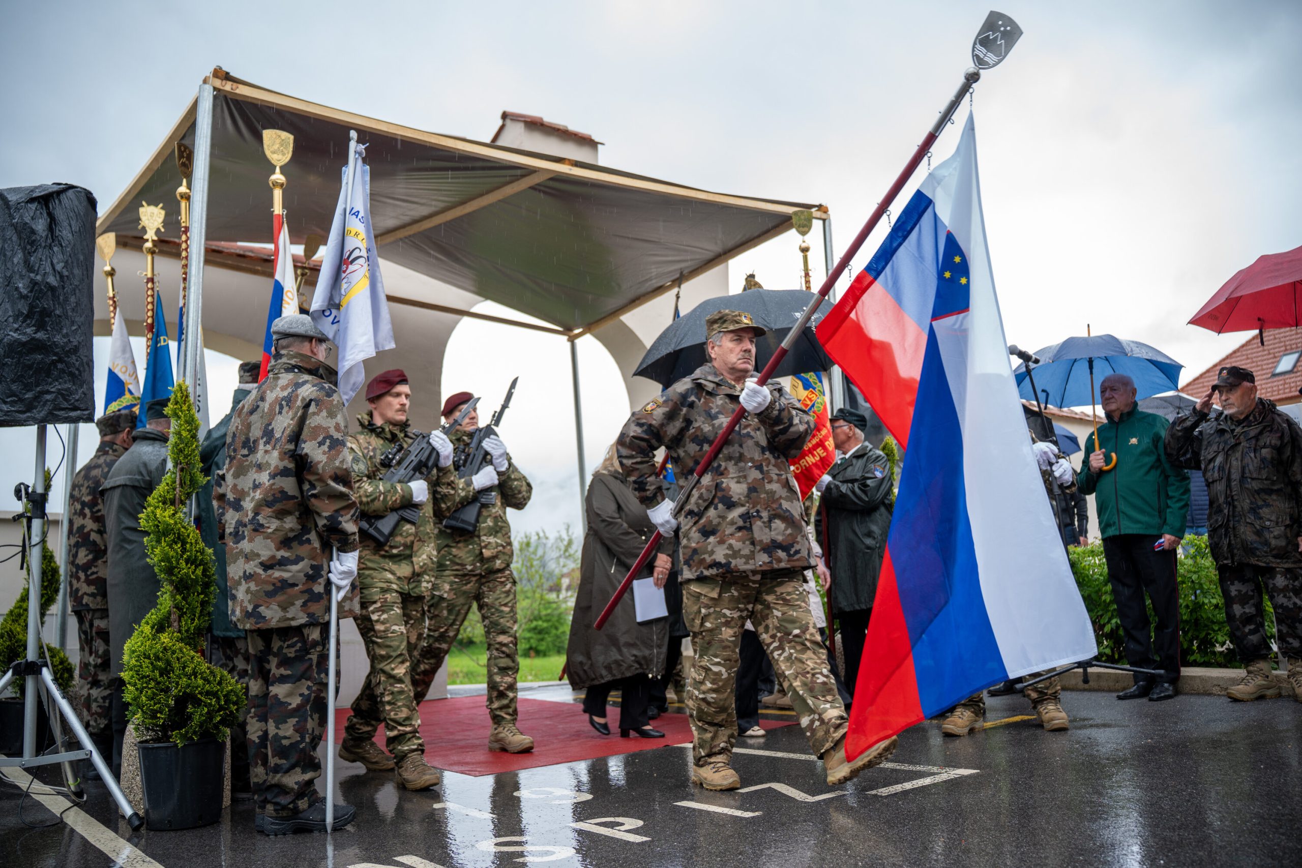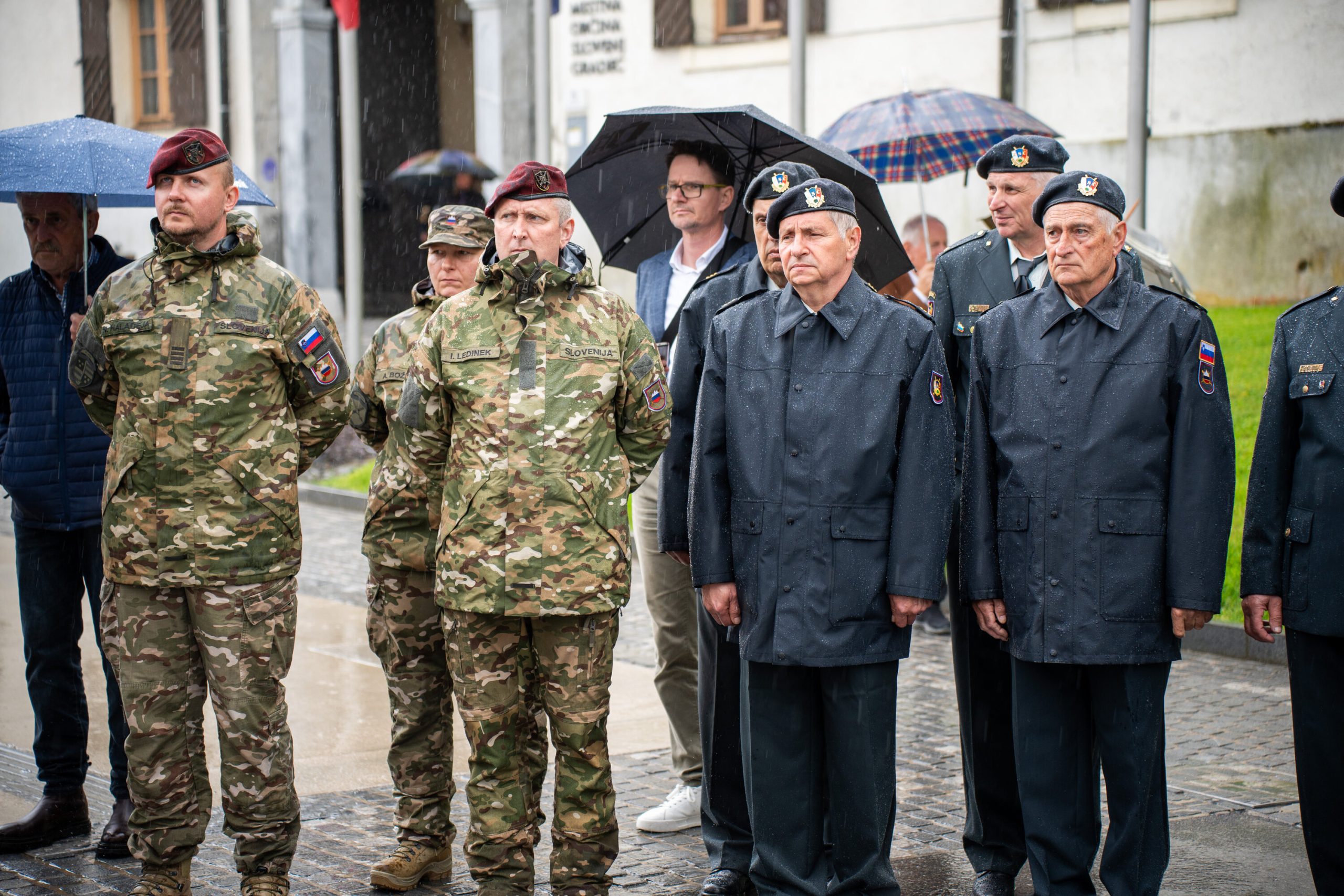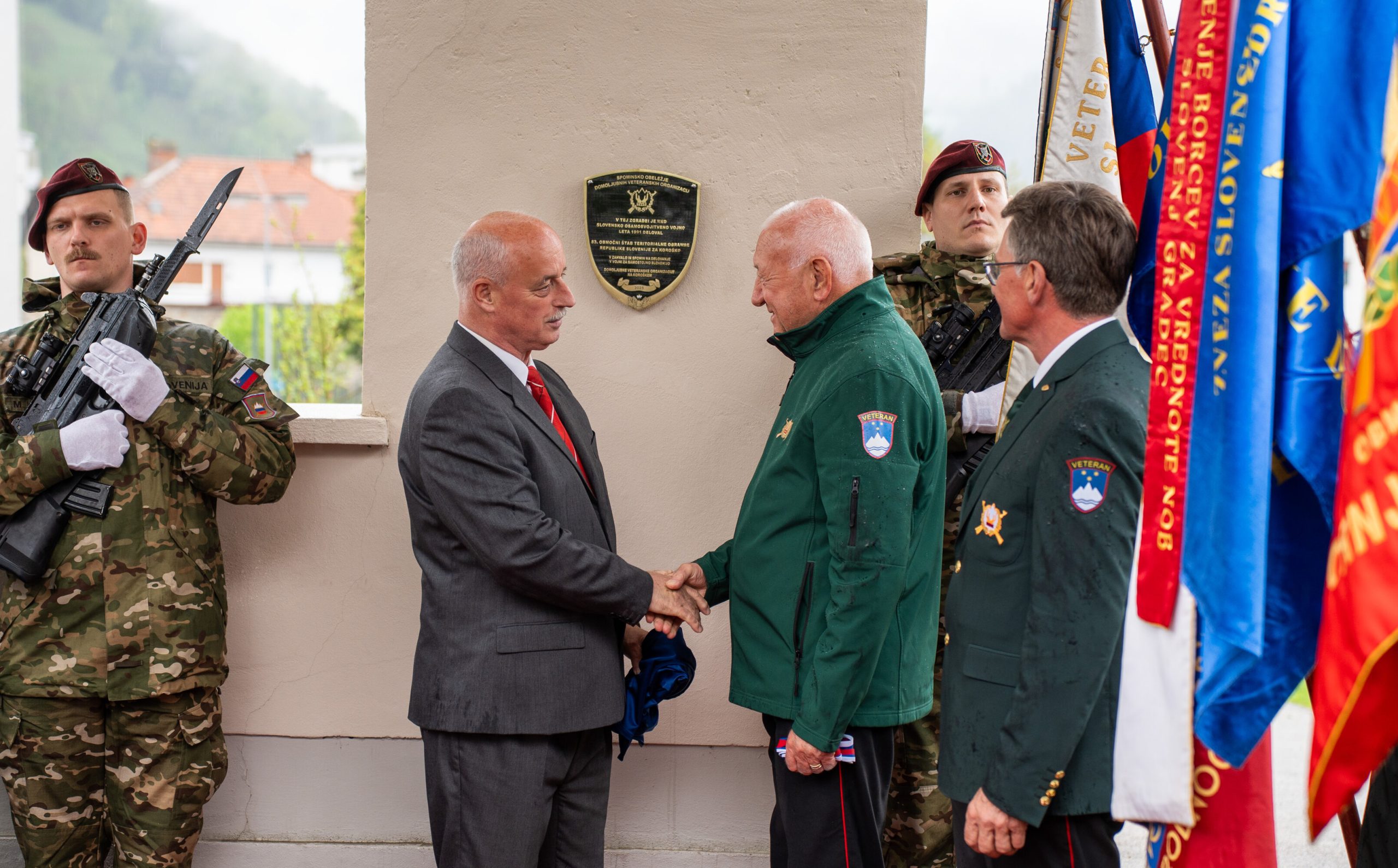 Veteranke in veterani, pripadniki domoljubnih organizacij in drugi obiskovalci so se kljub slabemu vremenu zbrali pred graščino Rotenturn.
