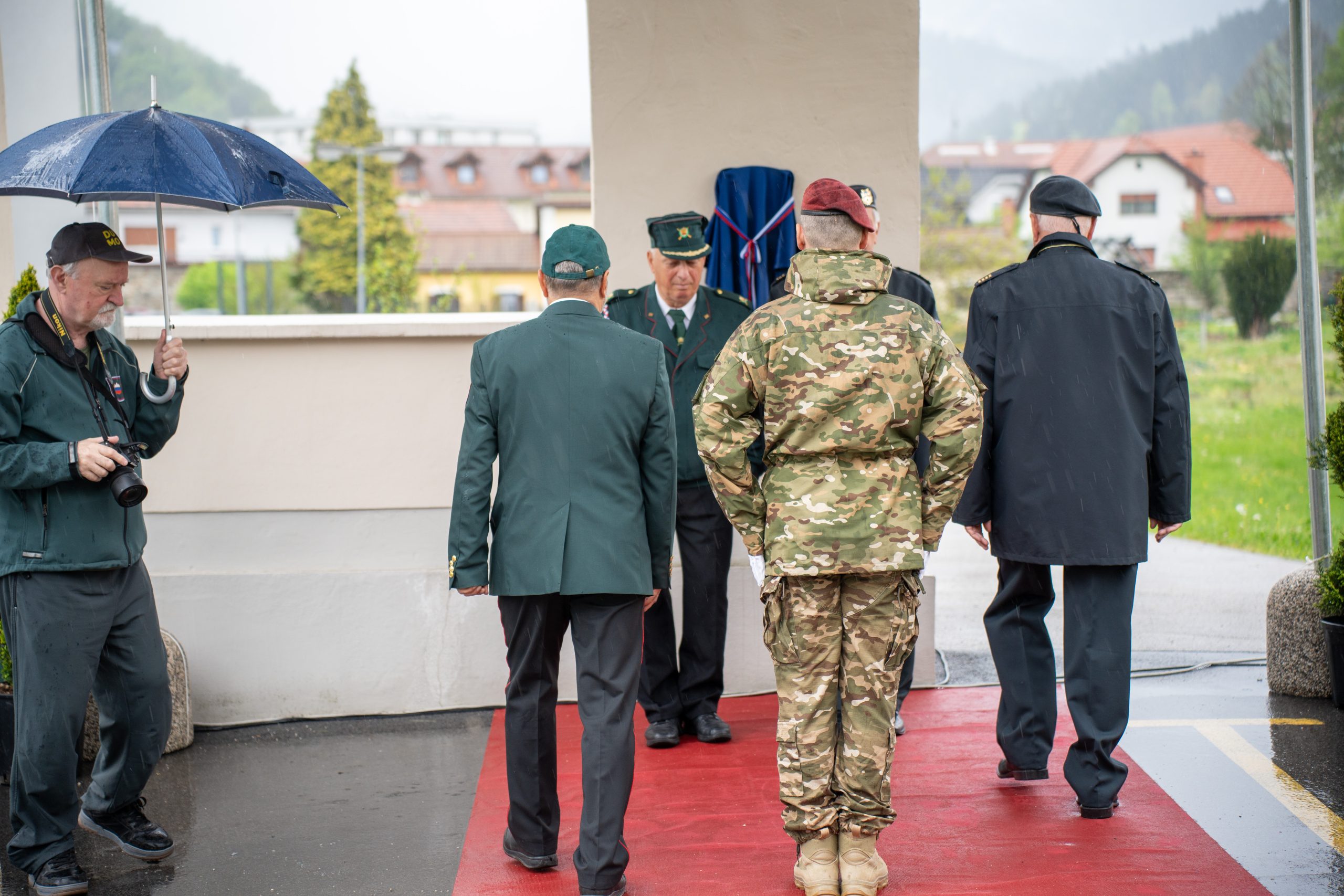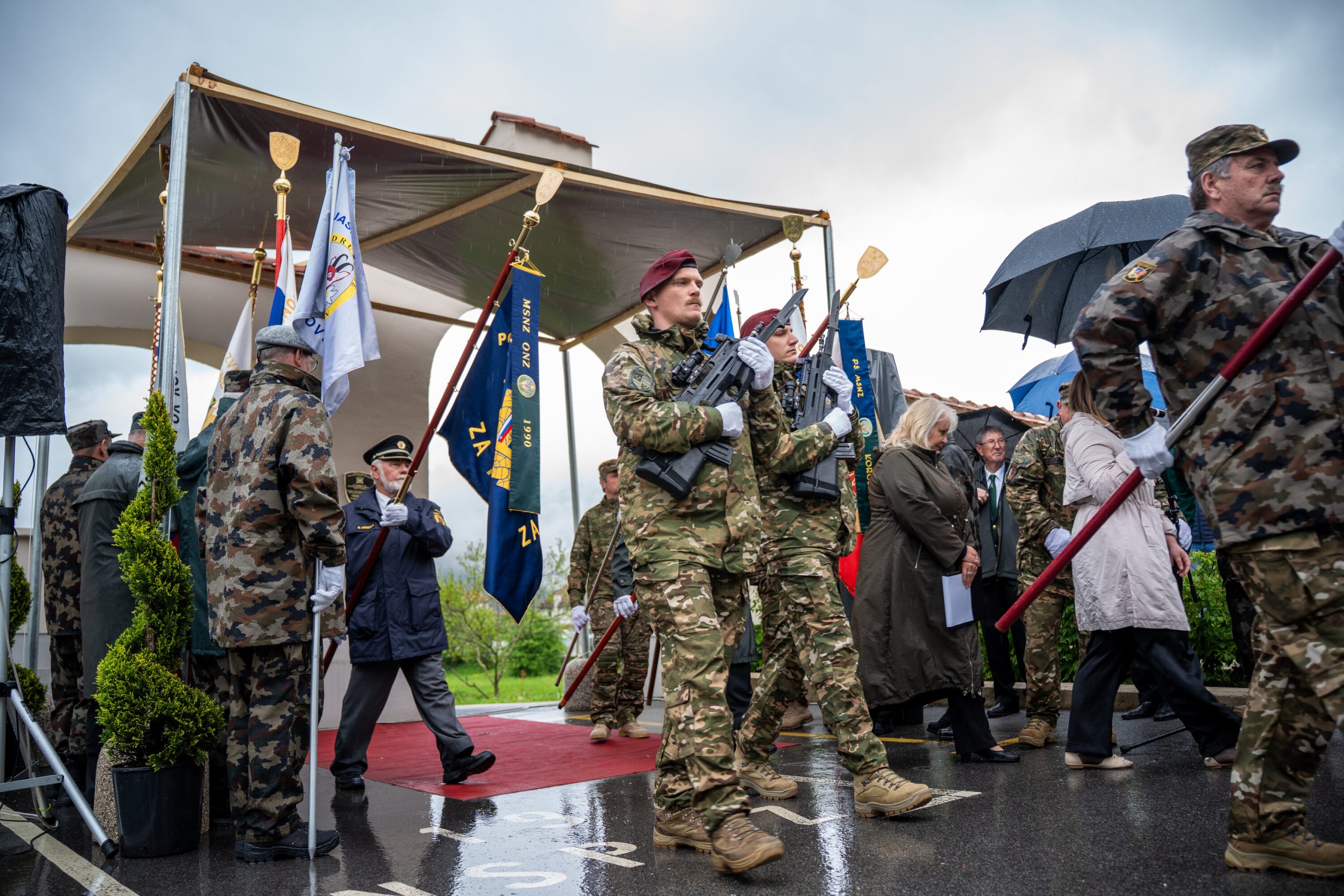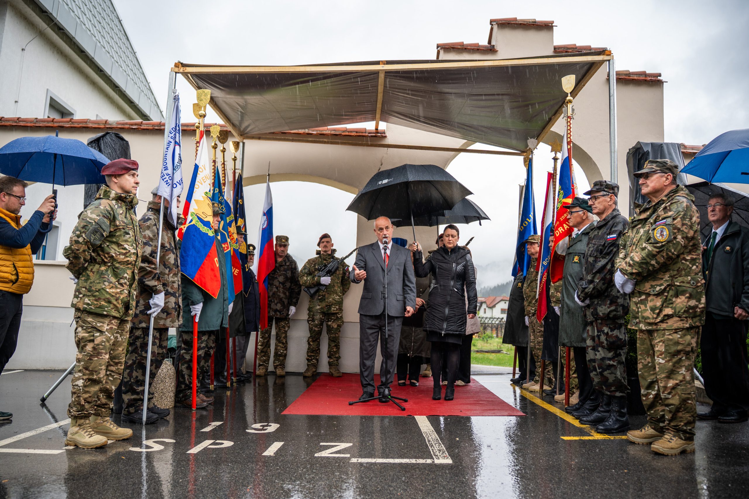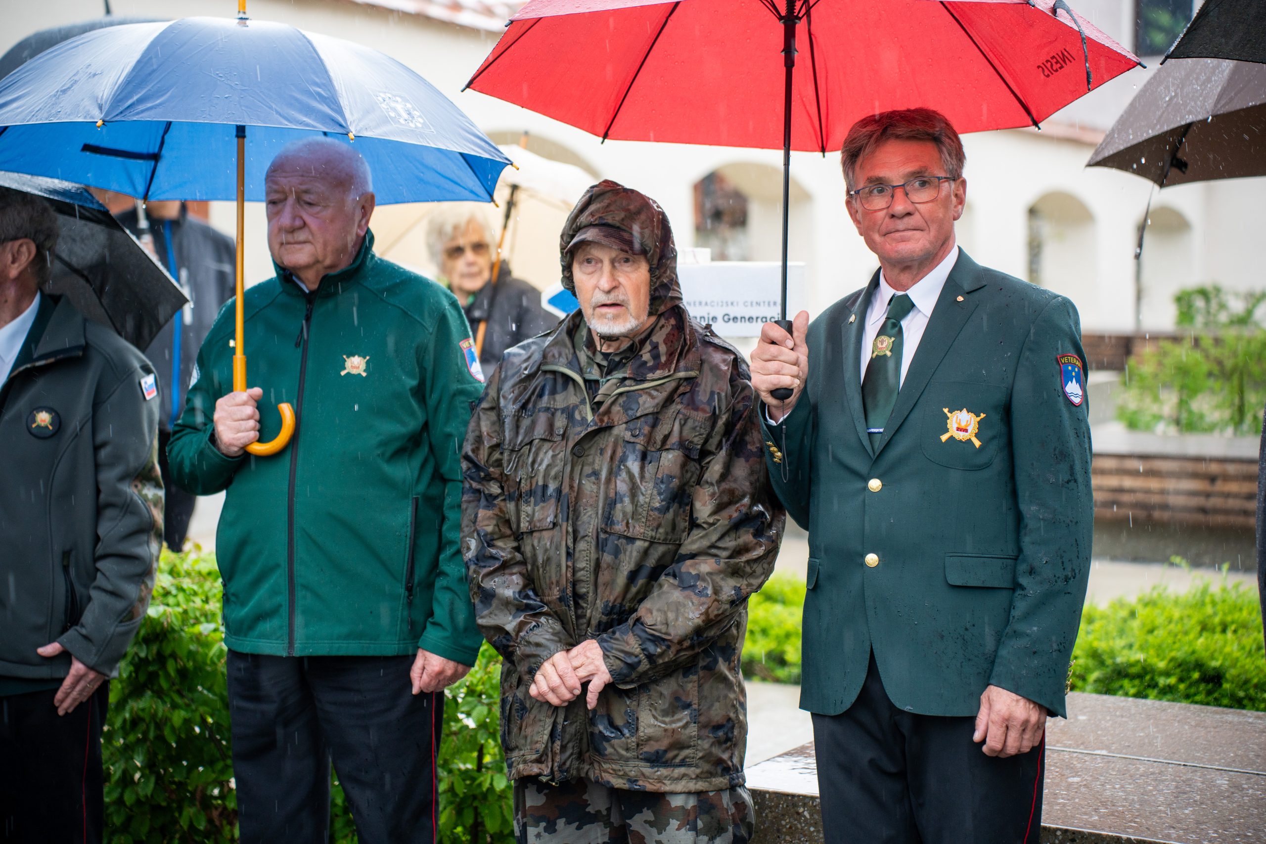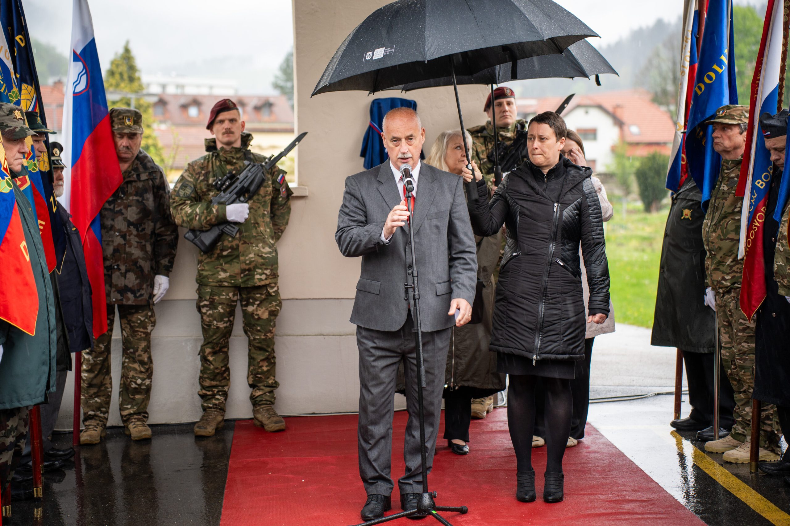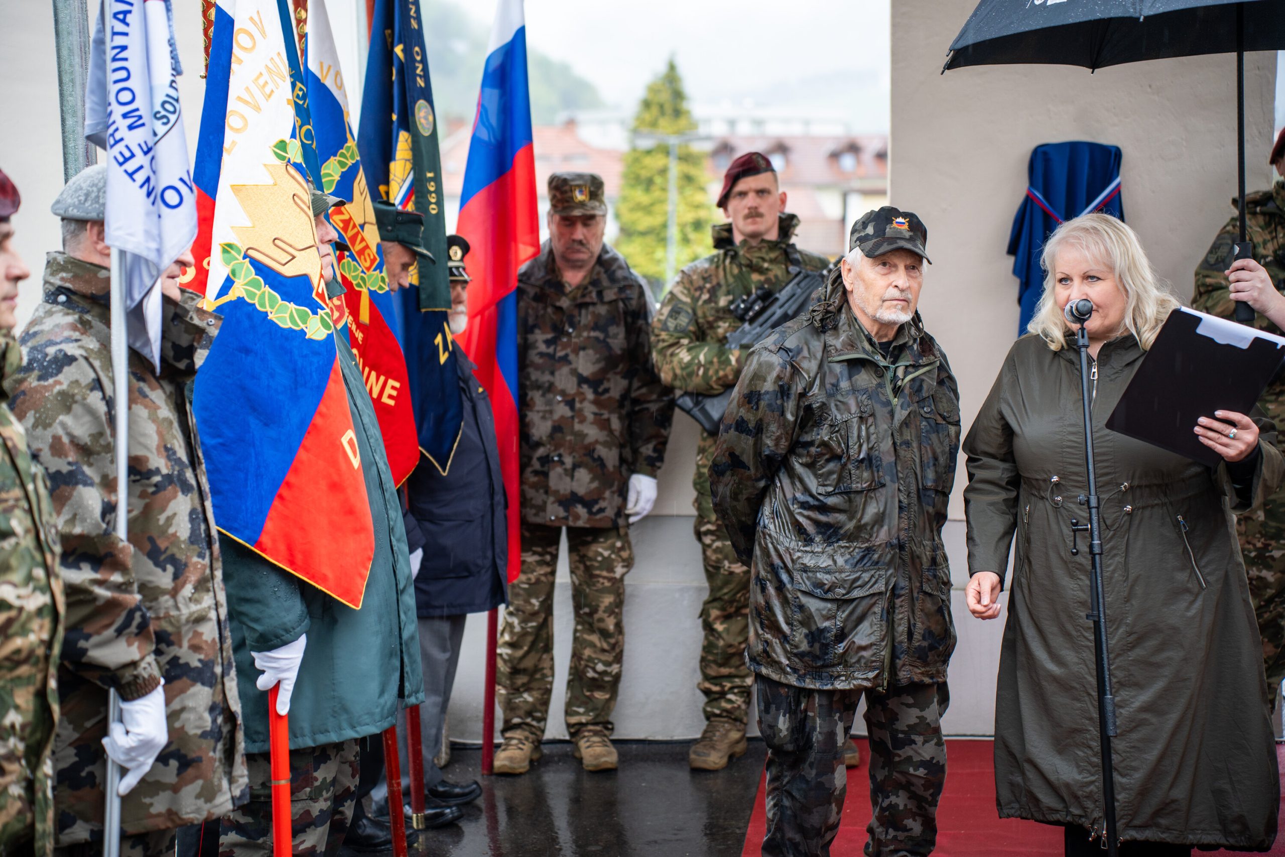 Veteranke in veterani, pripadniki domoljubnih organizacij in drugi obiskovalci so se kljub slabemu vremenu zbrali pred graščino Rotenturn.