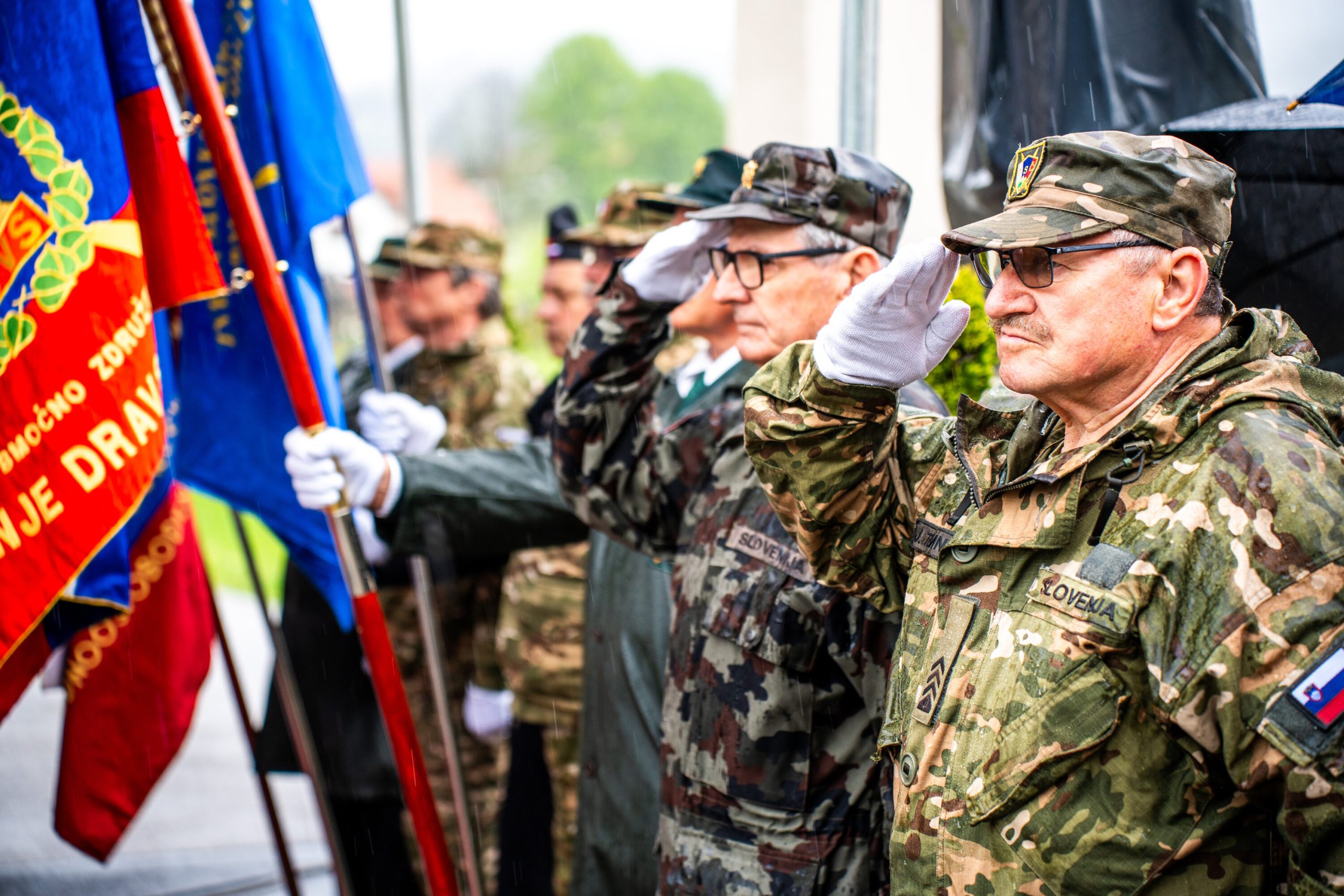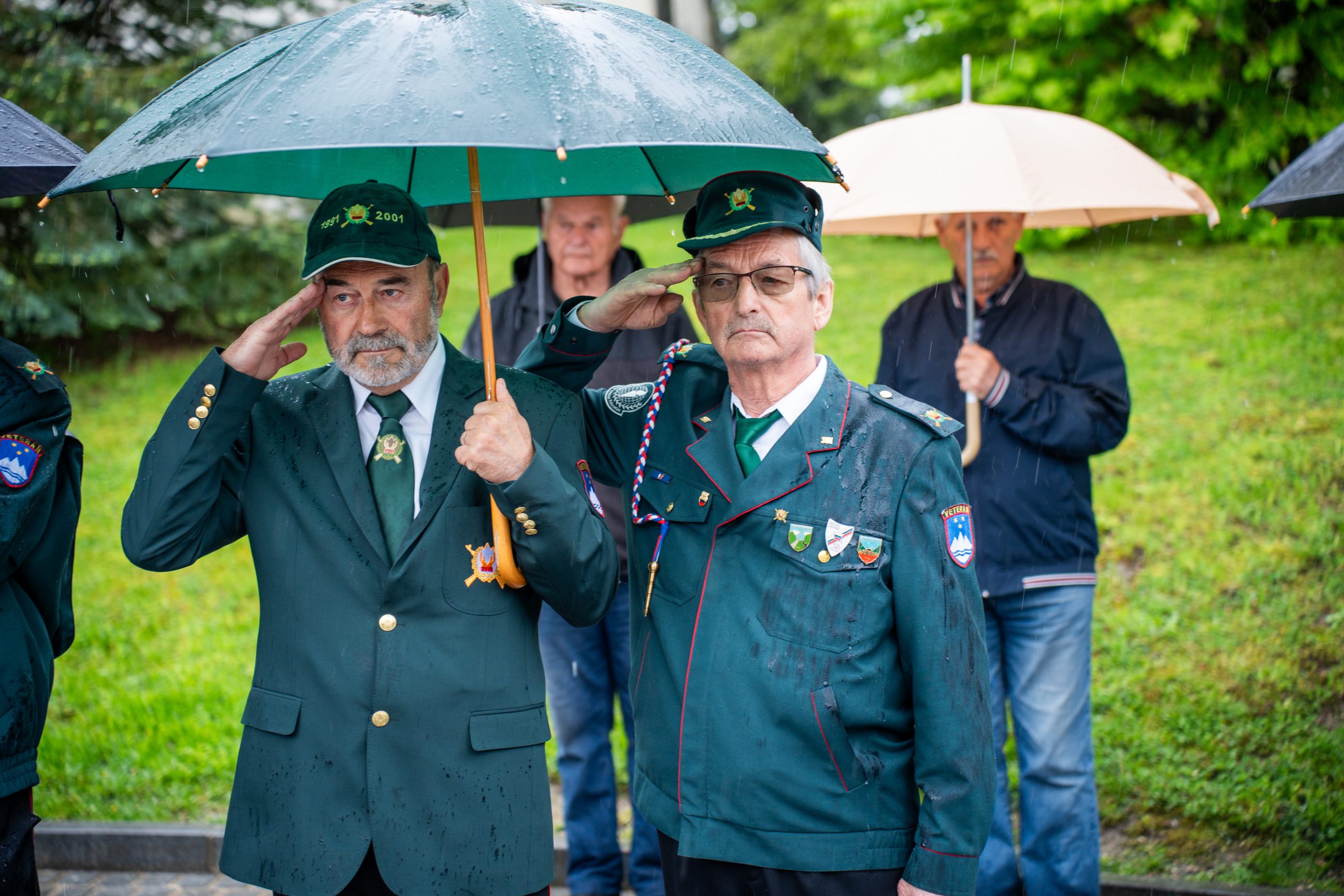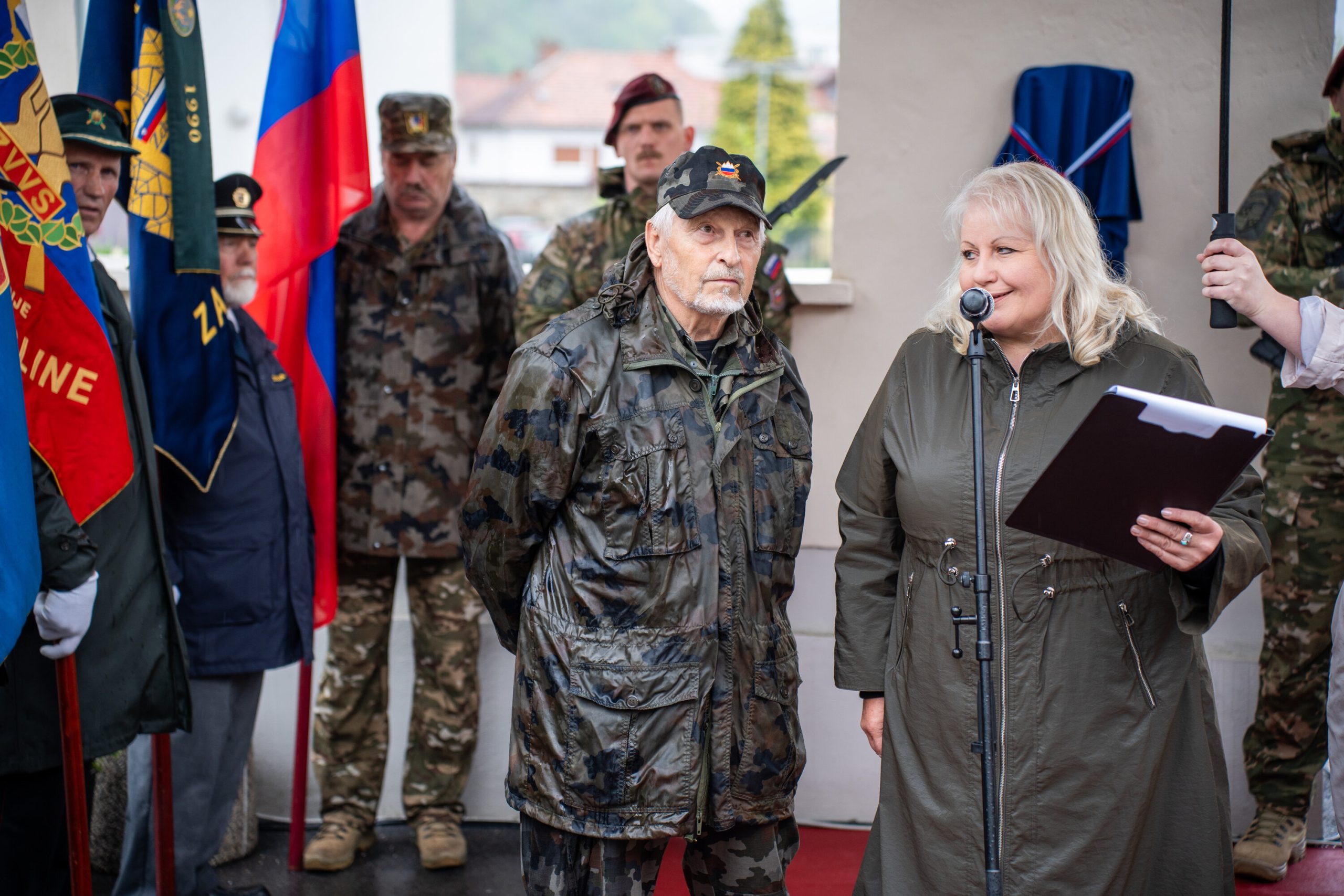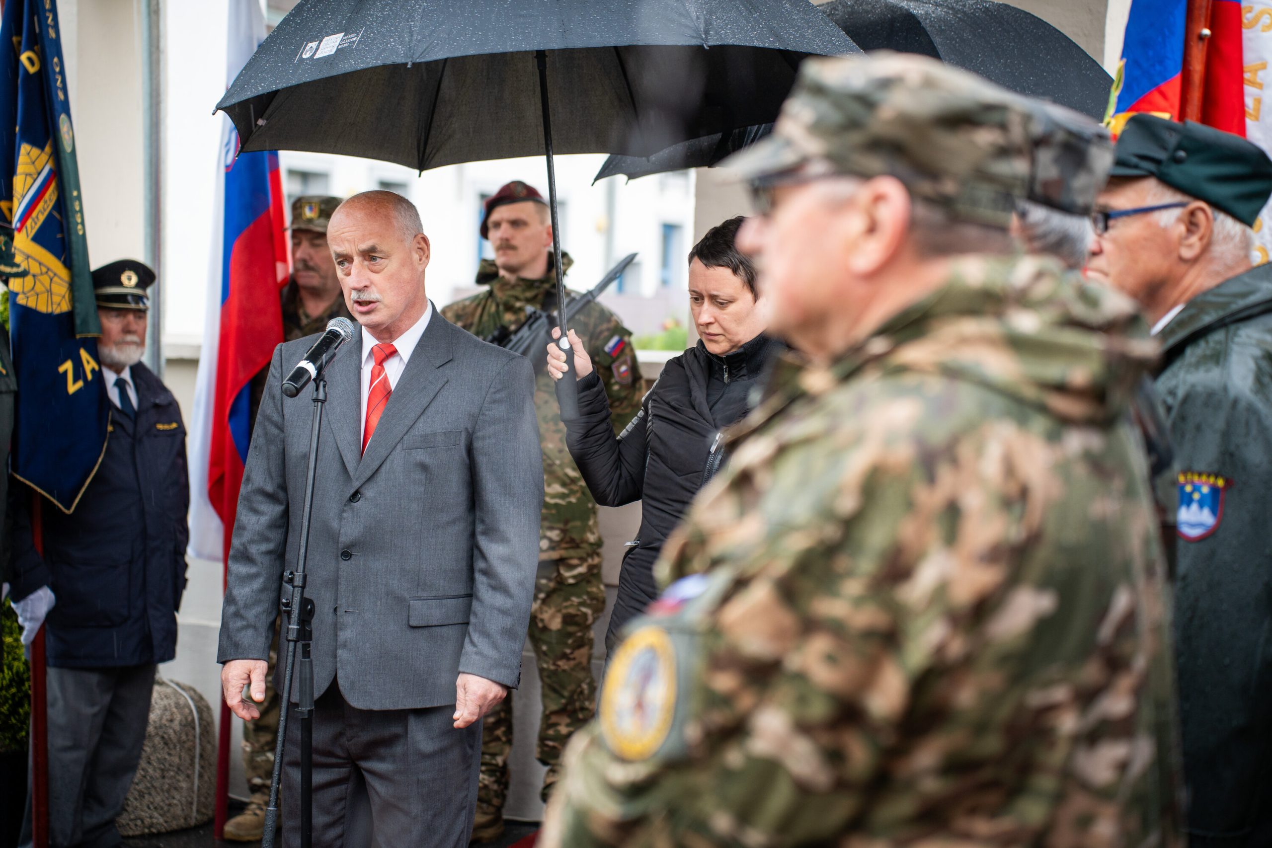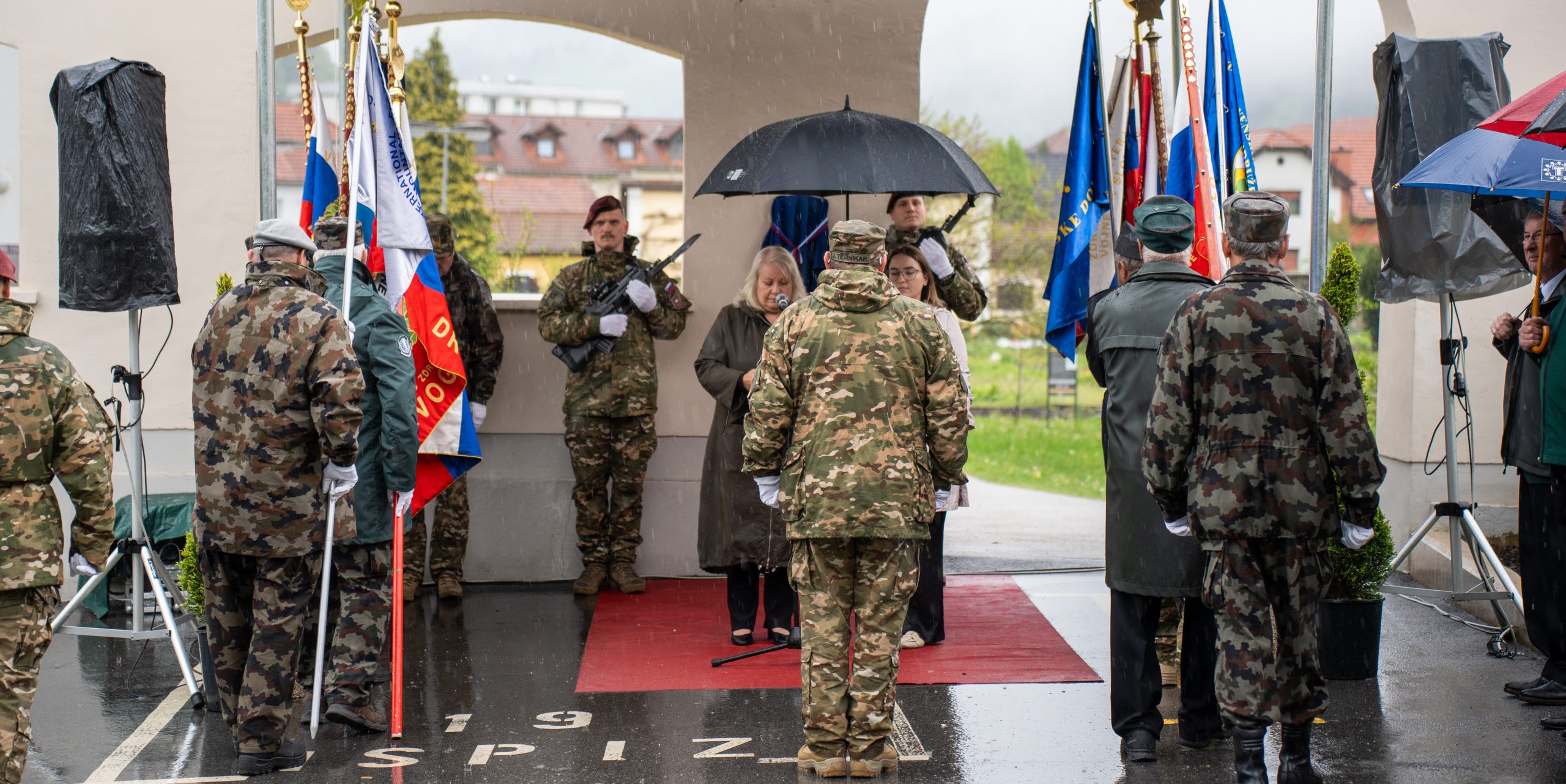 Veteranke in veterani, pripadniki domoljubnih organizacij in drugi obiskovalci so se kljub slabemu vremenu zbrali pred graščino Rotenturn.
