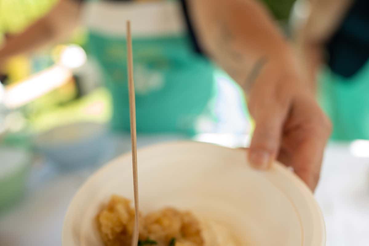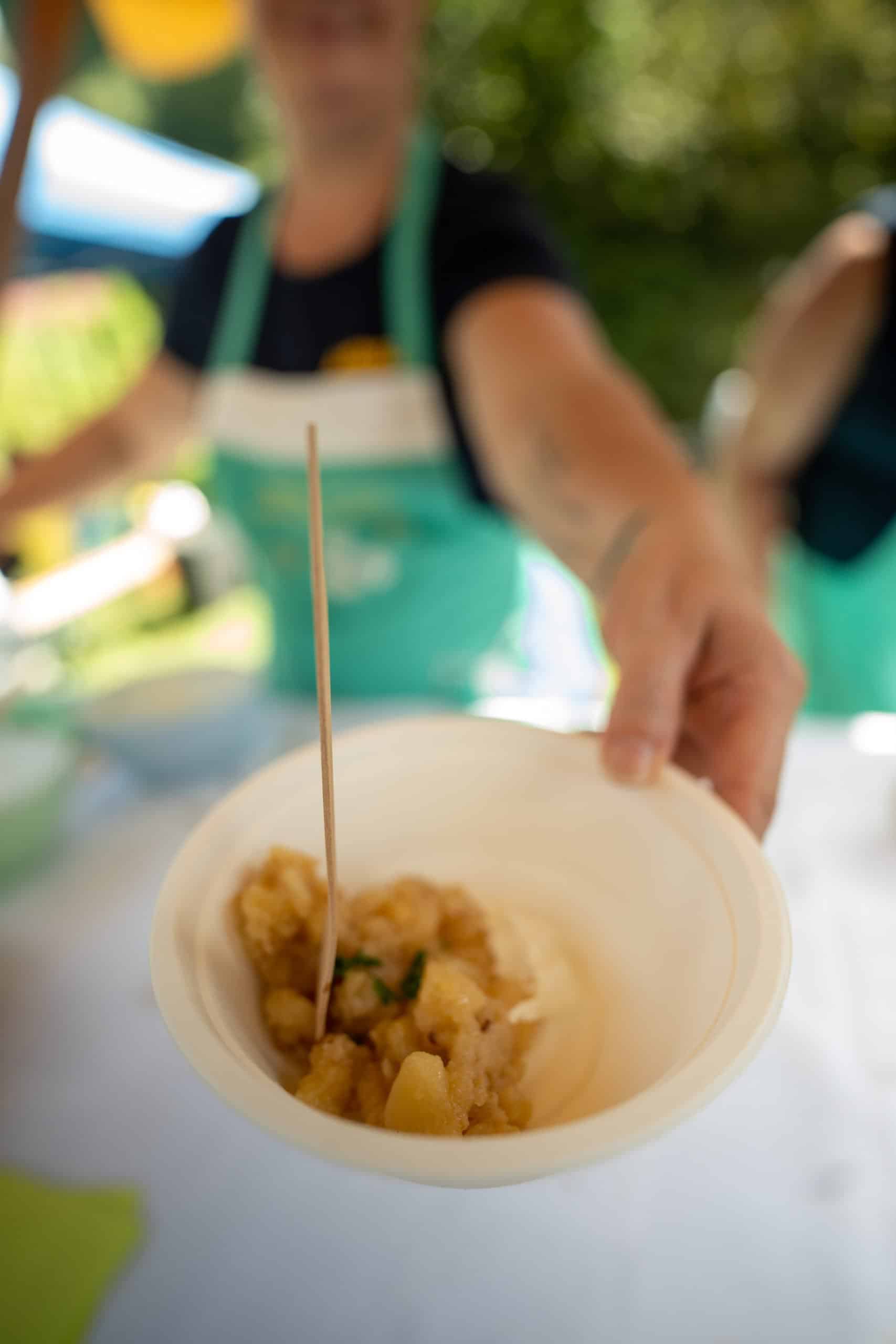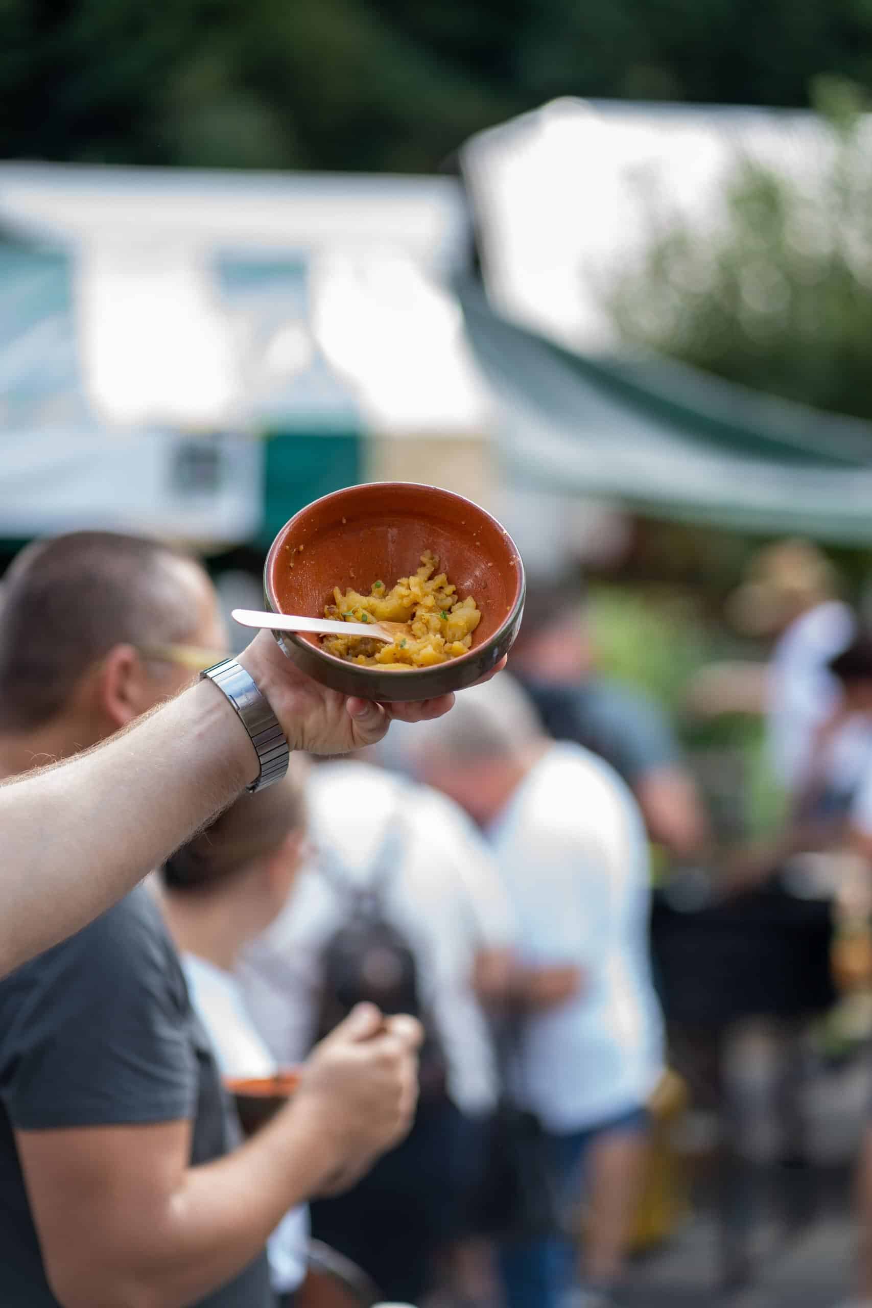 Uradni del prireditve se je začel ob 12.30 z društvenimi fanfarami, pozdravom in himno praženemu krompirju. Do takrat je moral biti pražen krompir pripravljen, sodelujoče ekipe pa so ga lahko obiskovalcem začele deliti po koncu himne, to je nekje okoli 13. ure. Delili so ga v izključno ekološko sprejemljivih posodicah. Že od začetkov festivala namreč velja, da na dogodku ni plastike, je za STA povedal predsednik Društva za priznanje praženega krompirja kot samostojne jedi Stane Menard.