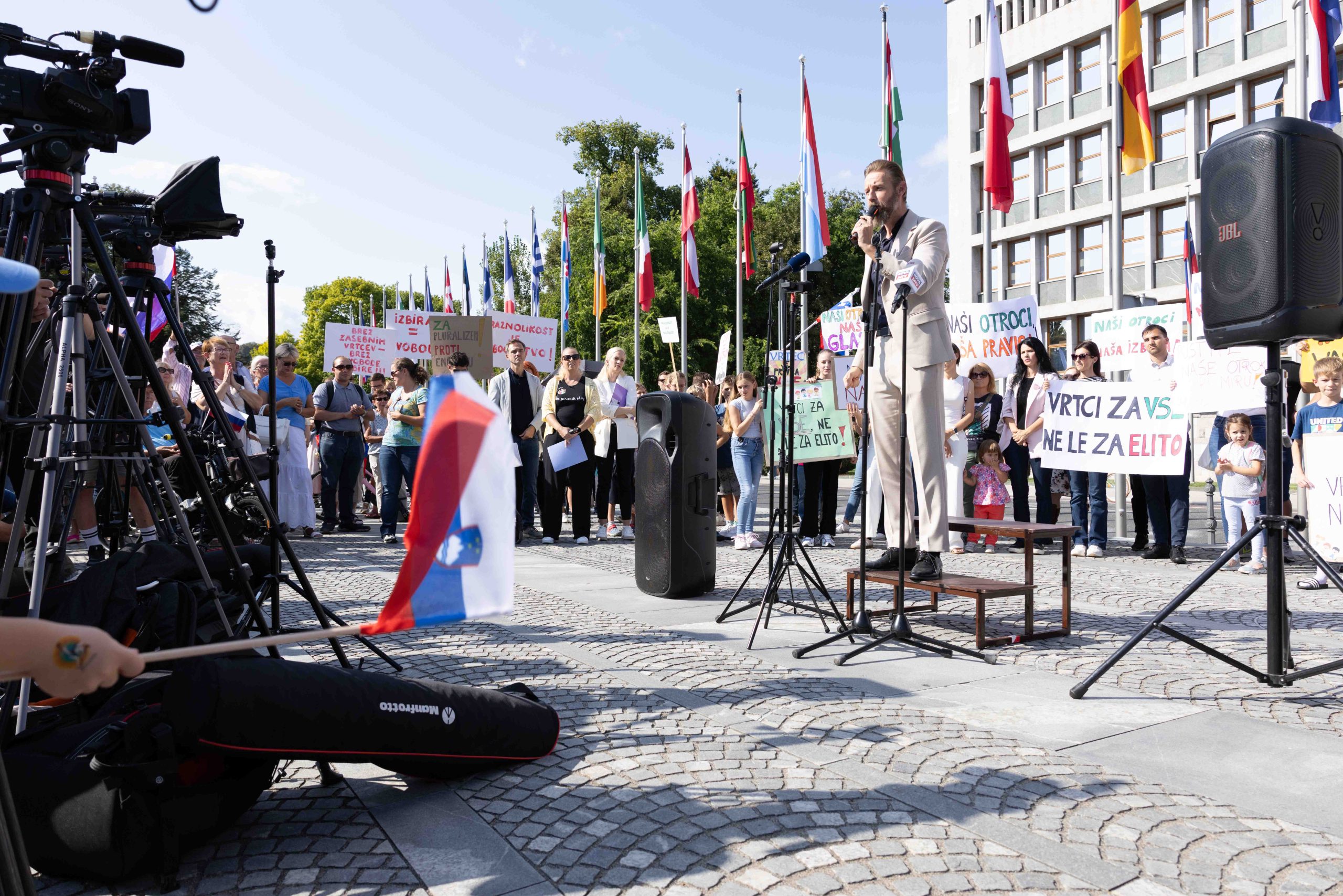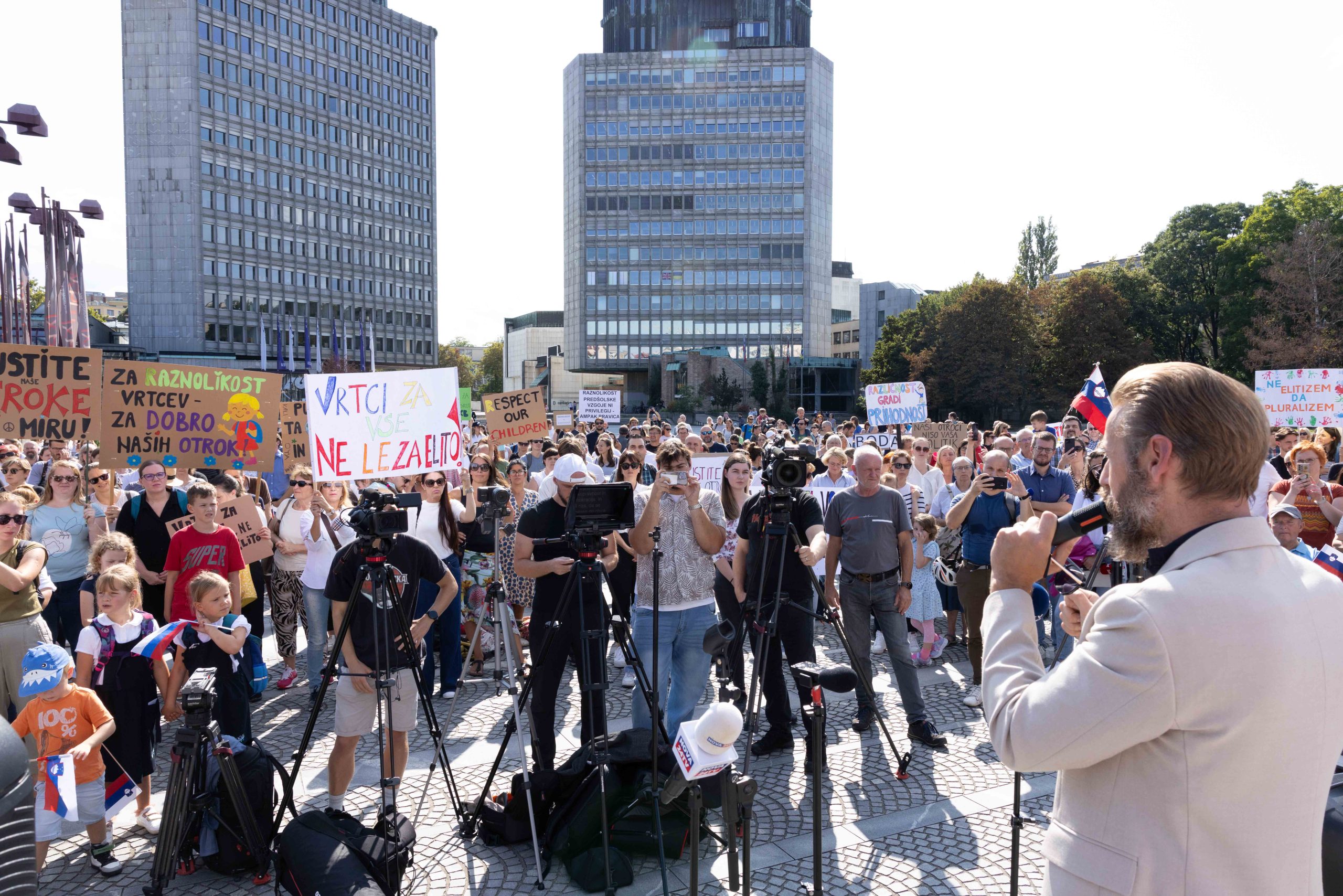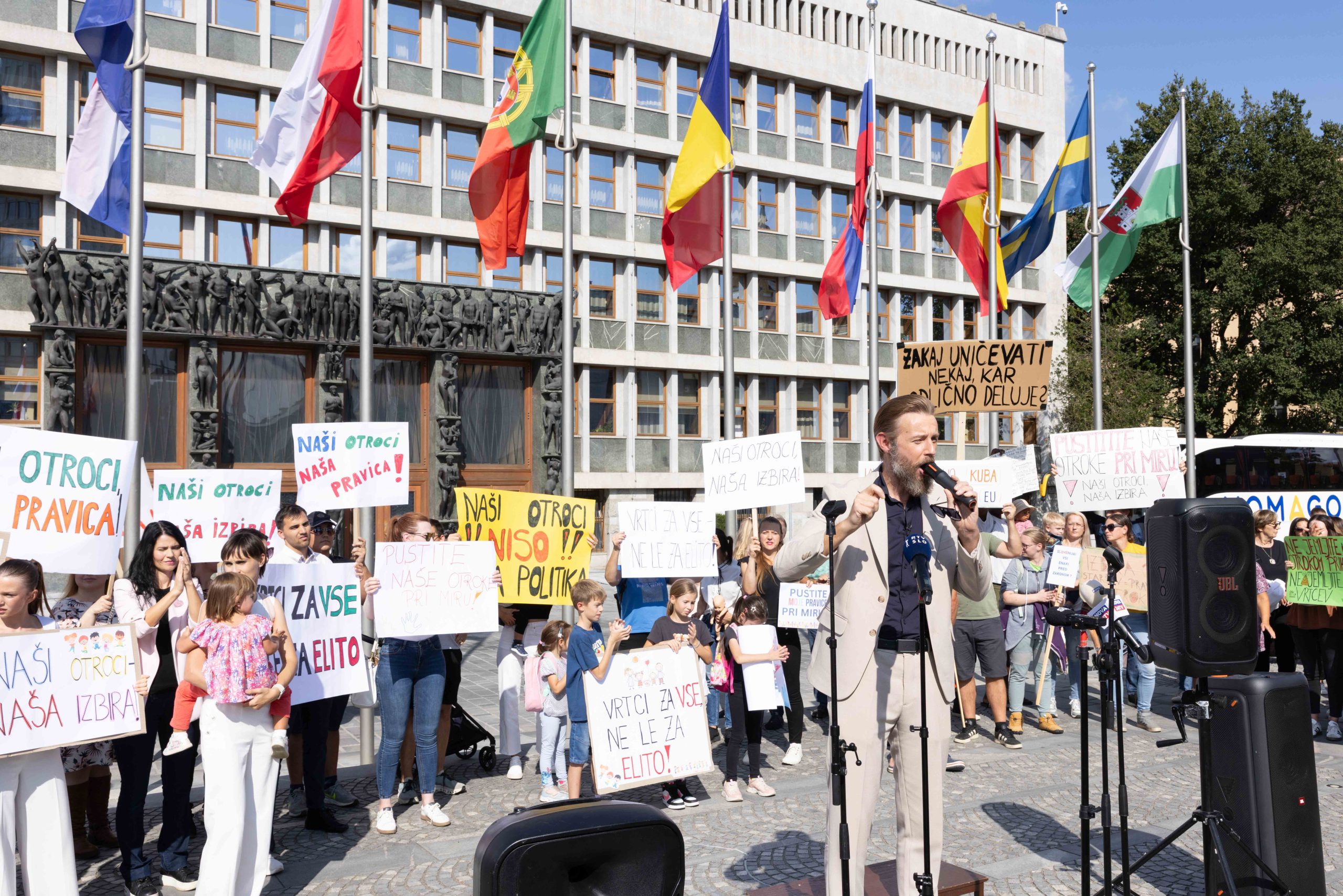 Številne zbrane starše, otroke, vzgojiteljice, ravnatelje in podpornike zasebnih vrtcev so nagovorili Gregor Bezenšek, ustanovitelj iniciative staršev, Taja Steblovnik, predsednica Združenja zasebnih vrtcev, Marko Bandelj, nekdanji politik in drugi.