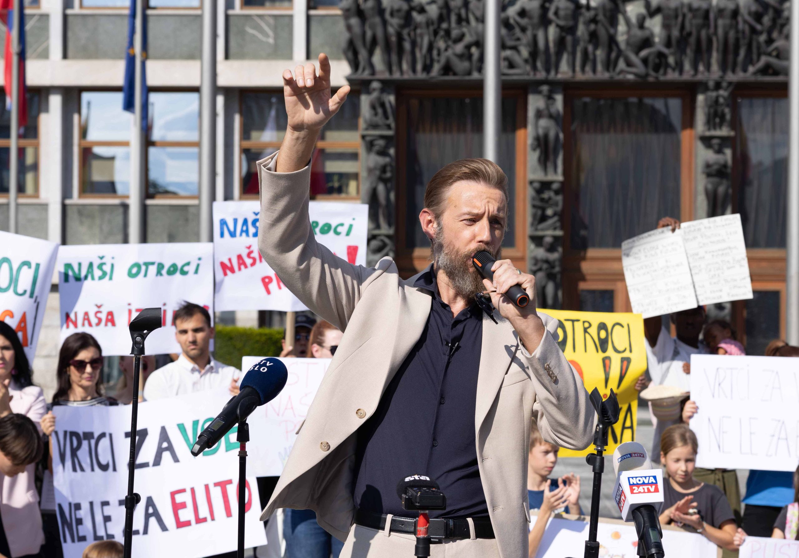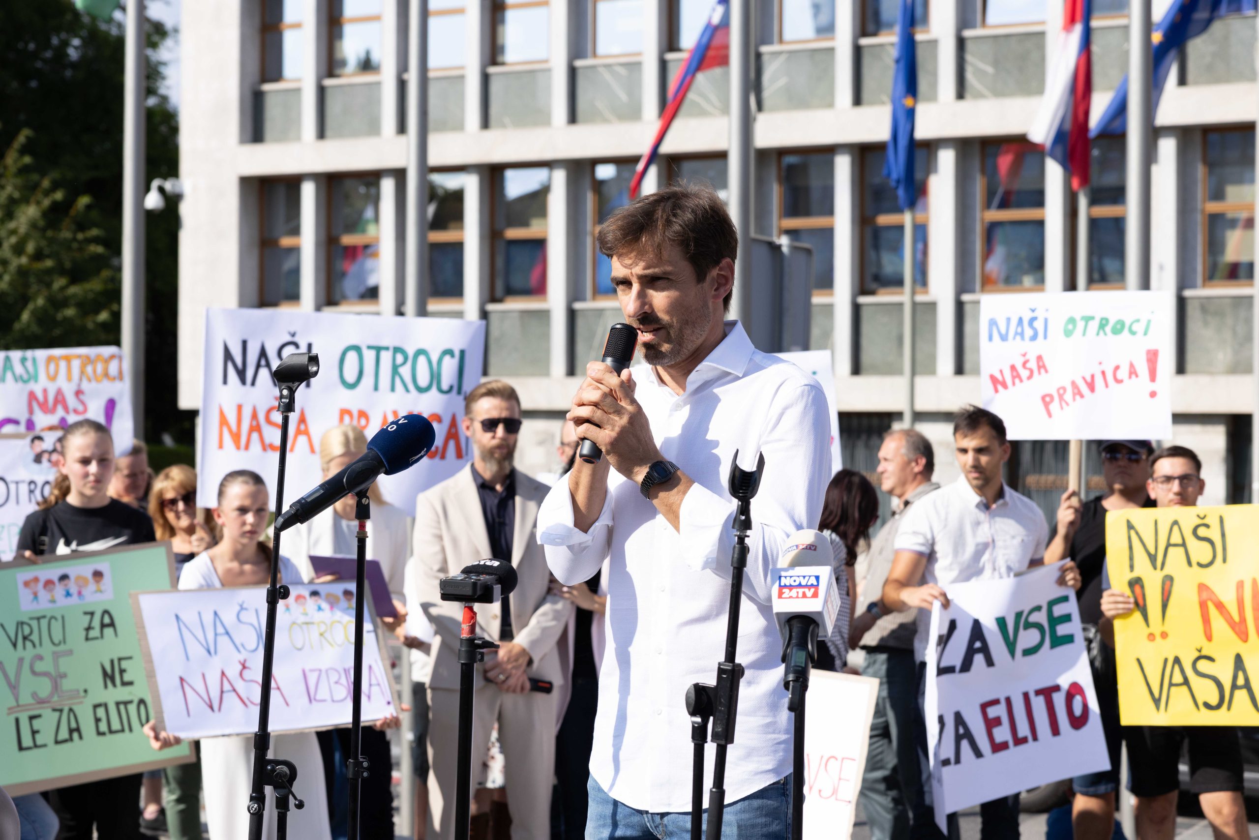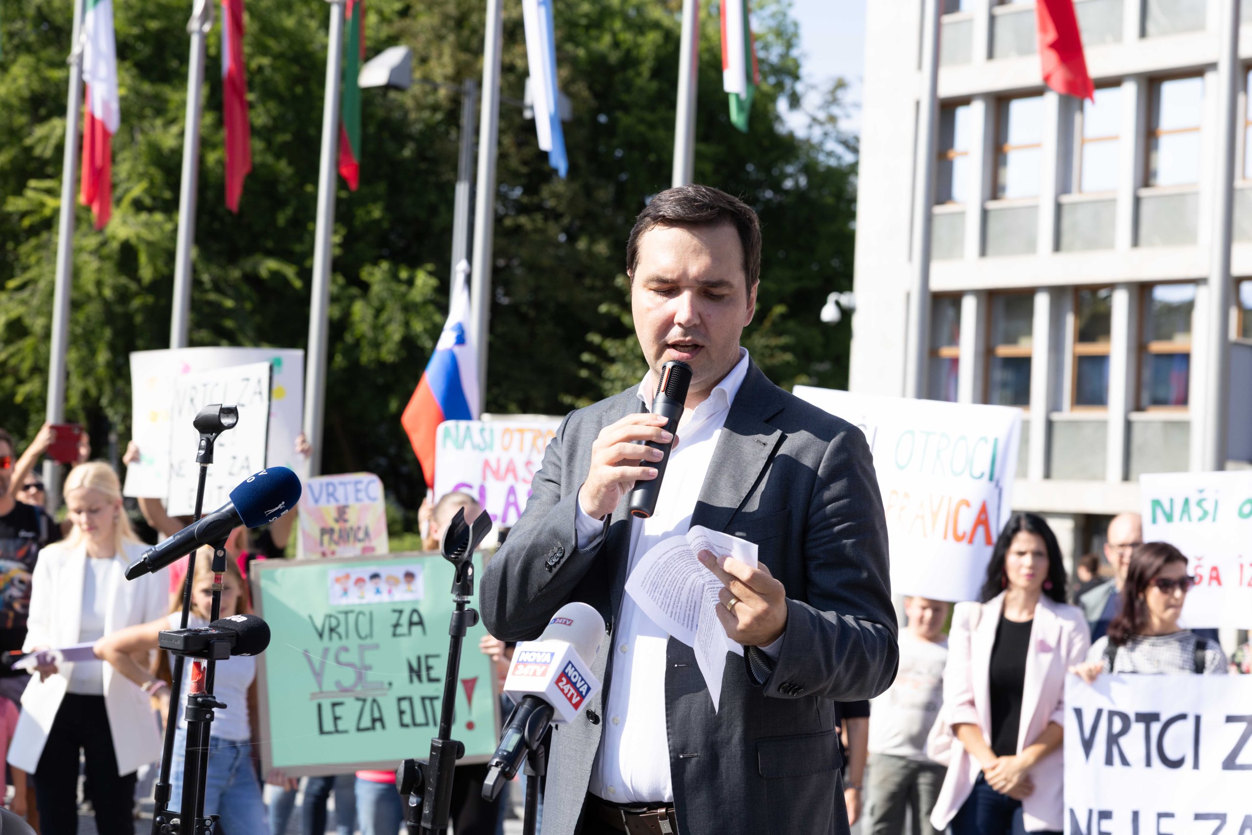 Številne zbrane starše, otroke, vzgojiteljice, ravnatelje in podpornike zasebnih vrtcev so nagovorili Gregor Bezenšek, ustanovitelj iniciative staršev, Taja Steblovnik, predsednica Združenja zasebnih vrtcev, Marko Bandelj, nekdanji politik in drugi.