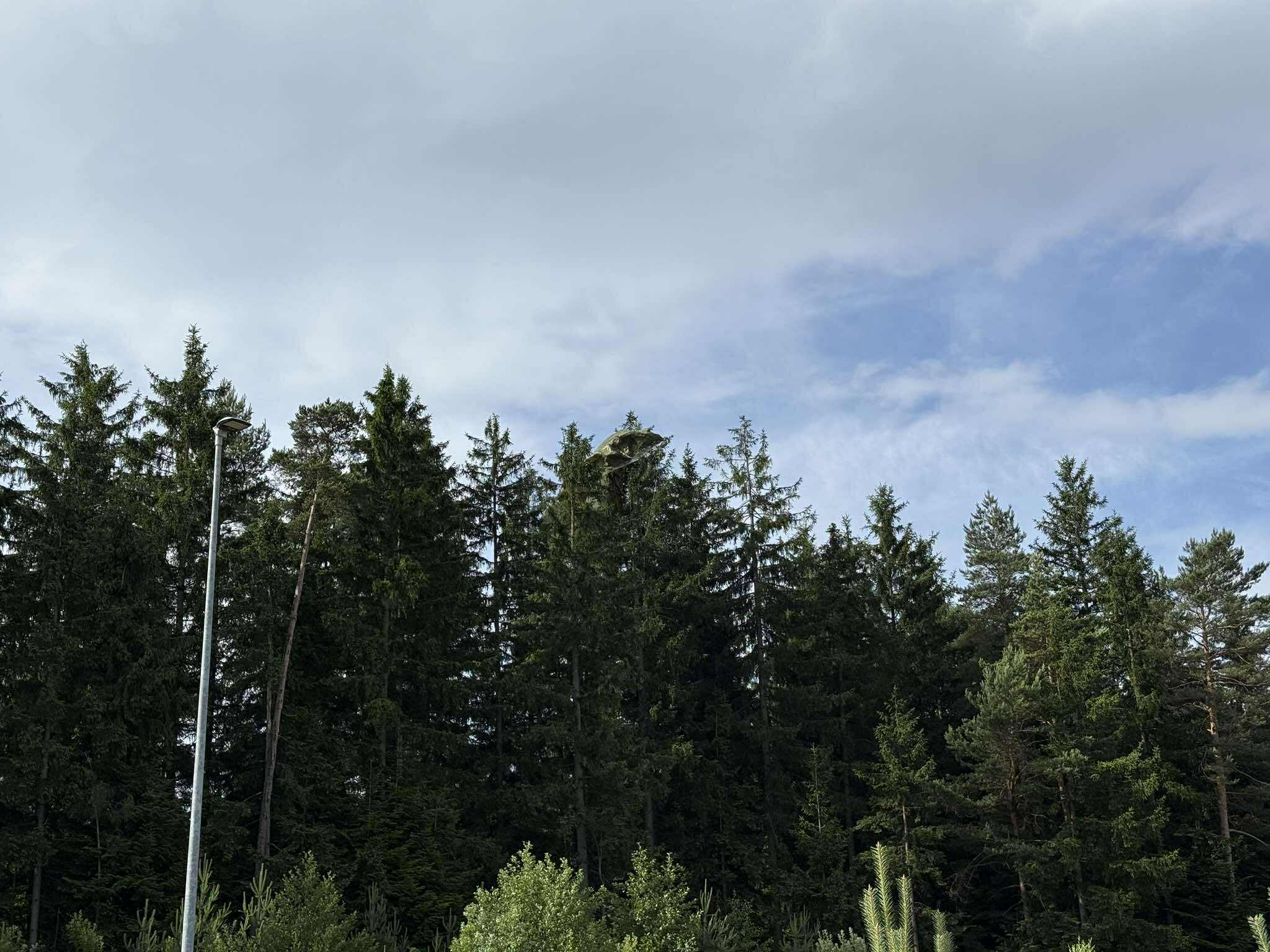 Padalca je zaneslo proti gozdnatemu delu, kjer je obvisel med vejami drevesa. K sreči je ostal nepoškodovan.