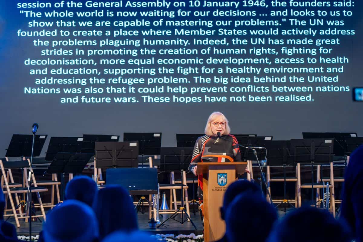 Slavnostna govornica nocojšnje prireditve je bila prof. dr. Renata Salecl, častna občanka MO Slovenj Gradec preko video povezave pa je zbrane s poslanico nagovoril generalni sekretar Združenih narodov Antónia Guterresa.