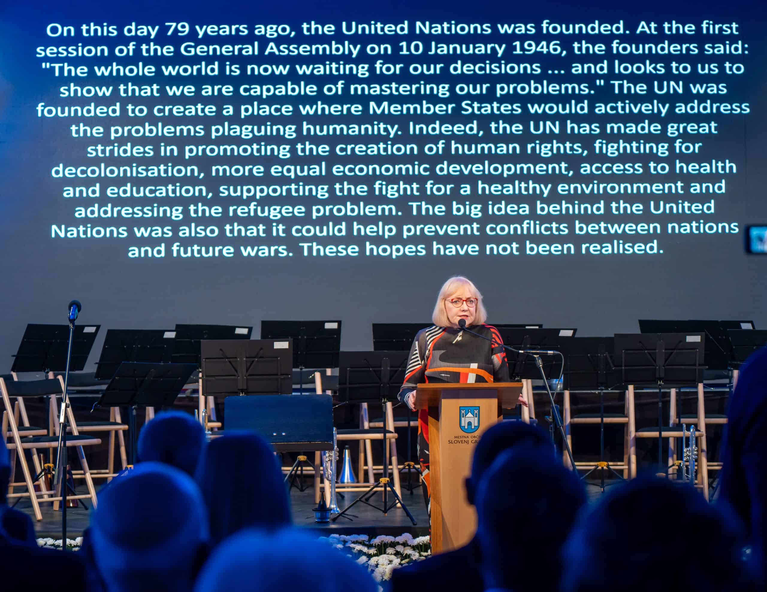 Slavnostna govornica nocojšnje prireditve je bila prof. dr. Renata Salecl, častna občanka MO Slovenj Gradec preko video povezave pa je zbrane s poslanico nagovoril generalni sekretar Združenih narodov Antónia Guterresa.