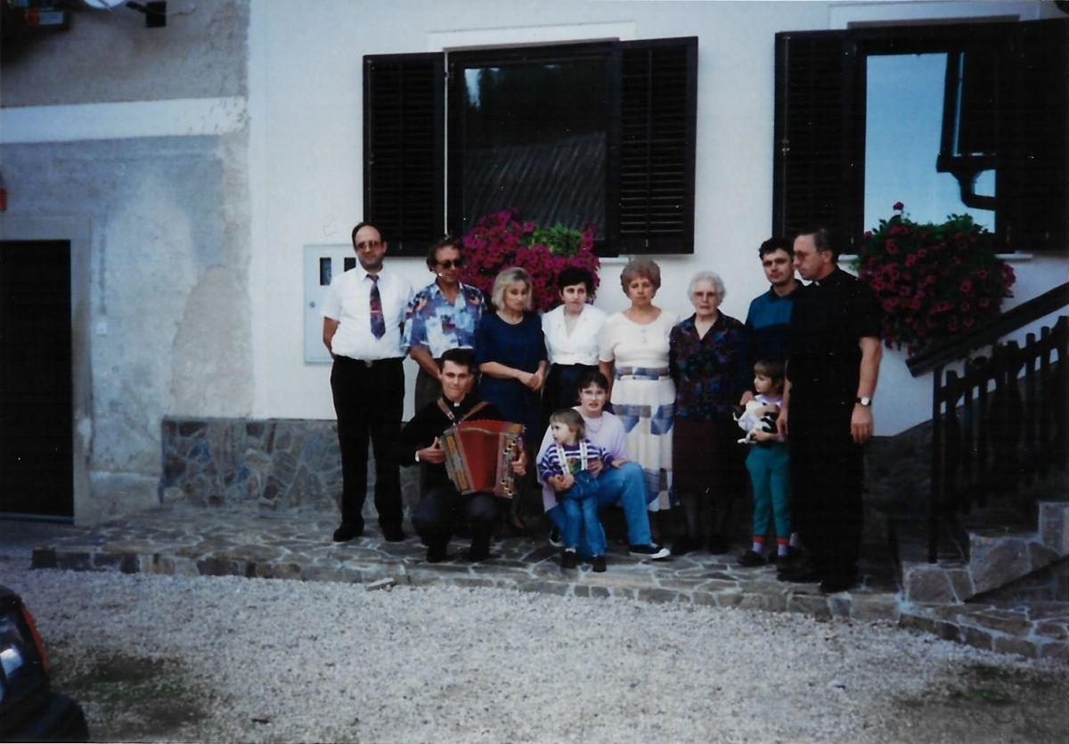 Župnik Tone ob svoji mami, treh sestrah in bratu z družinami. Ivenca pri Vojniku je njegov rojstni kraj in dom. Vse življenje je v njem najdeval, kar ni nikjer drugod, pa je rad potoval in si s pozornostjo ogledoval ta svet.[/caption]