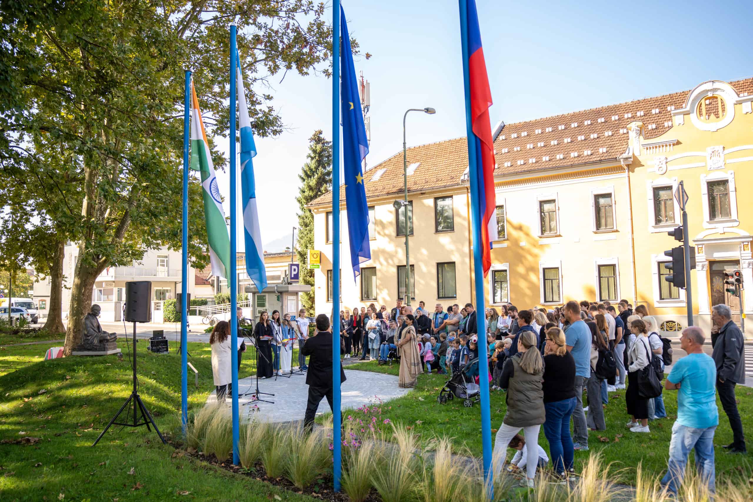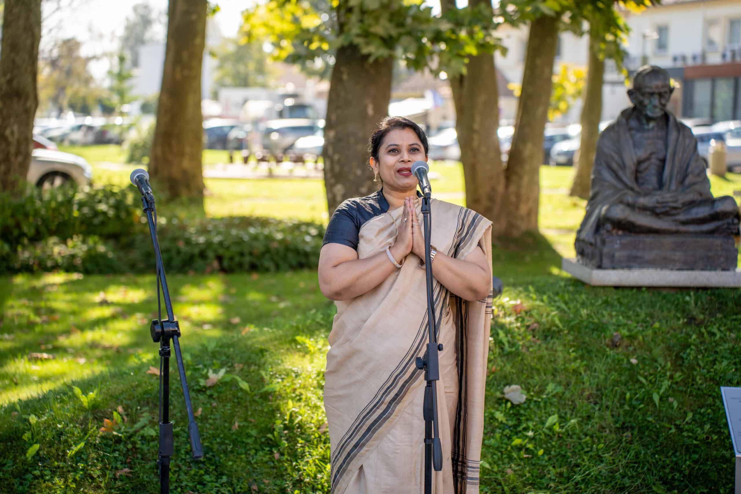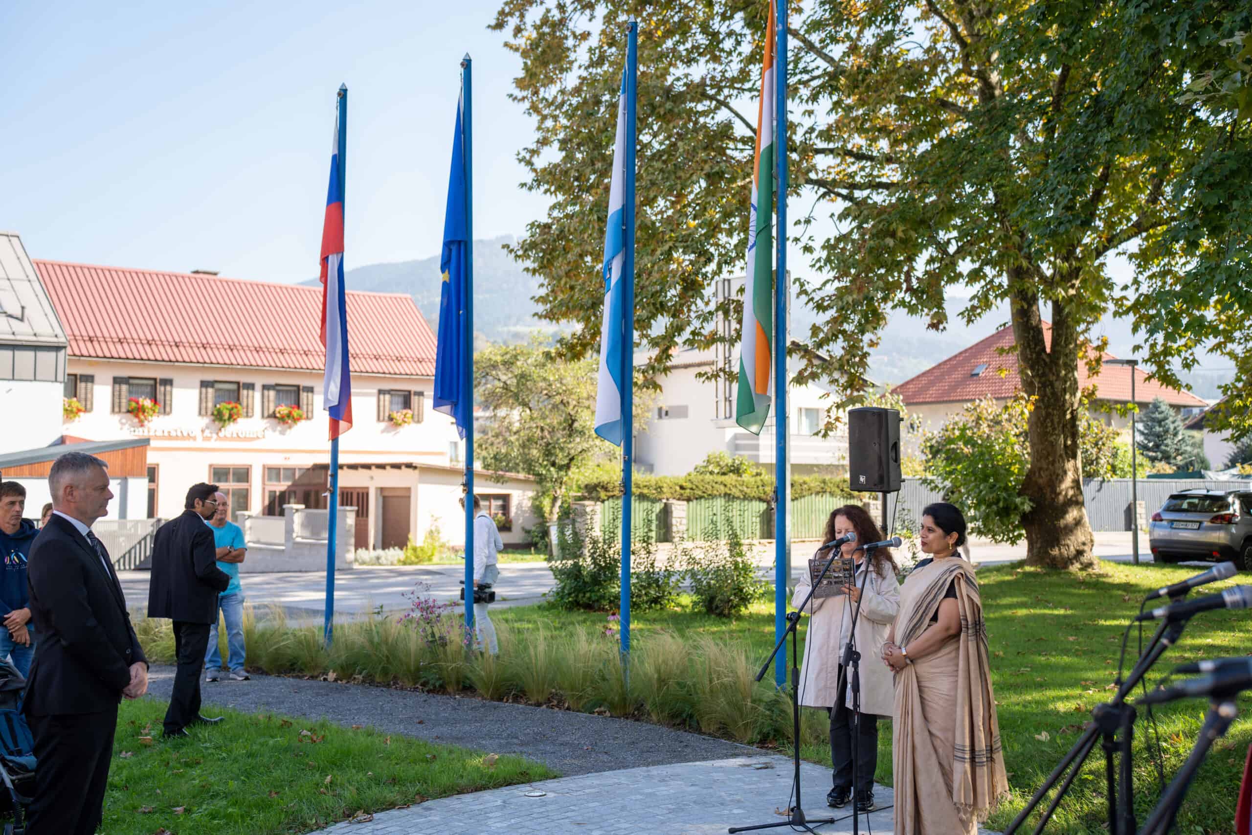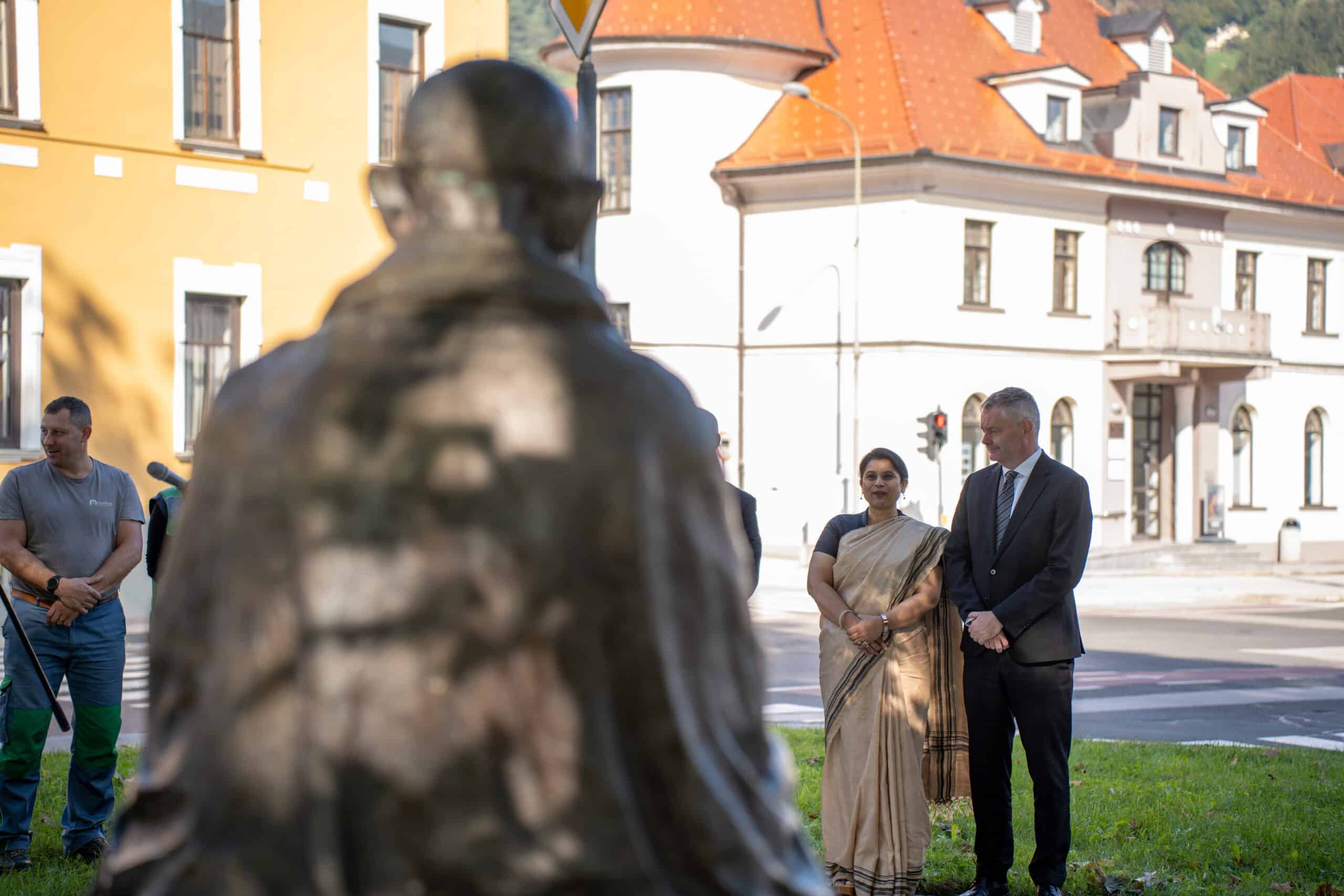 Ob 154. obletnici rojstva indijskega 'očeta naroda' Mahatma Gandhija, ki se je rodil 2. oktobra 1869, sta veleposlanica Indije v Sloveniji, Nj. Eksc. Namrata S. Kumar in župan Mestne občine Slovenj Gradec Tilen Klugler položila venca k spomeniku tega duhovnega in političnega voditelja Indije v Gandhijevem parku.