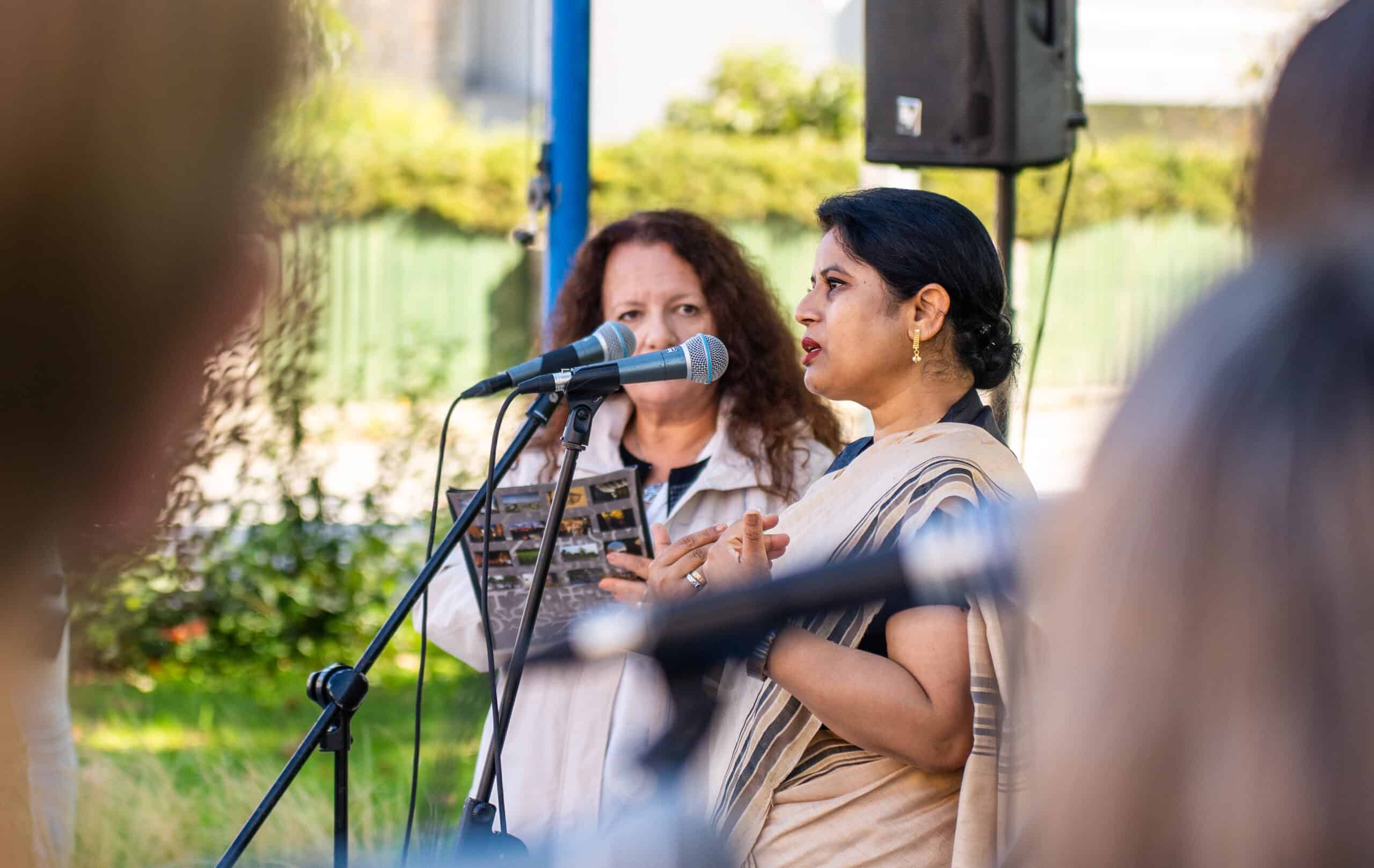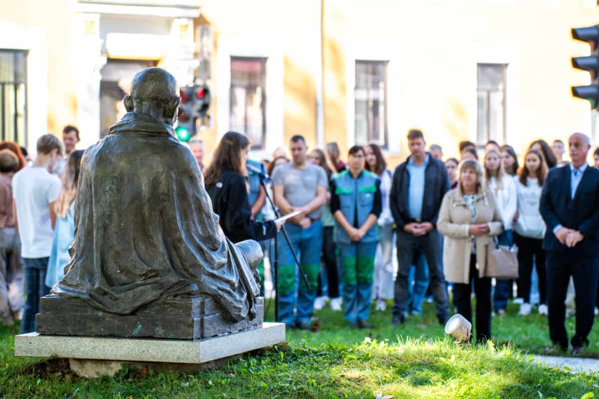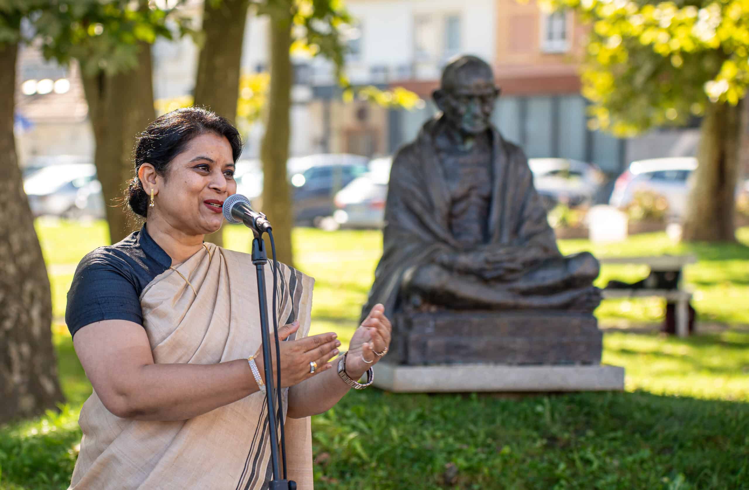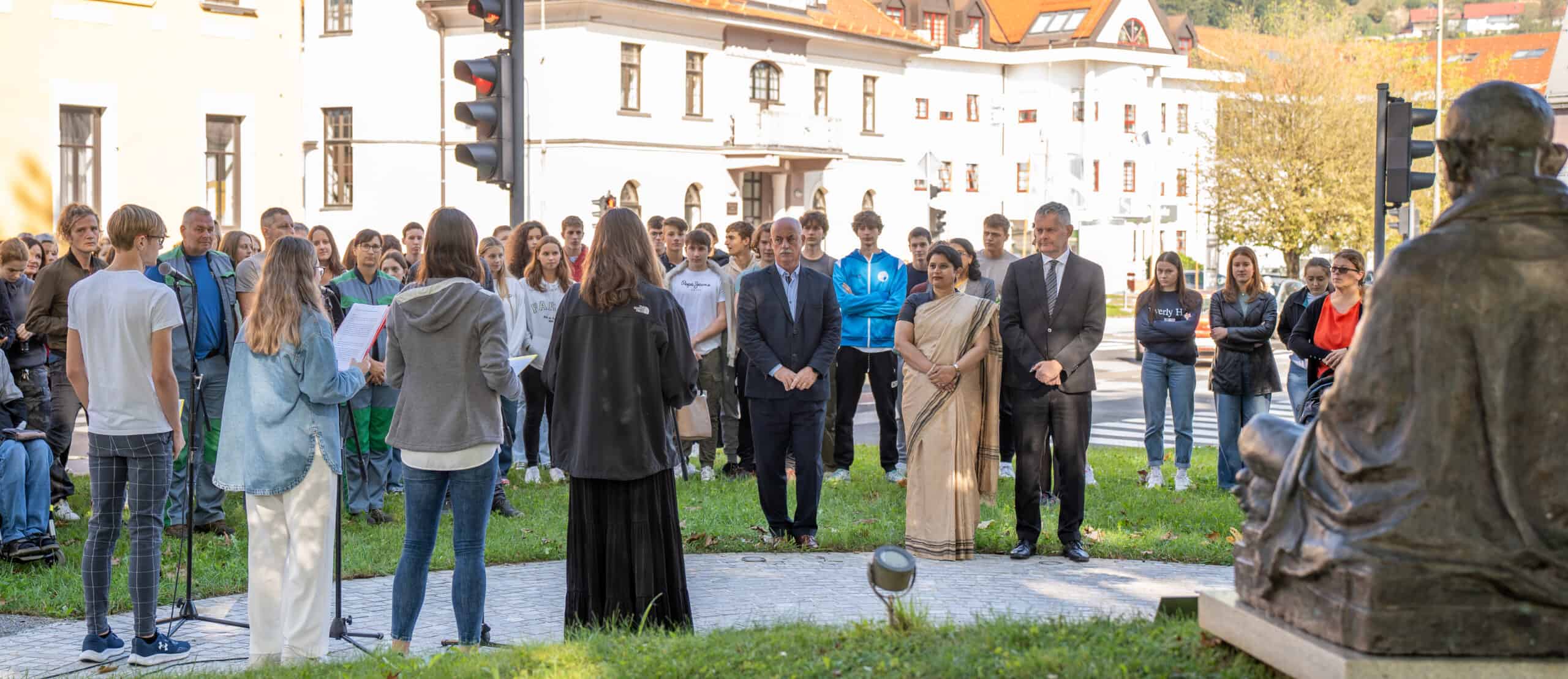 »Pove, da se lahko z nekom ne strinjamo, ampak to ne pomeni, da moramo biti nesramni in sovražni. Spodbuja nas k sprejemanju raznolikosti, spodbujanju dobrega v človeku, medsebojni pomoči in sobivanju. Naše sobivanje bi si lahko predstavljali kot travnik ali šopek rož. Tako različne so si med seboj, a skupaj tako čudovite. Travnik cvetočih rož nam je lahko navdih za mirno in povezano sobivanje. Gandhi je imel rad naravo. Do nje je gojil posebno spoštovanje,« so opozorili dijaki. Indijska veleposlanica v Sloveniji Nj. Eksc. Namrata S. Kumar je v tej luči želela osebno spoznati zaposlene na Komunali, ki skrbijo za okolico Gandhijevega spomenika in se jim zahvaliti za njihovo delo.