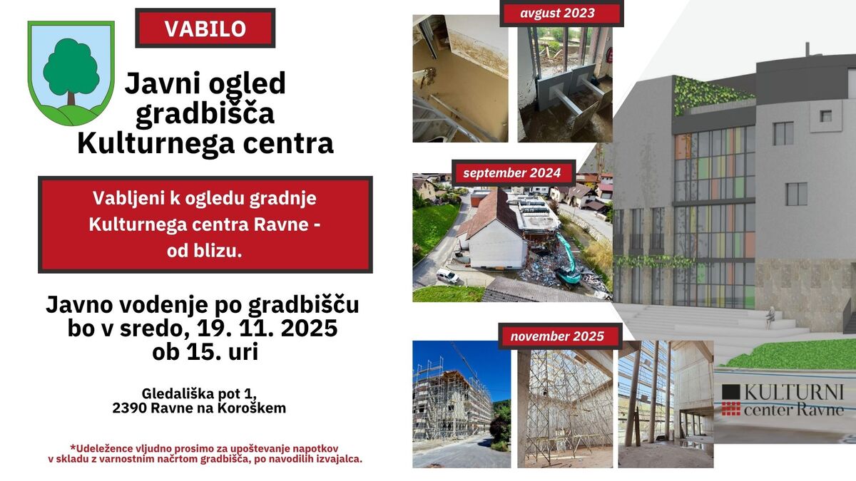 Javno vodenje po gradbišču bo potekalo v sredo, 19. novembra 2025 ob 15. uri, na lokaciji Kulturnega centra Ravne, Gledališka pot 1, 2390 Ravne na Koroškem.