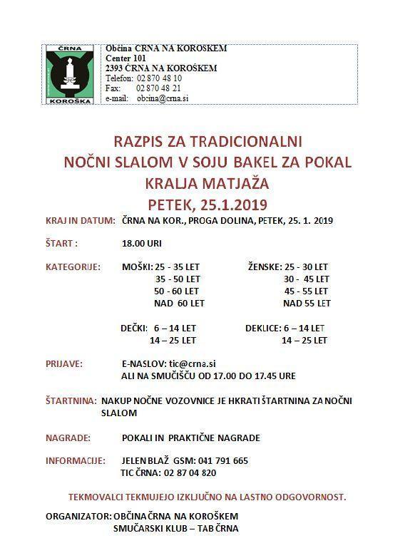 tradicionalni nočni slalom v soju bakel za pokal kralja Matjaža. Naj omenimo, da bodo najhitrejši in najpočasnejši udeleženci slaloma nagrajeni, najboljši trije iz vsake kategorije, pa bodo prejeli kolajno.