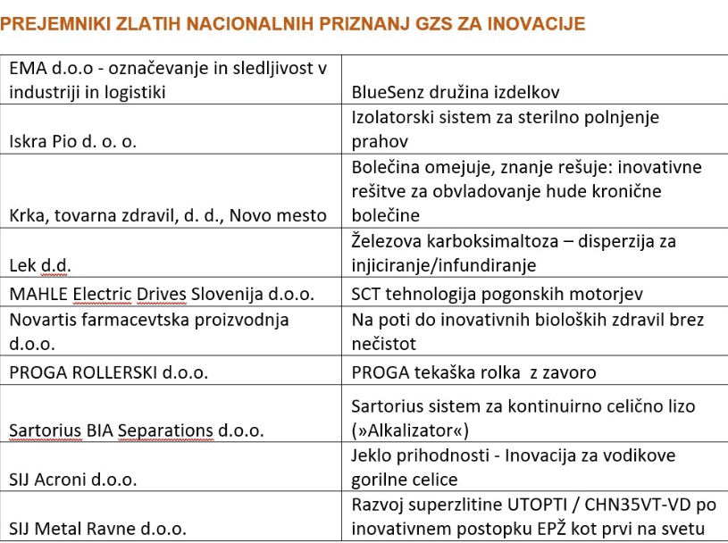 Med prejemniki zlatih priznanj so še podjetja Novartis za inovativno tehnologija ABPP za iskanje kritičnih proteinskih nečistot v bioloških zdravilih, Krka za zdravilo z dabigatranom, ki bistveno izboljšuje možnosti za zdravljenje in preprečevanje nevarnih trombemboličnih stanj, Lek za železovo karboksimaltozo, ki se v obliki disperzije za injiciranje ali infundiranje uporablja za zdravljenje anemije ter Sartorius Bia Separations za sistem za kontinuirno celično lizo.