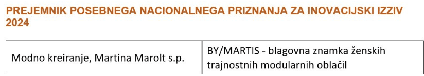 Posebno priznanje za inovacijski izziv je šlo v roke Modnemu kreiranju Martine Marolt za blagovno znamko ženskih trajnostnih modularnih oblačil By Martis.