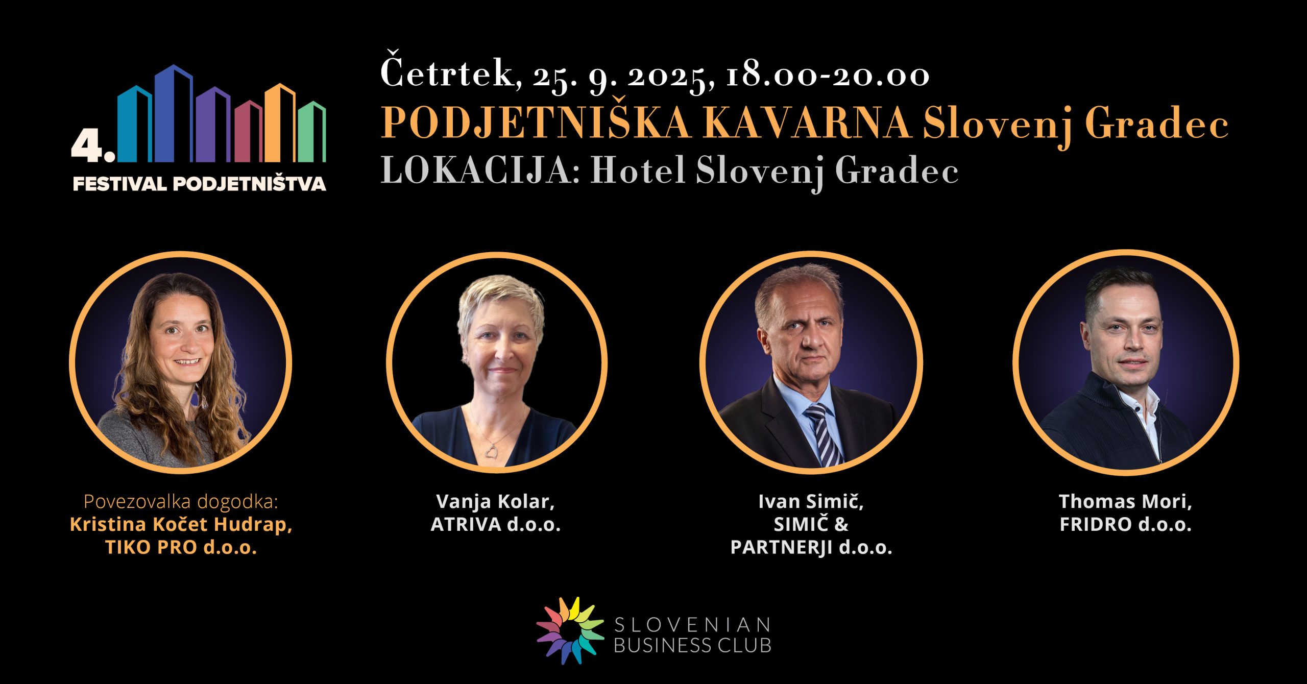 V okviru 4. Festivala podjetništva vas SBC - Klub slovenskih podjetnikov vabi na Podjetniško kavarno, ki je namenjen spodbujanju podjetništva po Sloveniji.
