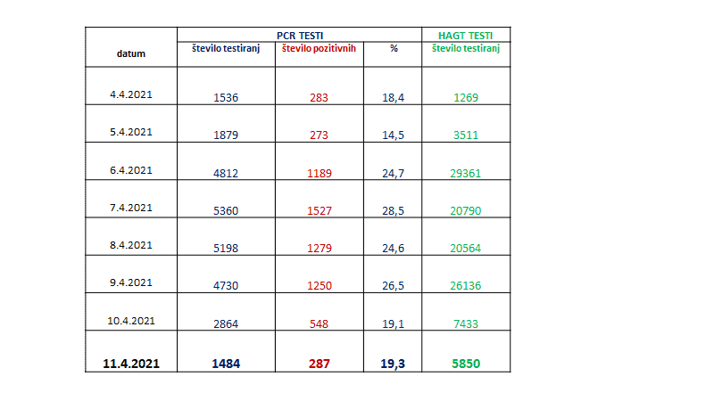 Kot je pojasnil Urbanija je bilo včeraj opravljenih 1484 PCR testiranj in 5850 hitrih antigenskih testov. S PCR testi je bilo včeraj potrjenih 287 novih okužb.