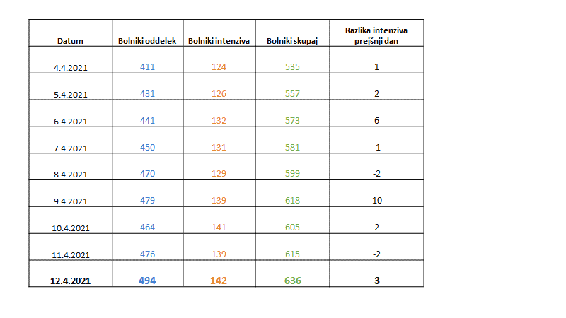V bolnišnicah po državi se danes zdravi 636 pacientov. Na intenzivni terapiji pa se danes zdravi kar 142 pacientov. Tudi včeraj smo zabeležili smrti. Umrlo je 7 oseb s potrjeno okužbo.