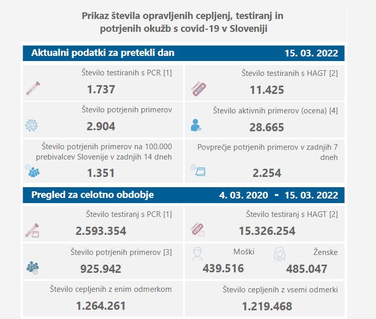 V torek so v Sloveniji ob 1737 PCR-testih in 11.425 hitrih antigenskih testih potrdili 2904 okužbe z novim koronavirusom. Dan prej pa so ob 2113 PCR-testih in 15.884 hitrih antigenskih testih potrdili 4202 okužbi z novim koronavirusom, največ po 16. februarju.