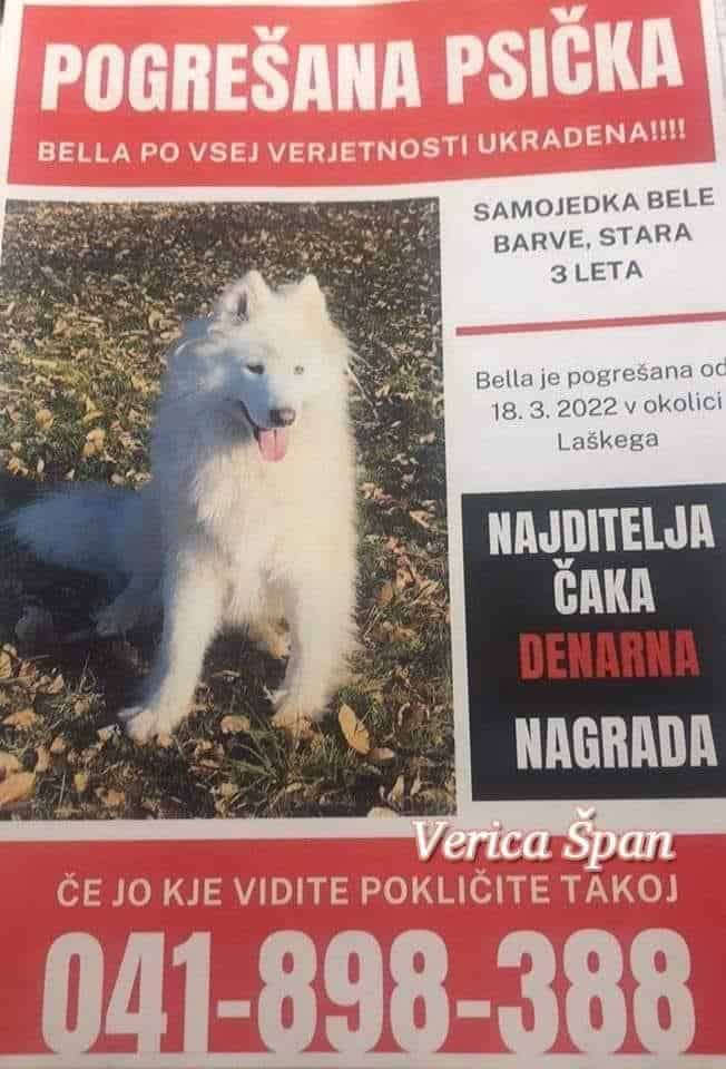 Bella je izginila 18. marca v okolici Laškega. Če ste jo videli, to sporočite na telefonsko številko 041 898 388. Po vsej verjetnosti jo je kdo kupil in niti ne ve, da je ukradena, še dodajajo lastniki, ki sumijo, da je bila ukradena.