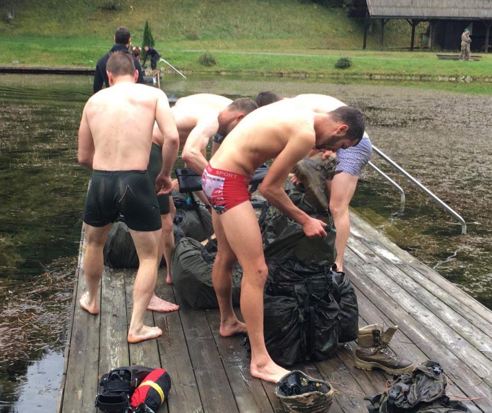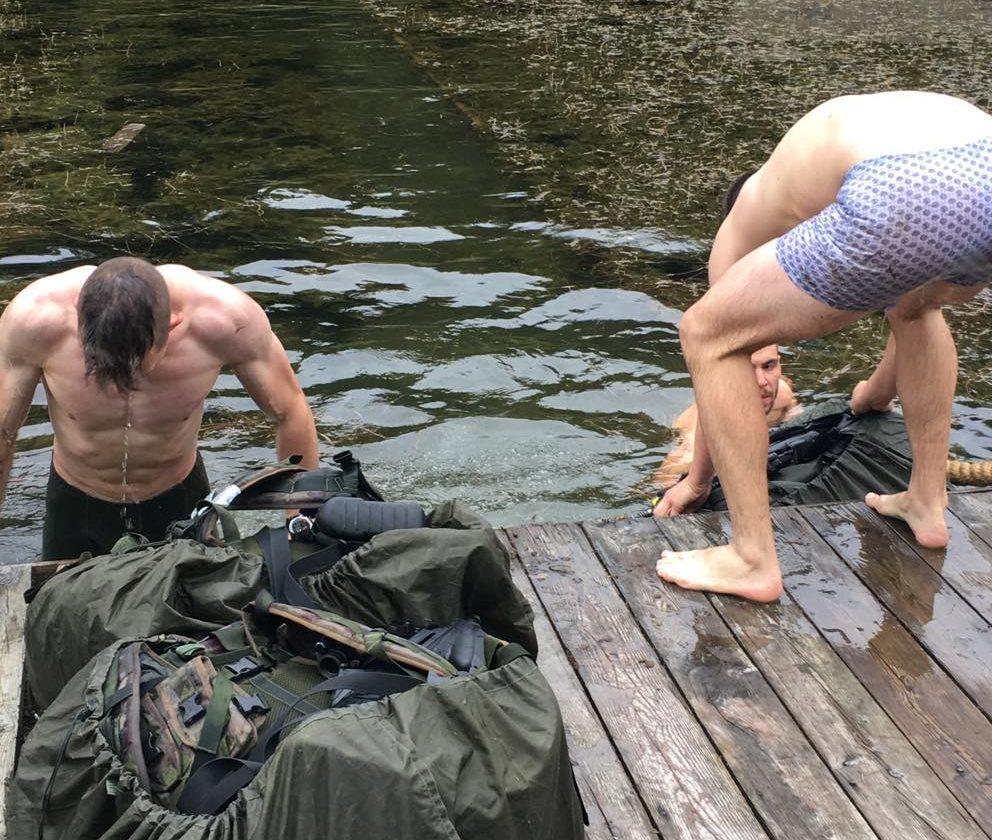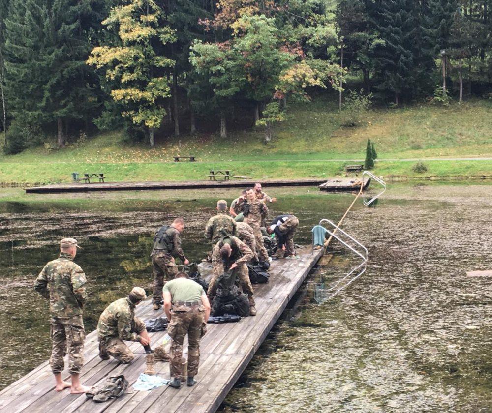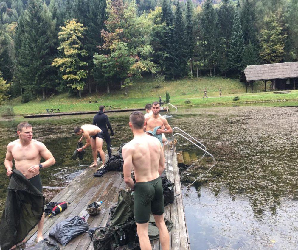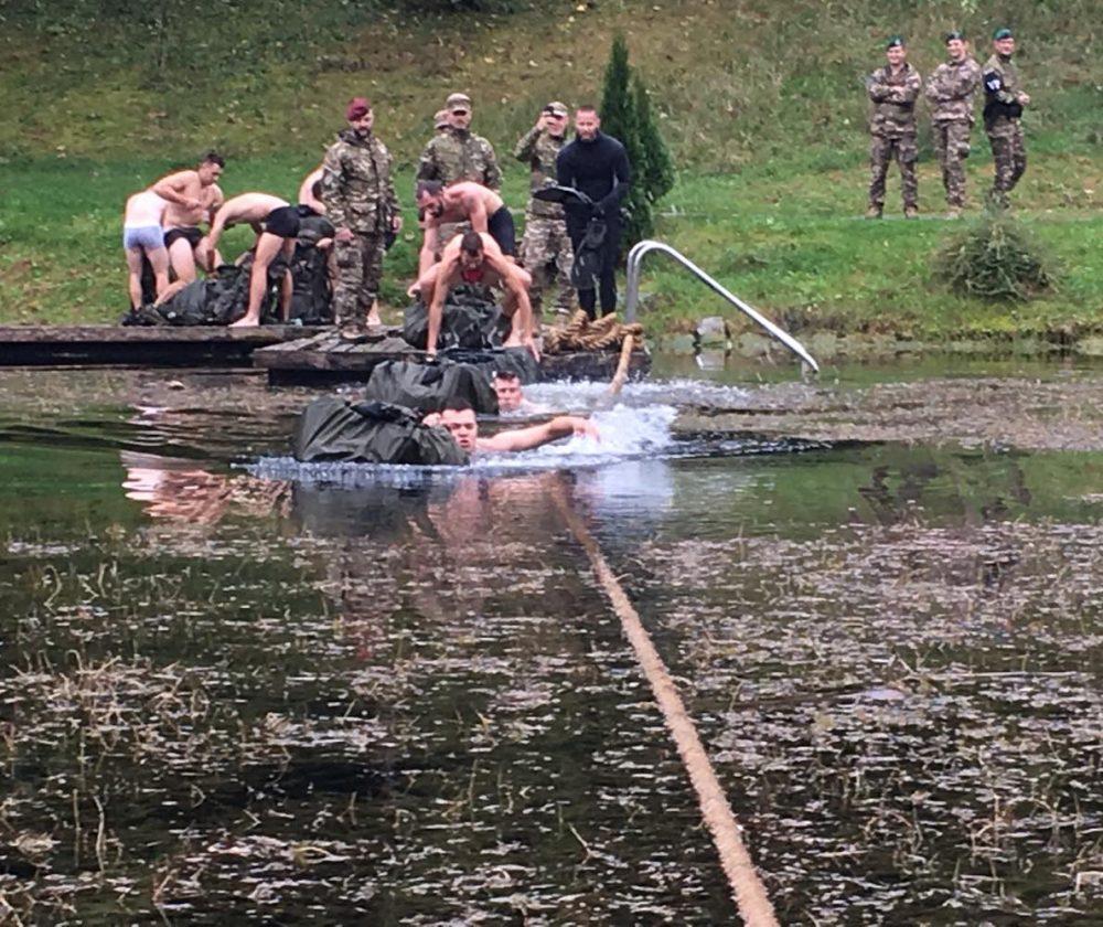 S prihodom k jezeru je vojake čakala nova preizkušnja, tokrat vodna. Z vso pripadajočo opremo so z možnostjo pomoči ob napeljani vrvi morali skočiti v vodo, katere temperatura je prilezla komaj do pičlih 7°C, in uspešno preplavati celotno širino jezera od enega do drugega pomola.