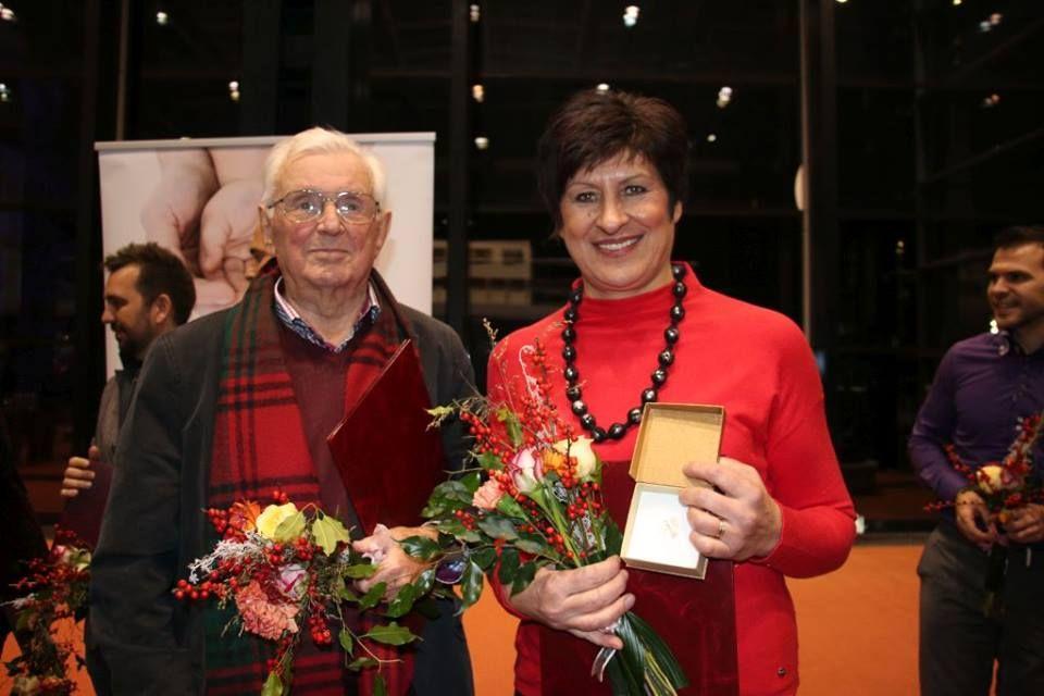 dolgoletni prostovoljec v Koroškem domu starostnikov PE Slovenj Gradec, Lojzek Kralj in Marjana Kamnik, vodja enote Koroškega doma starostnikov v Slovenj Gradcu. Zaključne prireditve akcije Ljudje odprtih rok se je udeležila tudi