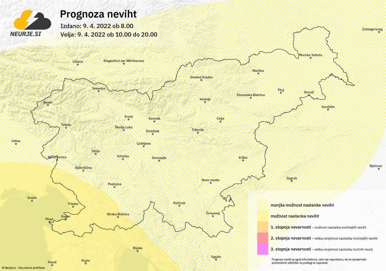 Dopoldne bo severno Slovenijo dosegla izrazita hladna fronta. Padavine se bodo iz smeri Avstrije okrepile in se tekom dneva širile proti jugu in jugozahodu. Ob prihodu hladne fronte bo zapihal okrepljen veter severnih smeri, ki bo izrazitejši v severovzhodni Sloveniji in v višjih legah. Tam lahko v sunkih, na izpostavljenih mestih, doseže hitrosti med 70 in 90 km/h. Na Primorskem bo popoldne in proti večeru zapihala zmerna do močna burja, ki bo na izpostavljenih mestih, v sunkih, dosegala hitrost okoli 100 km/h. Ponekod bodo ob prihodu hladne fronte nastajale tudi nevihte z močnejšimi nalivi in sodro.