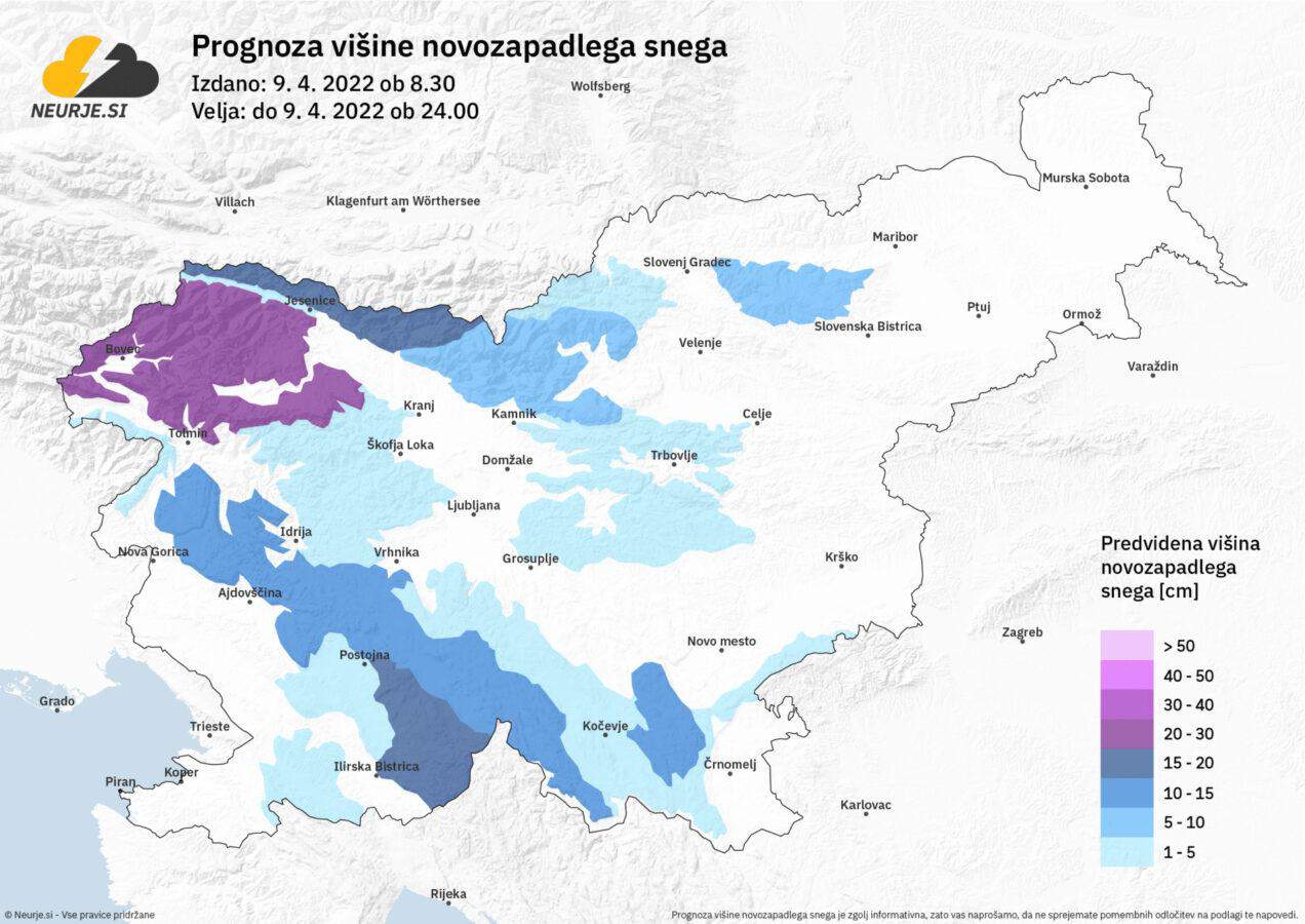 Temperature se bodo pred hladno fronto gibale med 13 in 18°C, po prehodu vremenske fronte pa se bo zelo hitro ohladilo. Popoldne se bodo temperature gibale le med 2 in 7 °C. Meja sneženja se bo spustila do okoli 900 m nadmorske višine, na Notranjskem in Kočevskem pa bo ob močnejših padavinah snežilo do okoli 500 m nadmorske višine. Tam lahko nad okoli 800 m nadmorske višine zapade od 10 do 20 cm novega snega, v goratih predelih severozahodne Slovenije bo nad 1200 m nadmorske višine zapadlo od 20 do 40 cm novega snega. Na Pohorju bo zapadlo do 10 cm snega. Pobeli lahko tudi najnižje ležeče dele na Kočevskem in Notranjskem. Del Primorske avtoceste bo lahko pozno popoldne in zvečer zasnežen.