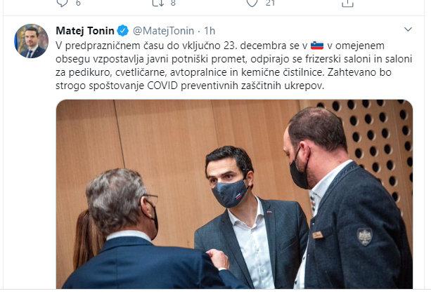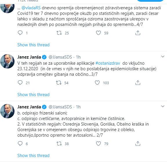 "Vlada RS bo na seji v četrtek obravnavala najnovejše epidemiološke podatke ter v skladu s splošnimi smernicami EU določila režim omejitev v času Božiča in novoletnih praznikov. Vlada poziva vse delodajalske in sindikalne centrale, da aktivno komunicirajo s članstvom in javnostmi v smislu upoštevanja ukrepov. Samo tako se lahko izognemo zaostritvam v času praznikov. Vlada se zahvaljuje zdravstvenim delavcem in vsem, ki v tem zahtevnem času upoštevate omejitvene ukrepe ter varujete zdravje in življenja," je še sporočil preko Twitterja Janez Janša.