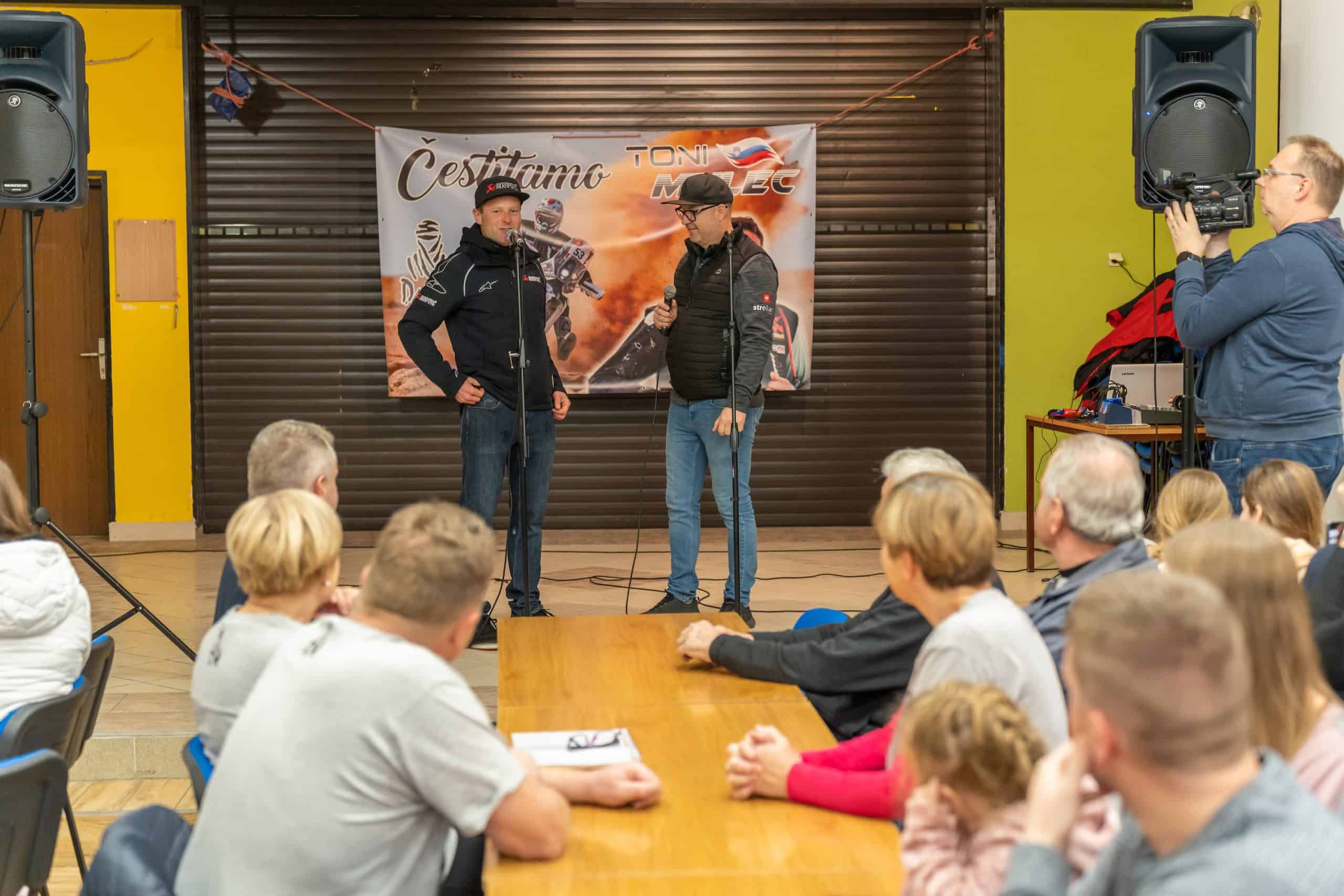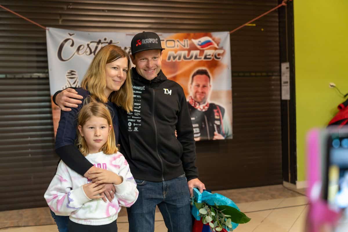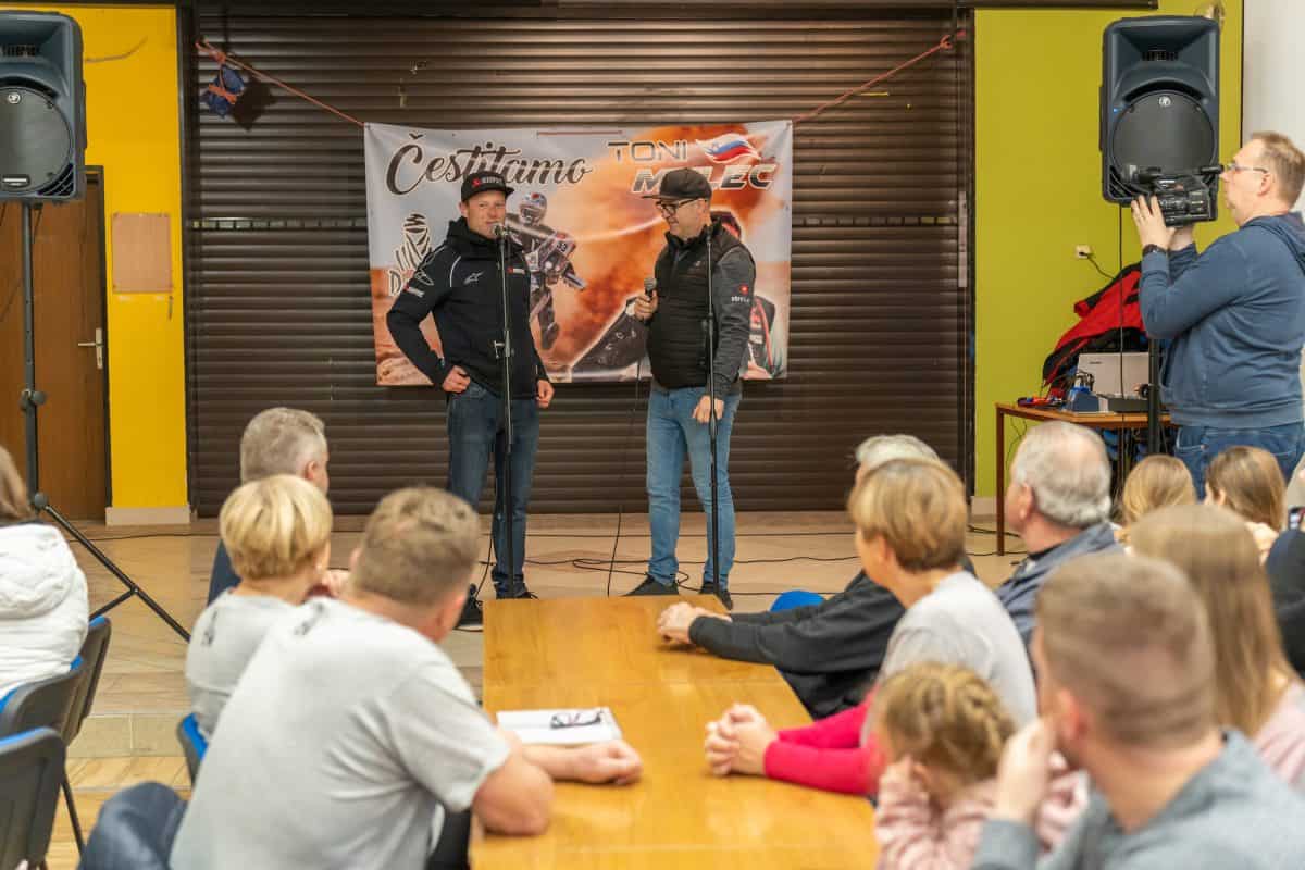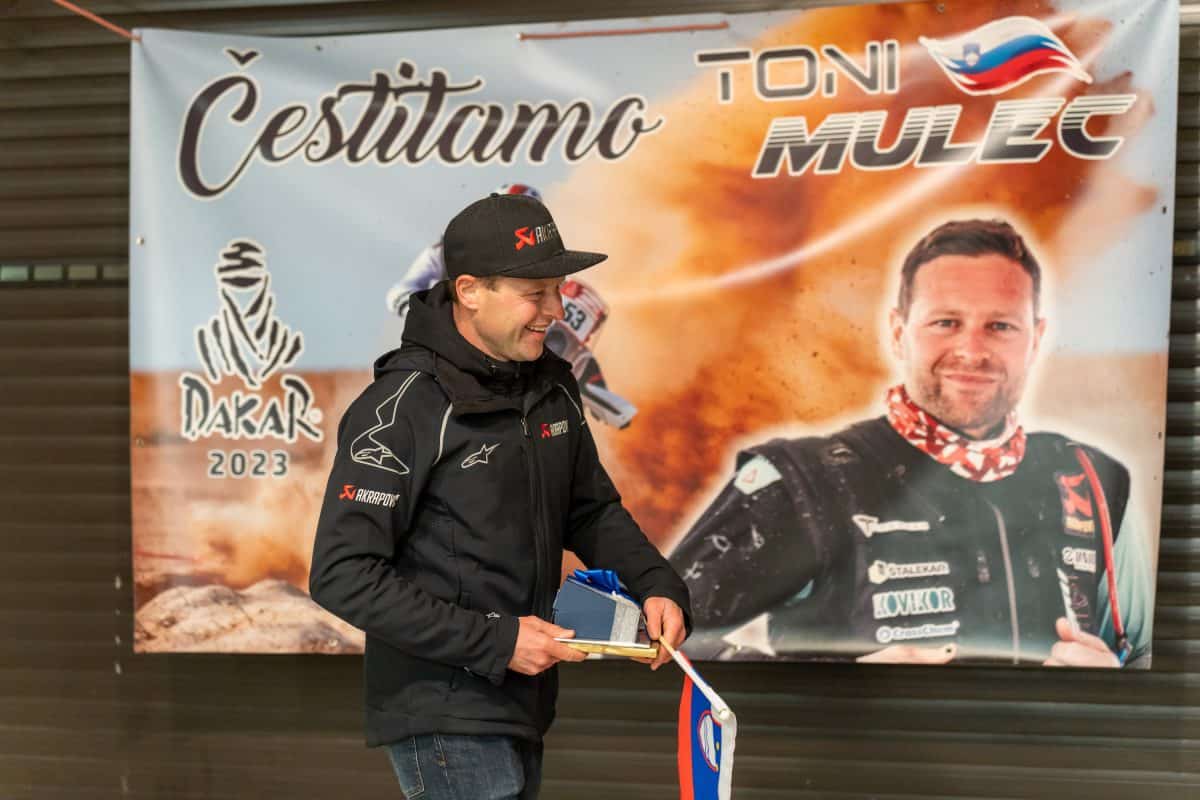 Tonijeva mama Irena pa je v ganljivem govoru povedala: "Dragi naš Tonček. Zdaj smo pa mi napisali in ti bomo prebrali zadnje večerno branje za Dakarsko tekmo. Sam si spoznal, da je Dakar tekma s samim sabo. Tvoja želja za vožnjo z motorjem se je pričela nekega lepega nedeljskega popoldneva na domačem hribu pred hišo. Ko si se usedel na motor in je zabrnelo v tvojih in naših ušesih smo vsi vedeli in najbolj ti, da lahko z motorjem dosežeš veliko in dosanjaš svoje sanje. Vse si postopoma dosegal. V tebi pa je vseskozi tlela želja, da se preizkusiš tudi na Dakarju. To se ti je letos tudi uresničilo. Dnevno si do 15. januarja 2023 bojeval borbo s sabo, z motorjem, s posamezno etapo, s potno knjigo in nas vse iz dneva v dan navduševal. Trpeli smo s tabo, ko so bile težave, okvare, slabo vreme in se navduševali, ko si bil ti srečen in vesel svojega rezultata. Včasih res ne veš kdo je bolj na trnih, ali tisti, ki dirka ali mi domači, ki smo bili vseskozi s tabo. V glavnem Tonček, zdaj smo najbolj srečni, ker te imamo spet doma. Vprašanje seveda - za koliko časa. In, ker si Tonček našo vas, spremenil v Dakarsko vas, naj končam s tvojo mislijo, da ti največ pomeni, da so nate ponosni ljudje, ki smo verjeli vate in te podprli ter navijali vse do tvojega zelo uspešnega cilja na tekmi Dakar. In še končna misel, da je nate pazil angel iz nebes, vsa tvoja družina in sorodniki ter vsaka dobra misel vsakega posameznika in ti sporočamo, da te imamo radi Tonček oz. Toni Mulec z Dakarsko številko 53."