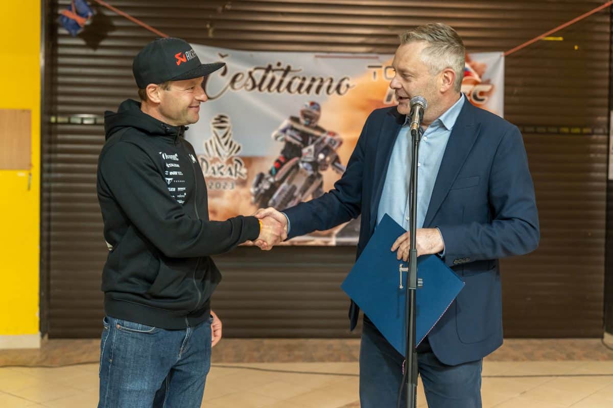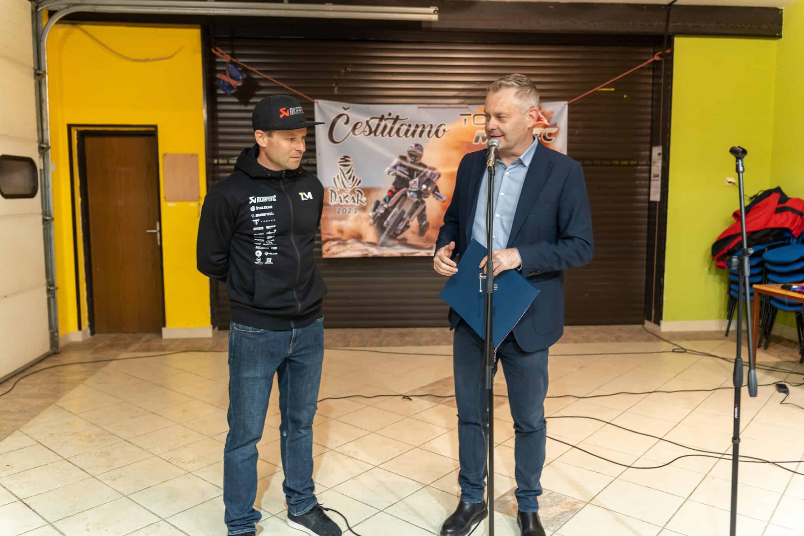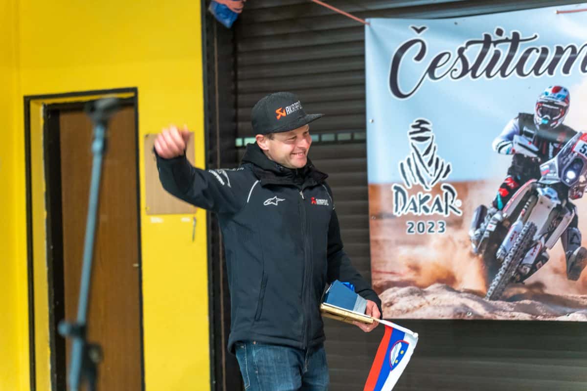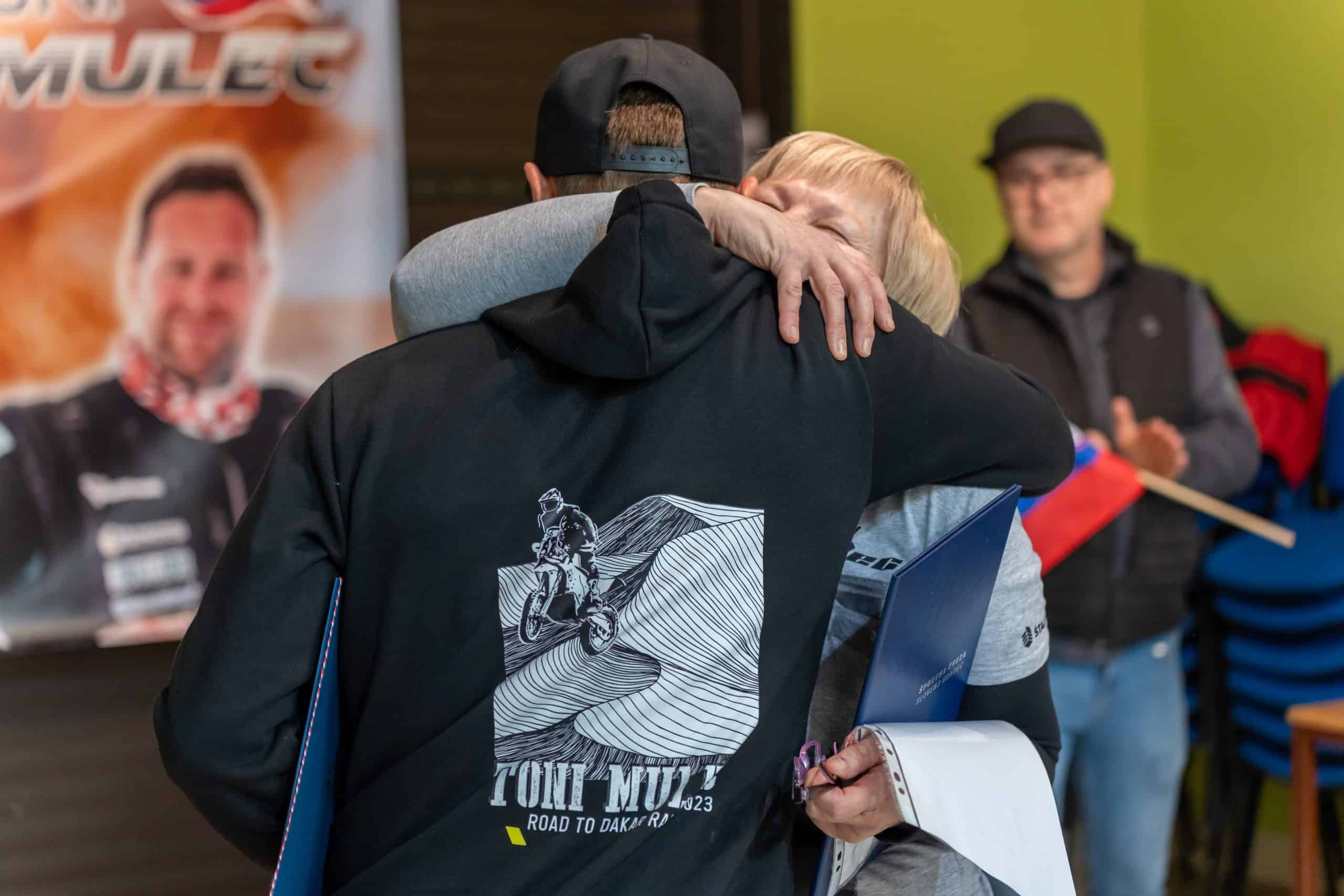 Tonijeva mama Irena pa je v ganljivem govoru povedala: "Dragi naš Tonček. Zdaj smo pa mi napisali in ti bomo prebrali zadnje večerno branje za Dakarsko tekmo. Sam si spoznal, da je Dakar tekma s samim sabo. Tvoja želja za vožnjo z motorjem se je pričela nekega lepega nedeljskega popoldneva na domačem hribu pred hišo. Ko si se usedel na motor in je zabrnelo v tvojih in naših ušesih smo vsi vedeli in najbolj ti, da lahko z motorjem dosežeš veliko in dosanjaš svoje sanje. Vse si postopoma dosegal. V tebi pa je vseskozi tlela želja, da se preizkusiš tudi na Dakarju. To se ti je letos tudi uresničilo. Dnevno si do 15. januarja 2023 bojeval borbo s sabo, z motorjem, s posamezno etapo, s potno knjigo in nas vse iz dneva v dan navduševal. Trpeli smo s tabo, ko so bile težave, okvare, slabo vreme in se navduševali, ko si bil ti srečen in vesel svojega rezultata. Včasih res ne veš kdo je bolj na trnih, ali tisti, ki dirka ali mi domači, ki smo bili vseskozi s tabo. V glavnem Tonček, zdaj smo najbolj srečni, ker te imamo spet doma. Vprašanje seveda - za koliko časa. In, ker si Tonček našo vas, spremenil v Dakarsko vas, naj končam s tvojo mislijo, da ti največ pomeni, da so nate ponosni ljudje, ki smo verjeli vate in te podprli ter navijali vse do tvojega zelo uspešnega cilja na tekmi Dakar. In še končna misel, da je nate pazil angel iz nebes, vsa tvoja družina in sorodniki ter vsaka dobra misel vsakega posameznika in ti sporočamo, da te imamo radi Tonček oz. Toni Mulec z Dakarsko številko 53."