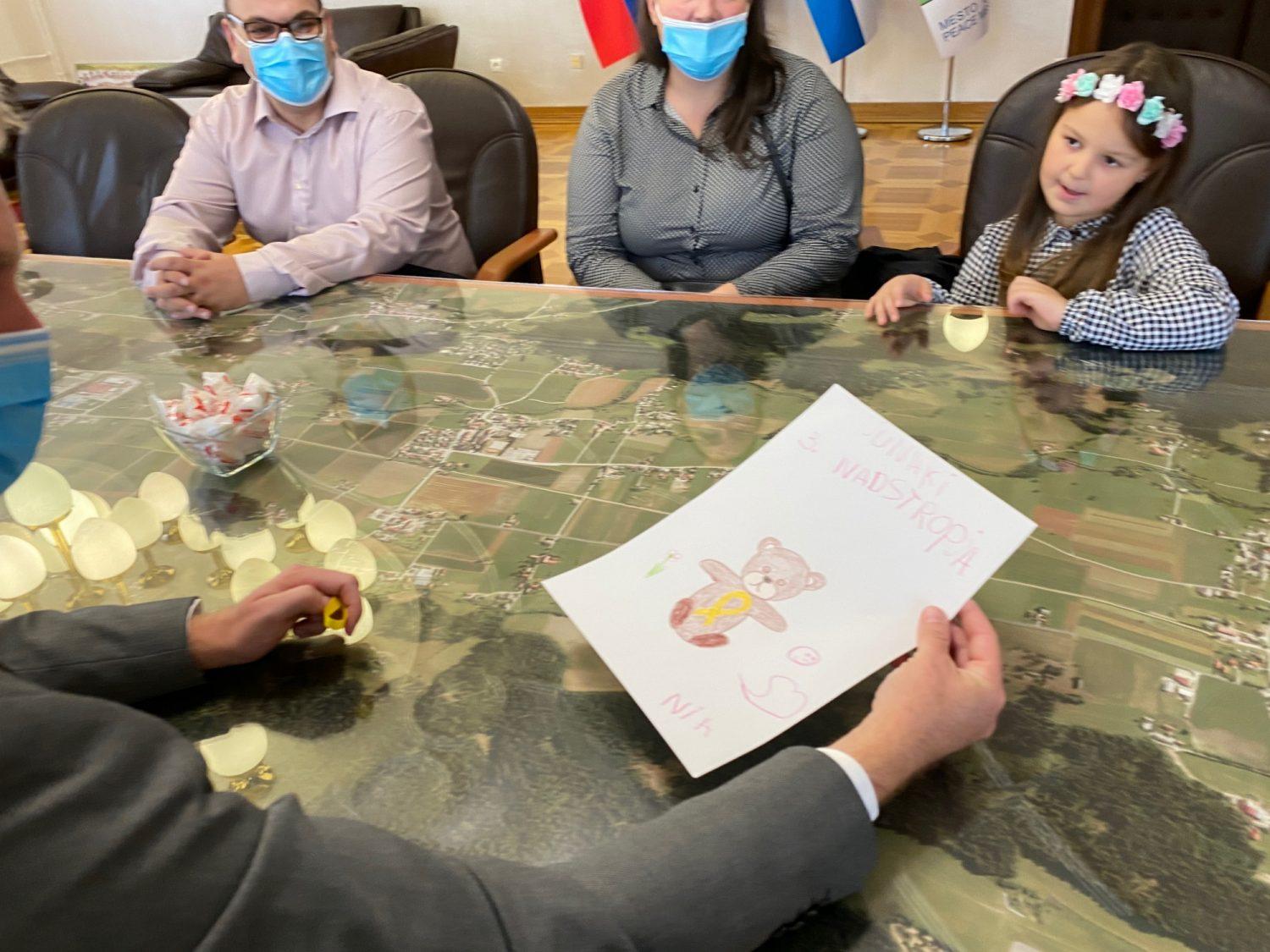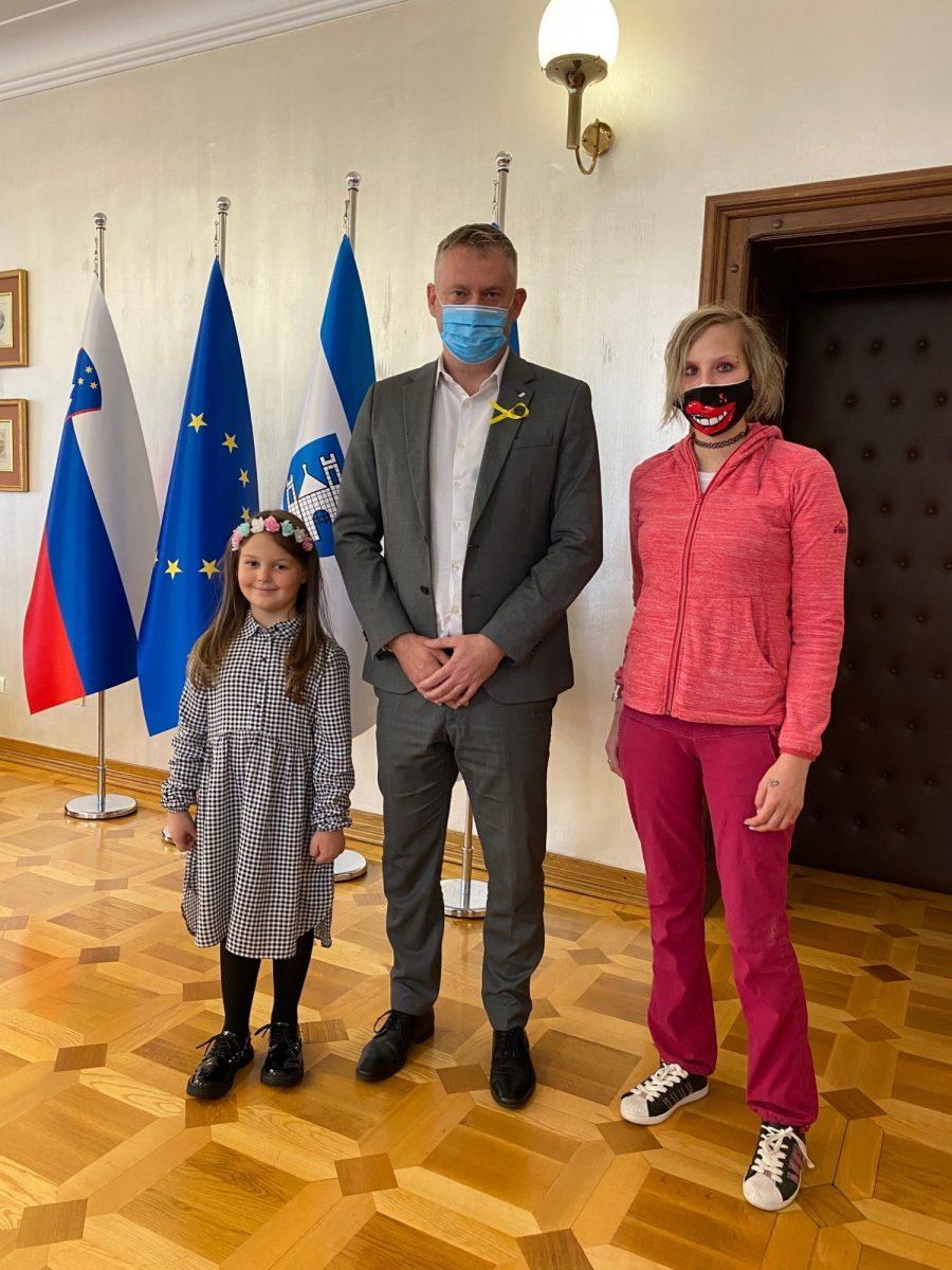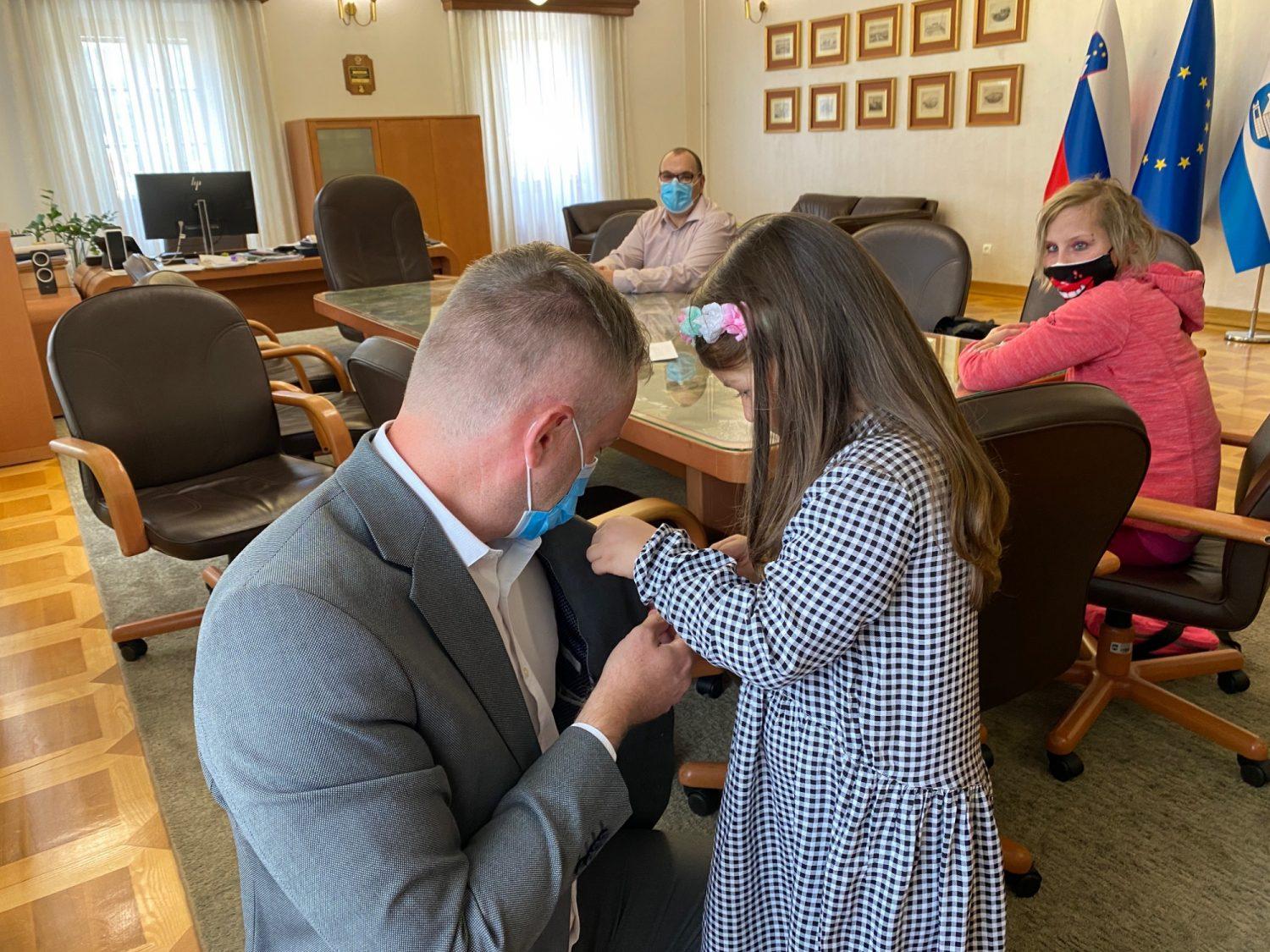 Danes je slovenjgraškega župana v spremstvu staršev obiskala junakinja tretjega nadstropja Nia Hutinec. Ob mednarodnem mesecu ozaveščanja o raku pri otrocih mu je pripela zlato pentljico, simbol raka pri otrocih. Na obisku se jim je pridružila tudi starejša junakinja Maša Jež.