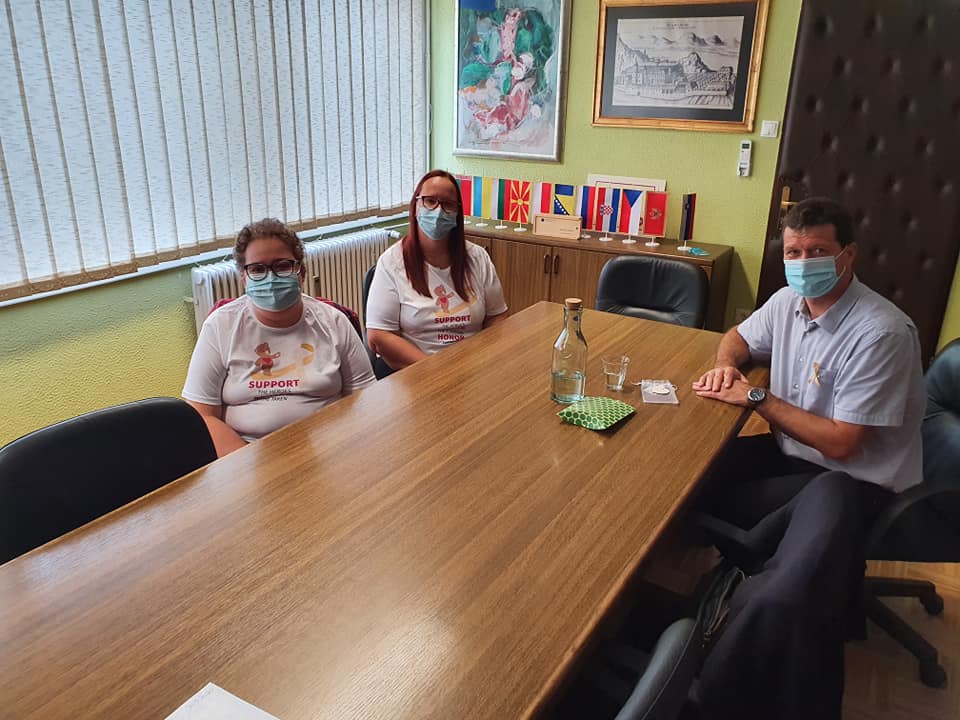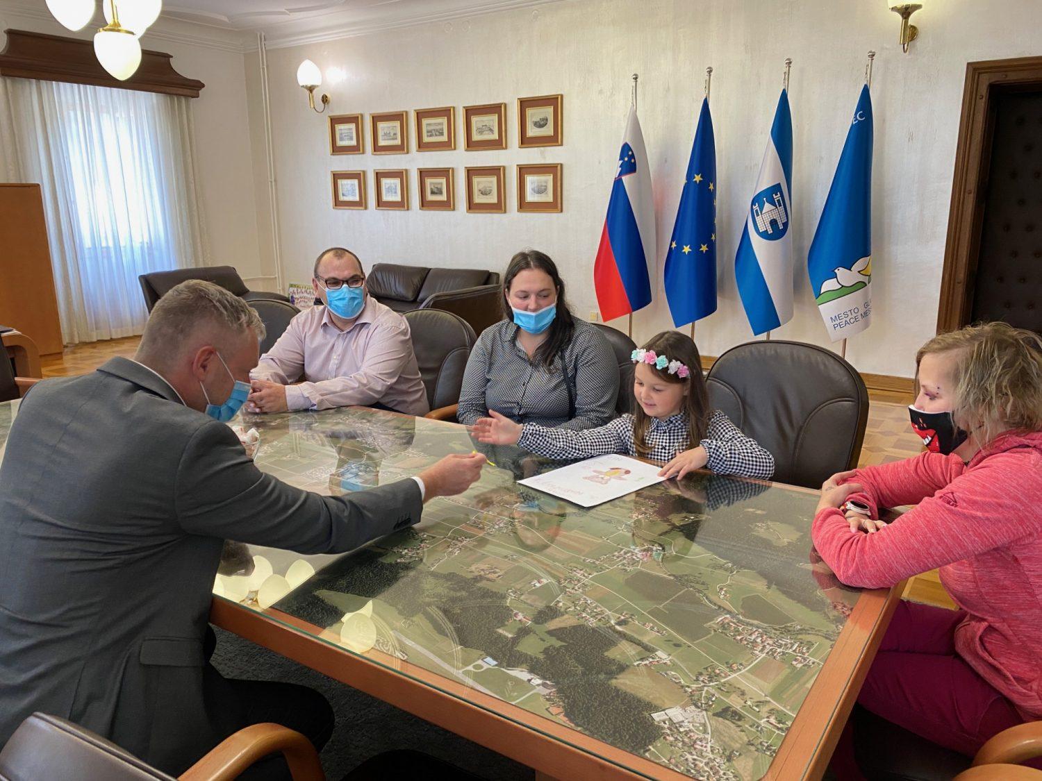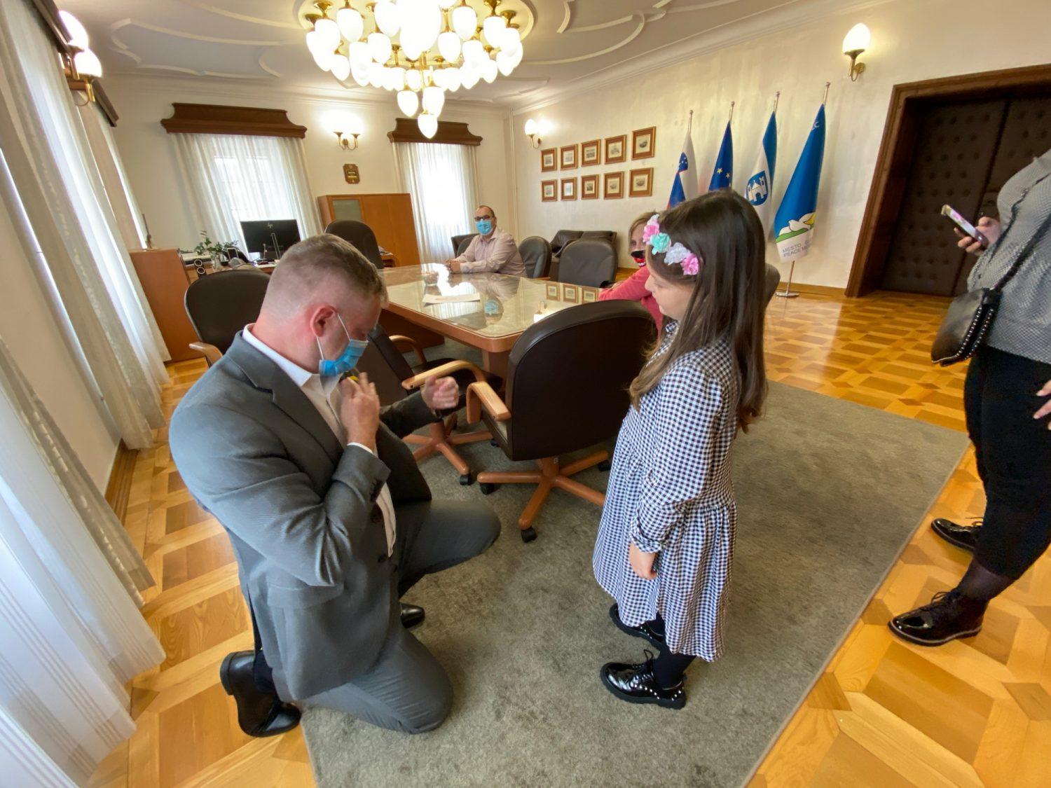 Danes je slovenjgraškega župana v spremstvu staršev obiskala junakinja tretjega nadstropja Nia Hutinec. Ob mednarodnem mesecu ozaveščanja o raku pri otrocih mu je pripela zlato pentljico, simbol raka pri otrocih. Na obisku se jim je pridružila tudi starejša junakinja Maša Jež.
