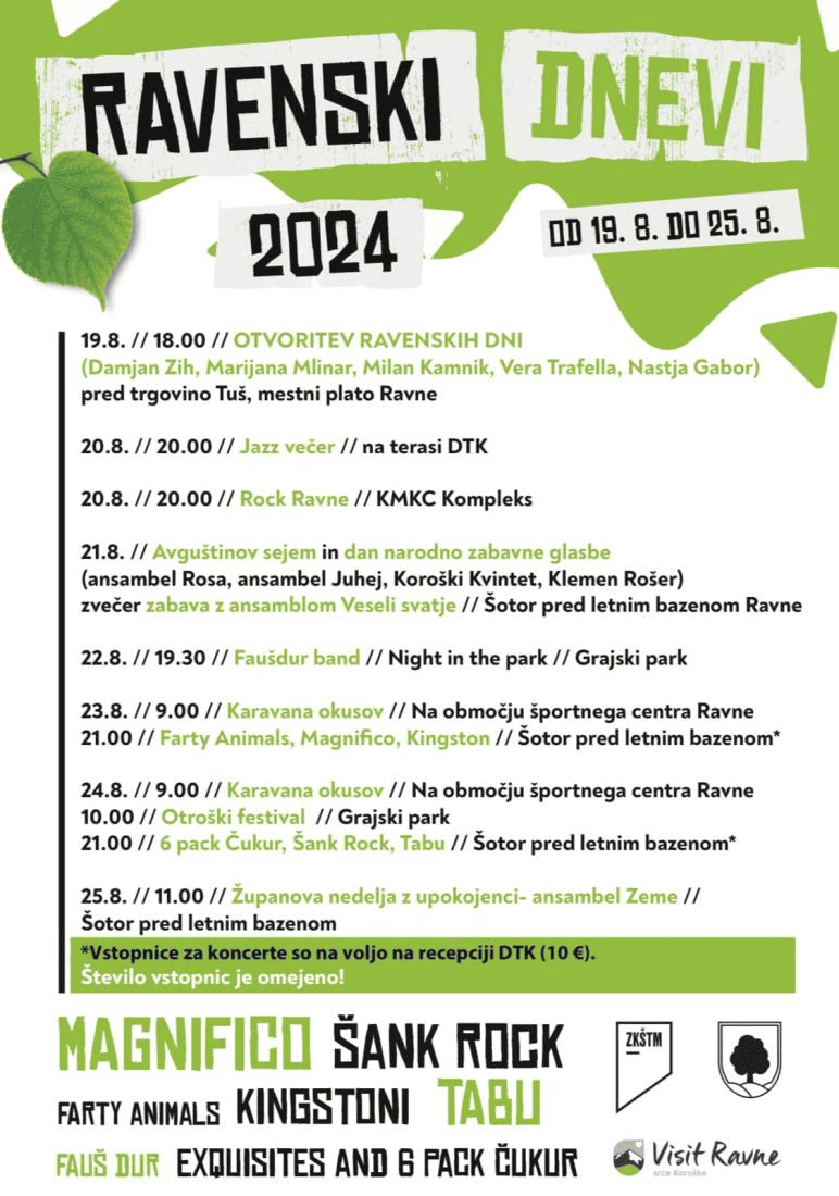 Že tradicionalni Ravenski dnevi, ki vsako leto popestrijo avgustovski čas, ponujajo vse od rocka, narodno-zabavne glasbe, jazza in kulinarike ter pestrega otroškega programa. Ni, da ni! Pričnejo se v ponedeljek, 19. avgusta 2024, ter končajo v nedeljo, 25. avgusta 2024. 7 dni zabave, glasbe, plesa in dobre volje.
