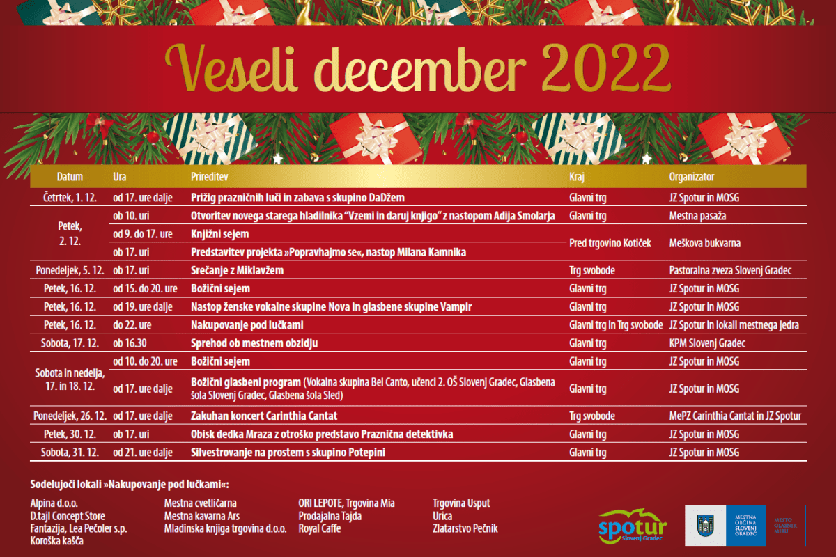 V petek, 16. decembra, ob 15. uri, se pričenja Božični sejem, kjer boste lahko vse do 20. ure, nakupili božična darilca za svoje najdražje, se podružili ob kuhančku in toplem čaju ter začutili utrip najbolj čarobnega meseca v letu. Ob tem pa vas čaka tudi zanimiv spremljevalni program. Ob 19. uri bo za vas nastopila ženska vokalna skupina Nova in glasbena skupina Vampir. Nato se izbiranje daril prestavi v lokale v mestnem jedru, kjer boste lahko nakupovali vse do 22. ure in to "pod lučkami", kar bo zagotovo posebno doživetje. Božični sejem bo potekal tudi v soboto in nedeljo od 10. do 20. ure.