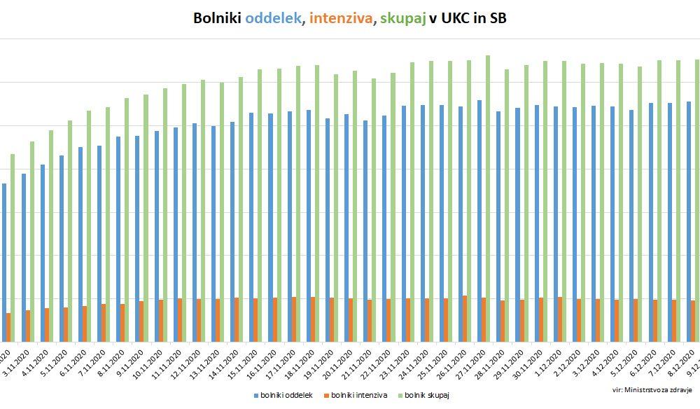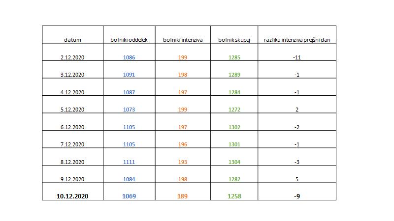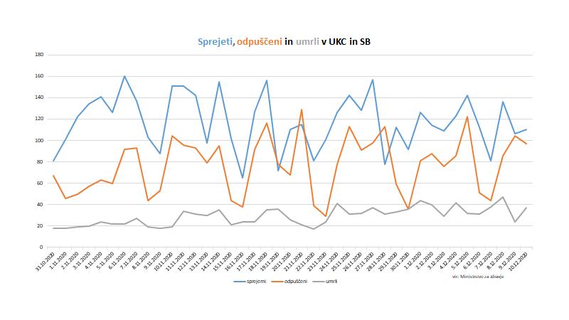 Včerajšnji podatki kažejo, da se je pritisk na bolnišnice morda vendarle rahlo zmanjšal v primerjavi s preteklimi tedni. Včeraj je bolnišnično oskrbo potrebovalo 1258 Covidnih pacientov, kar je 24 manj kot v torek. Intenzivno nego je potrebovalo 189 pacientov, 9 manj kot v torek. Novih sprejemov v bolnišnice je bilo sicer včeraj 110. Skupaj 97 oseb pa je bilo iz bolnišnic odpuščenih. Danes zjutraj je bilo v UKC LJ hospitaliziranih 325 bolnikov oz. 3 manj kot včeraj zjutraj. Od tega jih je bilo na intenzivni terapiji 57, prav tako trije manj kot včeraj, je pojasnil Kacin.