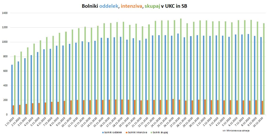 Včerajšnji podatki kažejo, da se je pritisk na bolnišnice morda vendarle rahlo zmanjšal v primerjavi s preteklimi tedni. Včeraj je bolnišnično oskrbo potrebovalo 1258 Covidnih pacientov, kar je 24 manj kot v torek. Intenzivno nego je potrebovalo 189 pacientov, 9 manj kot v torek. Novih sprejemov v bolnišnice je bilo sicer včeraj 110. Skupaj 97 oseb pa je bilo iz bolnišnic odpuščenih. Danes zjutraj je bilo v UKC LJ hospitaliziranih 325 bolnikov oz. 3 manj kot včeraj zjutraj. Od tega jih je bilo na intenzivni terapiji 57, prav tako trije manj kot včeraj, je pojasnil Kacin.