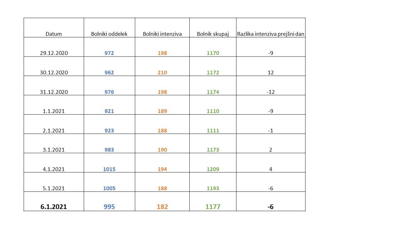 Kot je navedel Kacin, je bilo iz bolnišnic odpuščenih 106 pacientov. Na novo je bilo v bolnišnice sprejetih 114 pacientov. Na intenzivni negi se je zdravilo 182 pacientov, 6 manj kot v ponedeljek. Skupaj je bolnišnično oskrbo potrebovalo 1177, kar je 16 manj kot v ponedeljek.