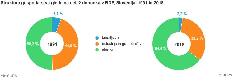 Struktura gospodarstva se je od leta 1991 do danes močno spremenila. Delež dodane vrednosti iz kmetijskih dejavnosti v skupni dodani vrednosti BDP se je zmanjšal za več kot polovico: s 5,7 % (1991) na 2,2 % (2018). Močno se je zmanjšal tudi delež dodane vrednosti iz industrije in gradbeništva: s 44 % (1991) na 33,2 % (2018). Močno pa se je povečal delež dodane vrednosti iz storitev: s 50,3 % (1991) na 64,6 % (2018). Podobne spremembe so se zgodile tudi v drugih državah.