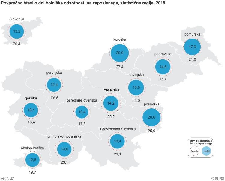 En primer bolniške odsotnosti je v 2018 trajal povprečno 16,5 koledarskega dneva (moški: 13,2 dneva; ženske: 20,4 dneva). V letih od 2005 do 2018 je bila povprečna bolniška odsotnost najdaljša v 2005 (17,2 dneva), najkrajša pa v 2014 (13,7 dneva). Na ravni statističnih regij je bila povprečna bolniška odsotnost v 2018 najdaljša v koroški statistični regiji (23,8 dneva), najkrajša pa v osrednjeslovenski statistični regiji (13,8 dneva).