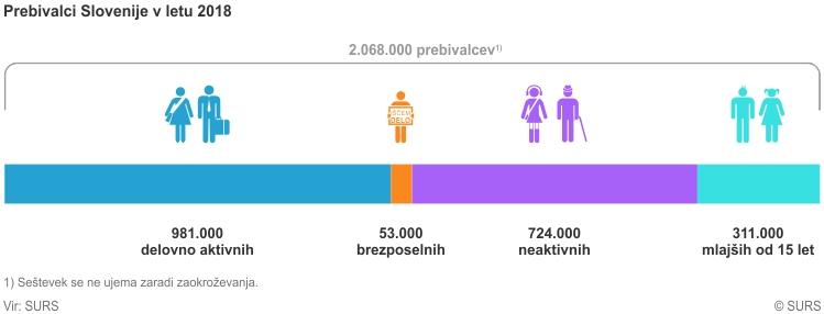 V 2018 je bilo aktivnih 1.034.000 prebivalcev Slovenije; 981.000 teh oseb je bilo delovno aktivnih (tj. zaposlenih in samozaposlenih), 53.000 pa brezposelnih. Stopnja anketne brezposelnosti je bila 5,1-odstotna (med moškimi 4,6-odstotna, med ženskami 5,7-odstotna). Stopnja delovne aktivnosti je bila 55,8-odstotna (med moškimi 61,0-odstotna, med ženskami 50,7-odstotna).