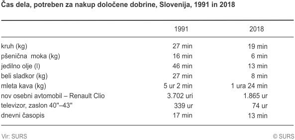 Več nam o nekdanjih in zdajšnjih časih pove primerjava podatkov o tem, koliko časa smo za nakup določene dobrine ali storitve morali delati v 1991 in koliko v 2018. V 2018 smo na primer za kilogram kruha morali delati skoraj tretjino manj časa, za kilogram sladkorja trikrat manj, za kilogram kave štirikrat manj in za nov osebni avtomobil znamke Renault Clio še enkrat manj kot pred sedemindvajsetimi leti.