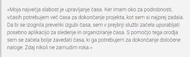 Prav zato je kot nalašč odgovor: »Moja slabost? Hkrati opravljam preveč nalog. Da je to težava, sem prvič opazil pri svoji zadnji službi – bil sem preveč raztresen, reševanje dveh ali treh nalog hkrati pa je uničilo mojo produktivnost. Od takrat pazim na to, kako delam, svoje naloge pa opredelim in razvrstim po prioritetah. Namesto žongliranja s tremi nalogami hkrati poskušam opraviti eno za drugo.«