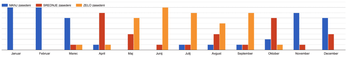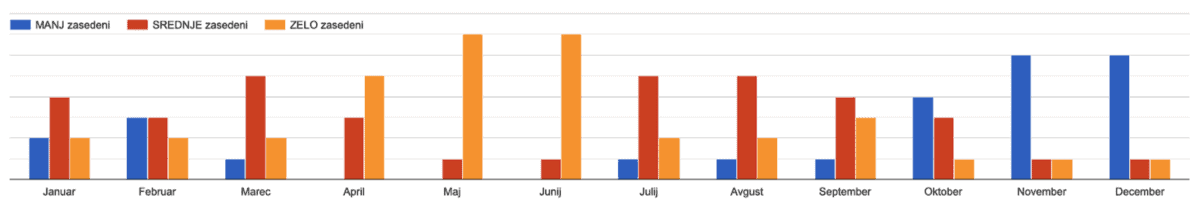 Poročne ponudnike so vprašali, kdaj so najbolj zasedeni in kot je to lepo vidno na grafu 2, so poročni izvajalci najbolj zasedeni od maja do septembra. Tudi to lahko vpliva na ceno poroke, zato je vredno razmisliti, da si poroko omislite denimo marca ali aprila.