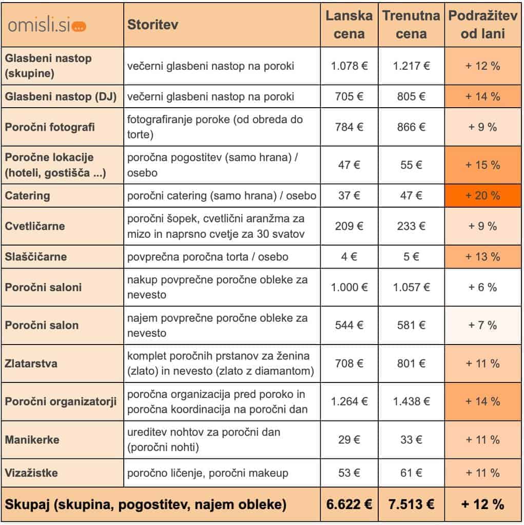 - 4 od 5 poročnih ponudnikov so v primerjavi z lanskim letom dvignili cene za povprečno 12%.