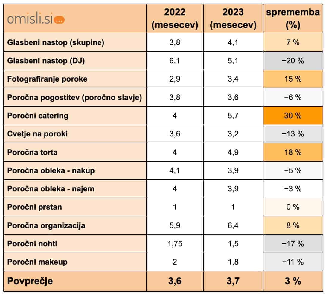 - Poročne ponudnike je v povprečju dobro rezervirati vsaj 3,7 mesecev vnaprej (najdaljša čakalna vrsta, ki znaša kar 6,4 mesecev, je pri poročnih organizatorkah).
