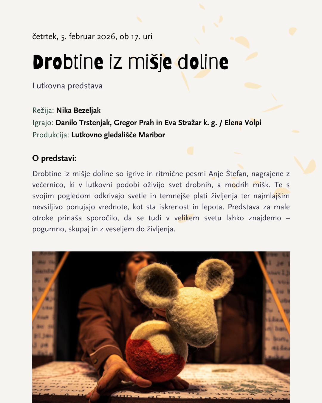 - Drobtine iz Mišje doline – Lutkovno gledališče Maribor – 5. februar 2026;