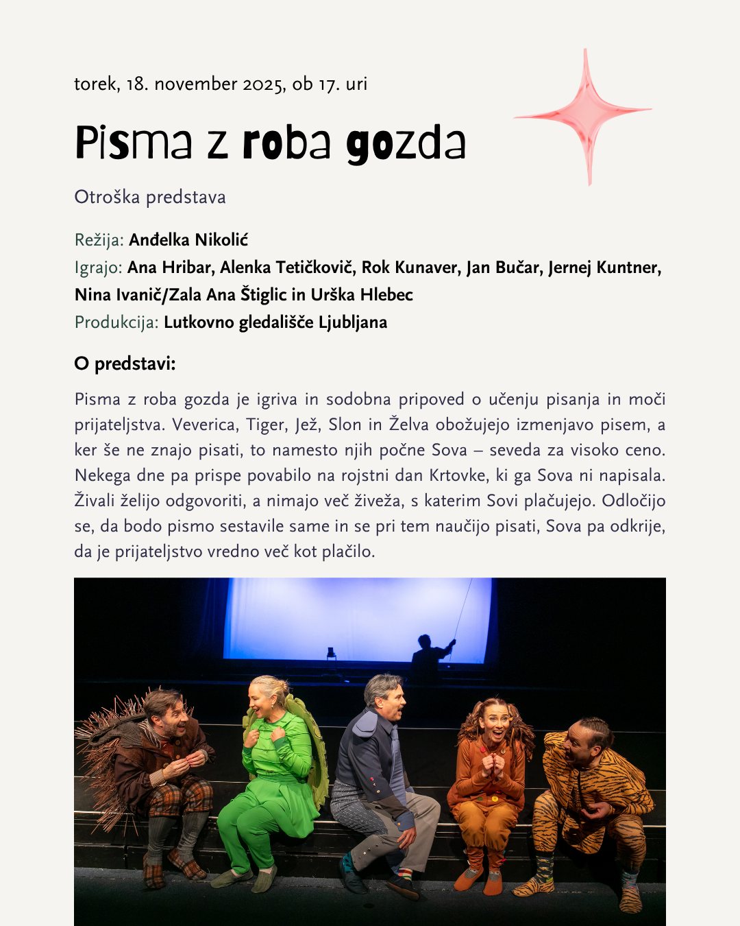 - Pisma z roba gozda – Lutkovno gledališče Ljubljana – 18. november 2025;