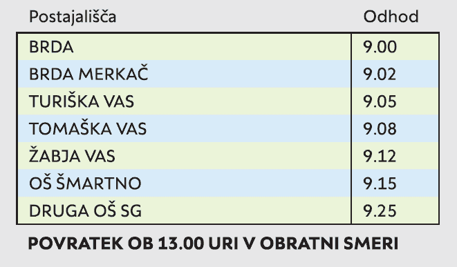 RELACIJA: BRDA – MRKAČ – TURIŠKA VAS – TOMAŠKA VAS – ŽABJA VAS – OŠ ŠMARTNO – DRUGA OŠ (upoštevati je potrebno obvoz zaradi zapore ceste)